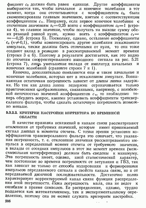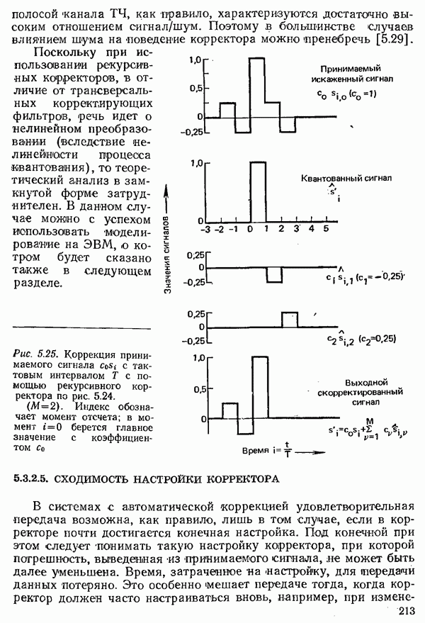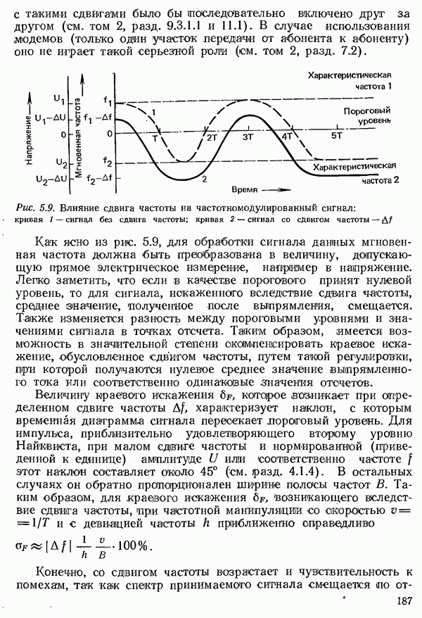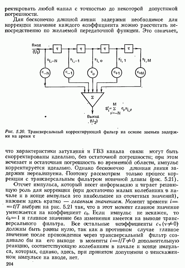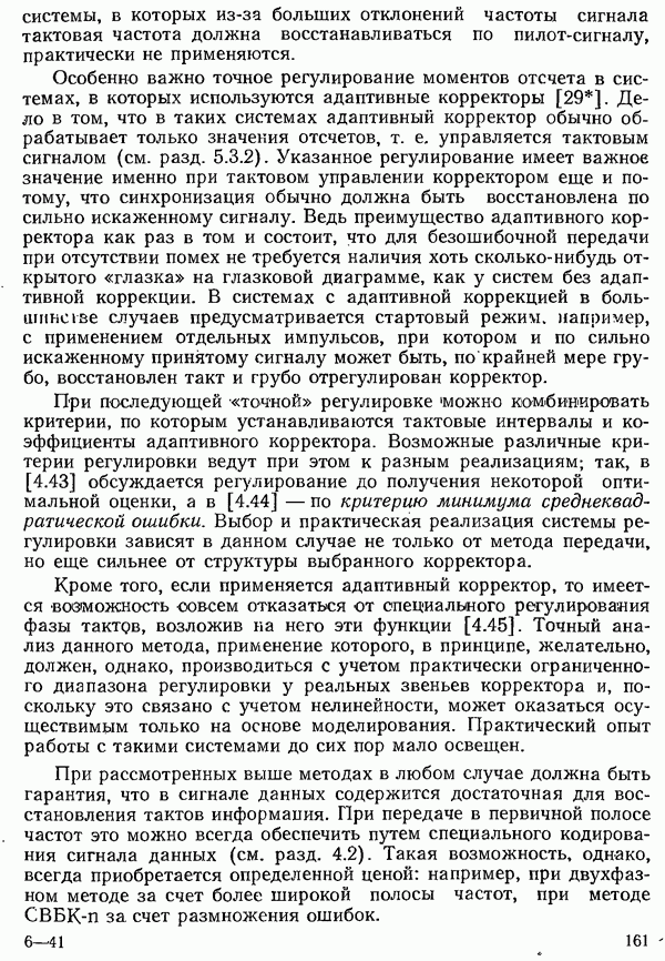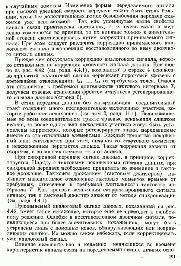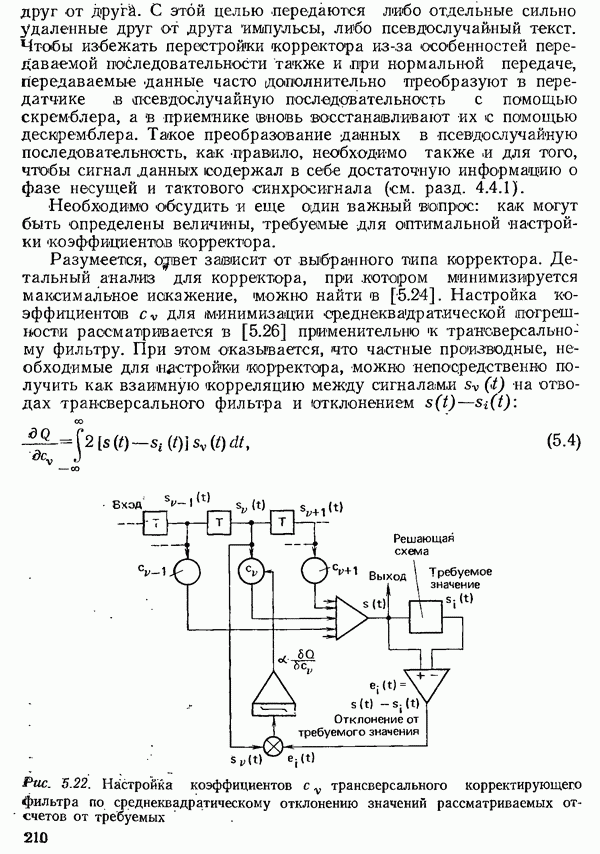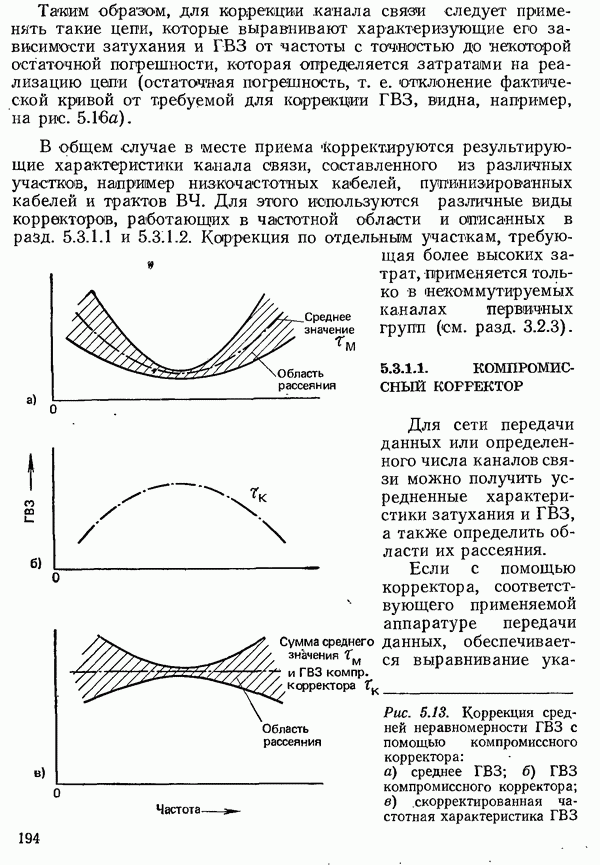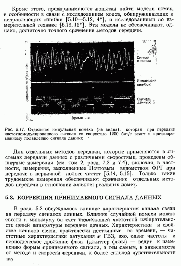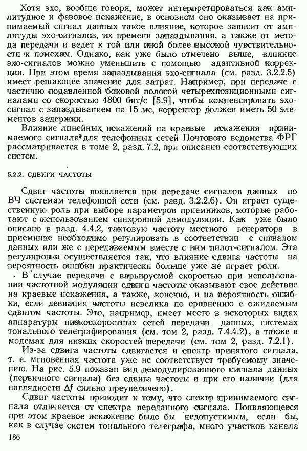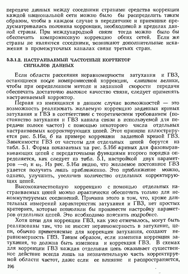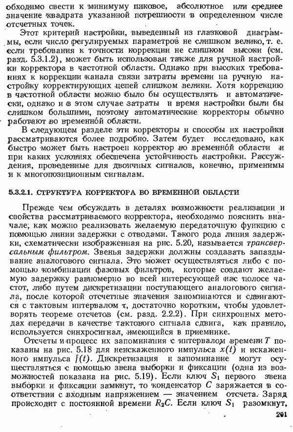 5.3. КОРРЕКЦИЯ ПРИНИМАЕМОГО СИГНАЛА ДАННЫХВ разд. 5.2 обсуждалось влияние характеристик канала связи на передачу сигналов данных. Влияние случайной помехи можно свести к минимуму в а счет надлежащей частотной избирательности цепей аппаратуры передачи данных. Характеристики и свойства каналов связи, практически постоянные во времени, — частотные характеристики затухания и ГВЗ, эхо, сдвиг частоты и периодическое дрожание фазы (джиттер фазы) — ведут к изменению формы принимаемого сигнала, а тем самым, в зависимости от метода и скорости передачи, к более сильной чувствительности к случайным помехам. Изменение формы передаваемого сигнала при высокой удельной скорости передачи может быть столь большим, что и без дополнительных помех безошибочная передача окажется уже невозможной. Так как упомянутые выше свойства канала связи практически постоянны, т. е. очень мало и медленно изменяются во времени, то их влияние можно в значительной степени скомпенсировать путем коррекции принимаемого сигнала. При этом следует различать коррекцию принимаемого аналогового сигнала и коррекцию восстановленного по нему двоичного сигнала данных. Прежде чем обсуждать коррекцию аналогового сигнала, коротко остановимся на коррекции двоичного сигнала данных. Как видно из рис. 4.42 (ем. разд. 4.4.1), показанный в строке 4 искаженно принятый аналоговый сигнал пересекает пороговый уровень с временными отклонениями В сетях передачи данных без синхронизации соединительный тракт содержит много последовательно включенных участков, которые работают асинхронно (см. том 2, разд. 11.1). Если ожидаемые во всем соединительном тракте краевые искажения слишком велики, то после одного или нескольких участков могут быть установлены корректоры, которые регенерируют знаки, передаваемые вместе со стартстопными элементами. Каждый принятый искаженный знак считывается при этом, начиная со стартового элемента, и неискаженным передается дальше. Такая коррекция зависит от скорости, а во многих случаях — и от знаков. При синхронной передаче сигнал данных, в принципе, корректируется. Наряду с тактовыми искажениями сигнала данных, при синхронной передаче необходимо принимать во внимание и тактовое дрожание. Тактовым дрожанием (тактовым джиттером) называют максимальное отклонение тактовых моментов времени от требуемых, отнесенное к требуемой длительности тактового интервала Принимаемый аналоговый сигнал данных, показанный на рис. 4.42, имеет такое искажение, которое еще не приводит к ошибочному решению. Ошибки в восстановленном двоичном сигнале, появляющиеся при более значительных искажениях, могут быть устранены лишь с помощью кодов, обнаруживающих или иоправляющих ошибки. Их можно также избежать, если корректировать уже аналоговый сигнал. Влияние незначительно и медленно меняющихся во времени характеристик канала связи на передаваемый сигнал данных основано, главным образом, на изменении с частотой затухания и ГВЗ. При этом учитывается также и эхо, которое согласно разд. 3.2.2.5 проявляется в периодических колебаниях частотных характеристик затухания и ГВЗ. В двух последующих разделах будут рассмотрены способы уменьшения влияния частотных характеристик канала за счет коррекции в частотной и временной областях. Методы уменьшения влияния периодического дрожания ф