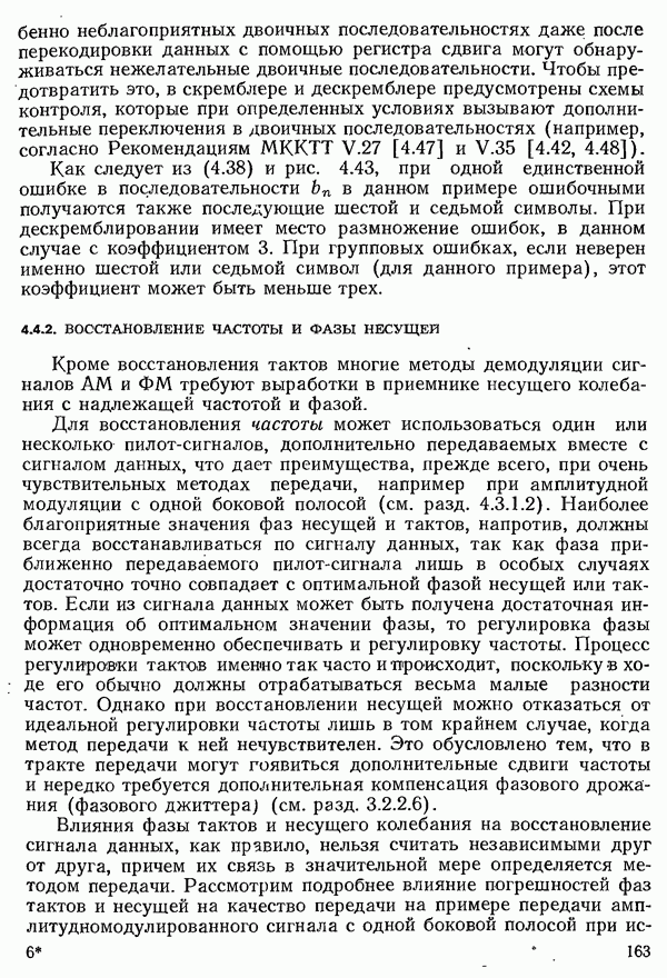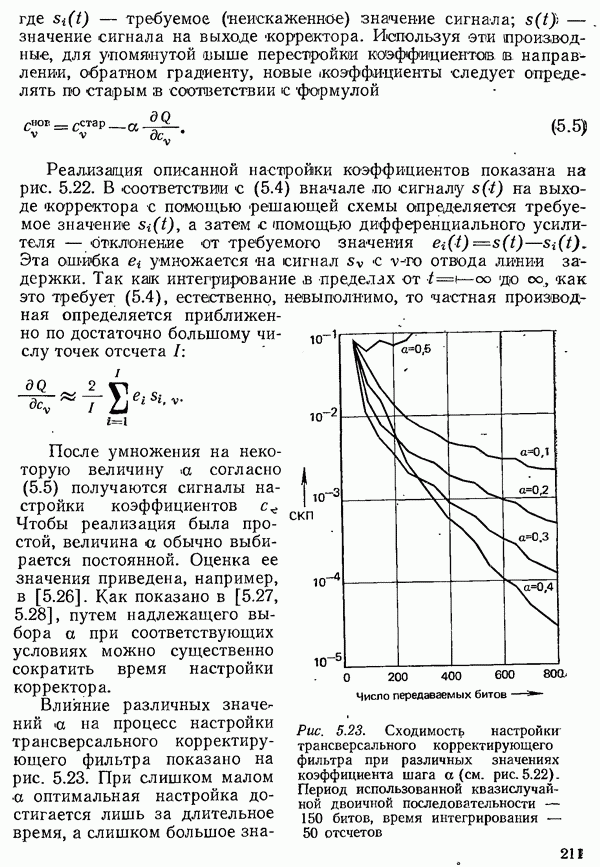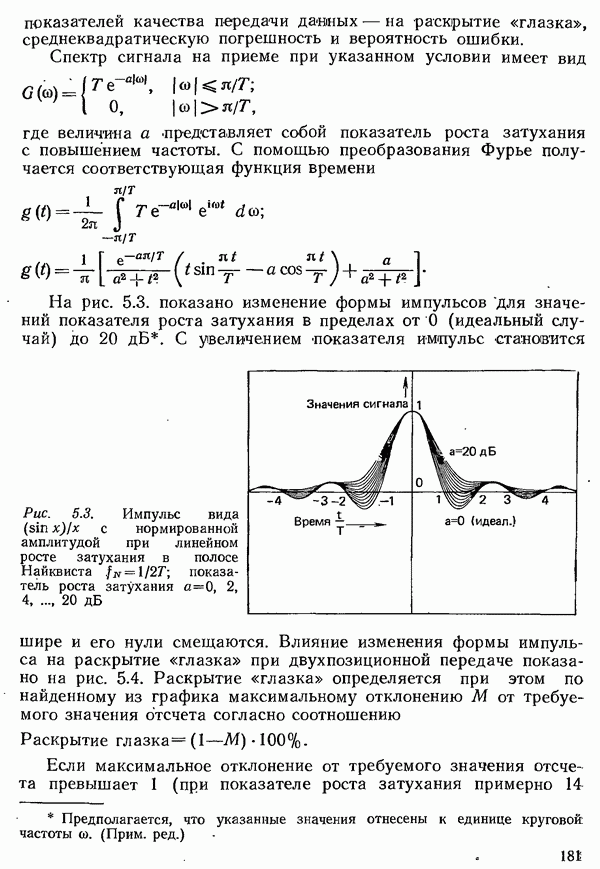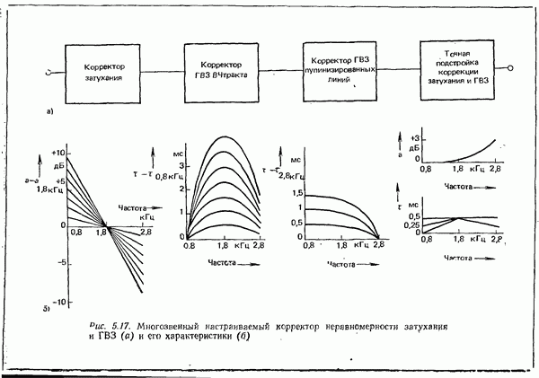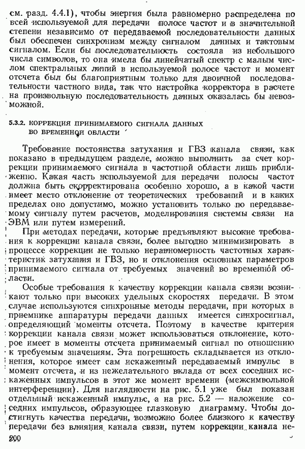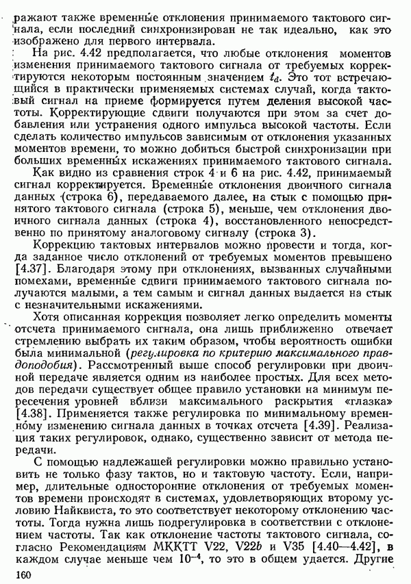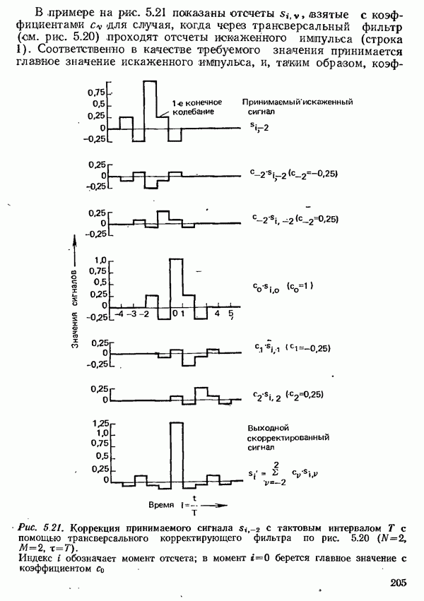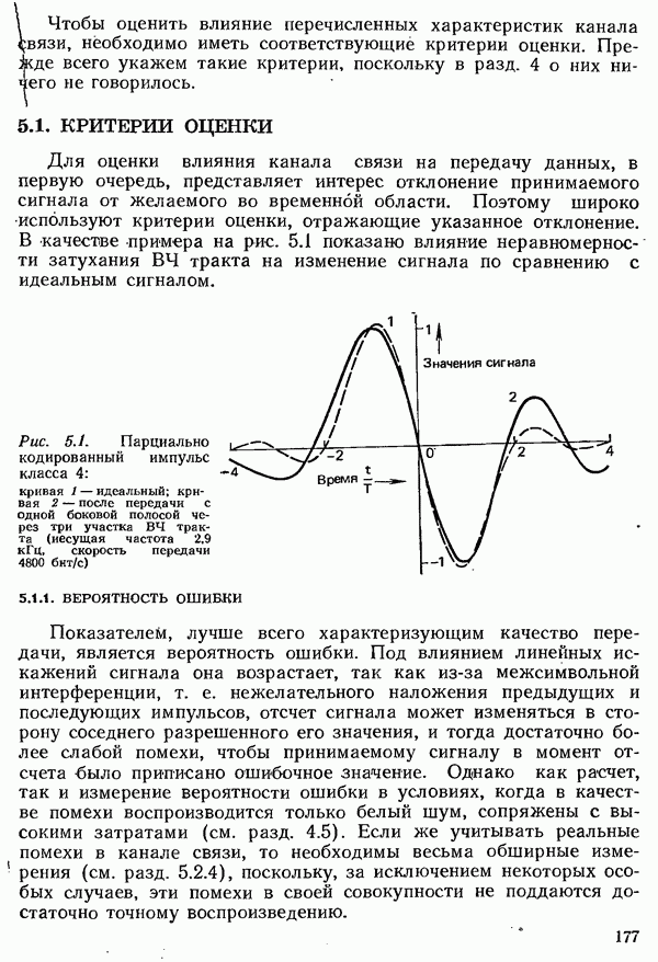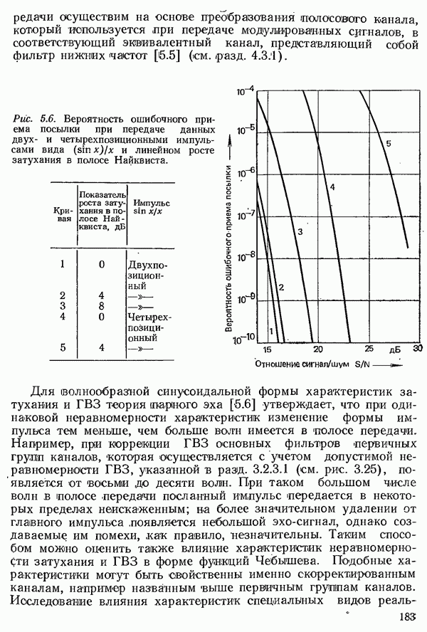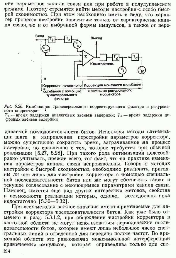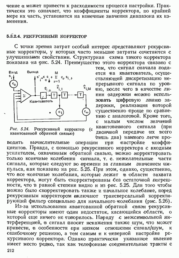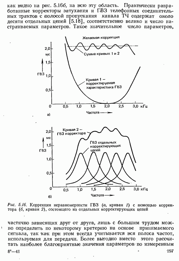 5.3. КОРРЕКЦИЯ ПРИНИМАЕМОГО СИГНАЛА ДАННЫХВ разд. 5.2 обсуждалось влияние характеристик канала связи на передачу сигналов данных. Влияние случайной помехи можно свести к минимуму в а счет надлежащей частотной избирательности цепей аппаратуры передачи данных. Характеристики и свойства каналов связи, практически постоянные во времени, — частотные характеристики затухания и ГВЗ, эхо, сдвиг частоты и периодическое дрожание фазы (джиттер фазы) — ведут к изменению формы принимаемого сигнала, а тем самым, в зависимости от метода и скорости передачи, к более сильной чувствительности к случайным помехам. Изменение формы передаваемого сигнала при высокой удельной скорости передачи может быть столь большим, что и без дополнительных помех безошибочная передача окажется уже невозможной. Так как упомянутые выше свойства канала связи практически постоянны, т. е. очень мало и медленно изменяются во времени, то их влияние можно в значительной степени скомпенсировать путем коррекции принимаемого сигнала. При этом следует различать коррекцию принимаемого аналогового сигнала и коррекцию восстановленного по нему двоичного сигнала данных. Прежде чем обсуждать коррекцию аналогового сигнала, коротко остановимся на коррекции двоичного сигнала данных. Как видно из рис. 4.42 (ем. разд. 4.4.1), показанный в строке 4 искаженно принятый аналоговый сигнал пересекает пороговый уровень с временными отклонениями В сетях передачи данных без синхронизации соединительный тракт содержит много последовательно включенных участков, которые работают асинхронно (см. том 2, разд. 11.1). Если ожидаемые во всем соединительном тракте краевые искажения слишком велики, то после одного или нескольких участков могут быть установлены корректоры, которые регенерируют знаки, передаваемые вместе со стартстопными элементами. Каждый принятый искаженный знак считывается при этом, начиная со стартового элемента, и неискаженным передается дальше. Такая коррекция зависит от скорости, а во многих случаях — и от знаков. При синхронной передаче сигнал данных, в принципе, корректируется. Наряду с тактовыми искажениями сигнала данных, при синхронной передаче необходимо принимать во внимание и тактовое дрожание. Тактовым дрожанием (тактовым джиттером) называют максимальное отклонение тактовых моментов времени от требуемых, отнесенное к требуемой длительности тактового интервала Принимаемый аналоговый сигнал данных, показанный на рис. 4.42, имеет такое искажение, которое еще не приводит к ошибочному решению. Ошибки в восстановленном двоичном сигнале, появляющиеся при более значительных искажениях, могут быть устранены лишь с помощью кодов, обнаруживающих или иоправляющих ошибки. Их можно также избежать, если корректировать уже аналоговый сигнал. Влияние незначительно и медленно меняющихся во времени характеристик канала связи на передаваемый сигнал данных основано, главным образом, на изменении с частотой затухания и ГВЗ. При этом учитывается также и эхо, которое согласно разд. 3.2.2.5 проявляется в периодических колебаниях частотных характеристик затухания и ГВЗ. В двух последующих разделах будут рассмотрены способы уменьшения влияния частотных характеристик канала за счет коррекции в частотной и временной областях. Методы уменьшения влияния периодического дрожания ф