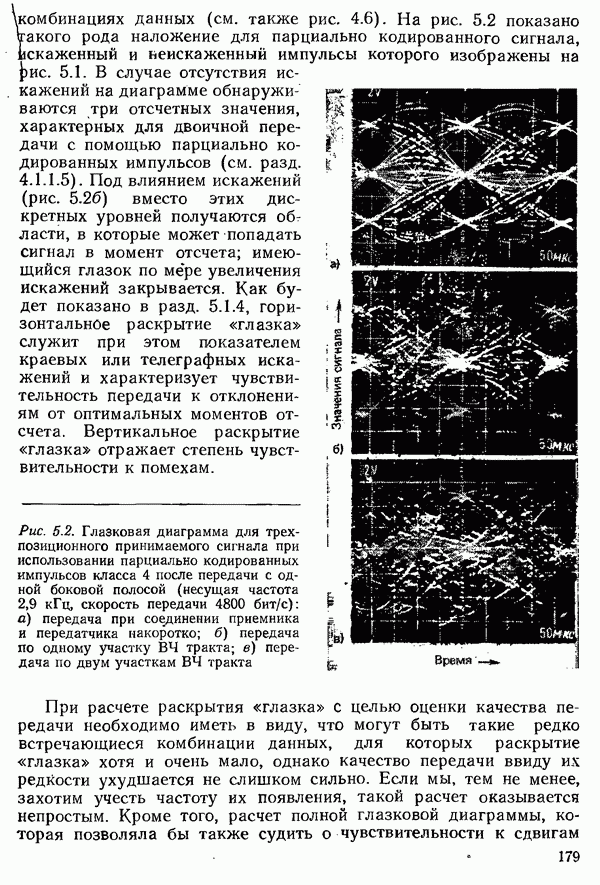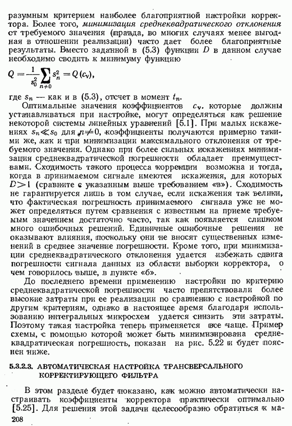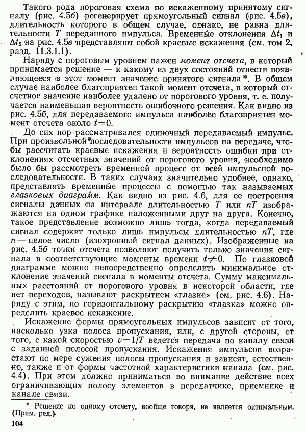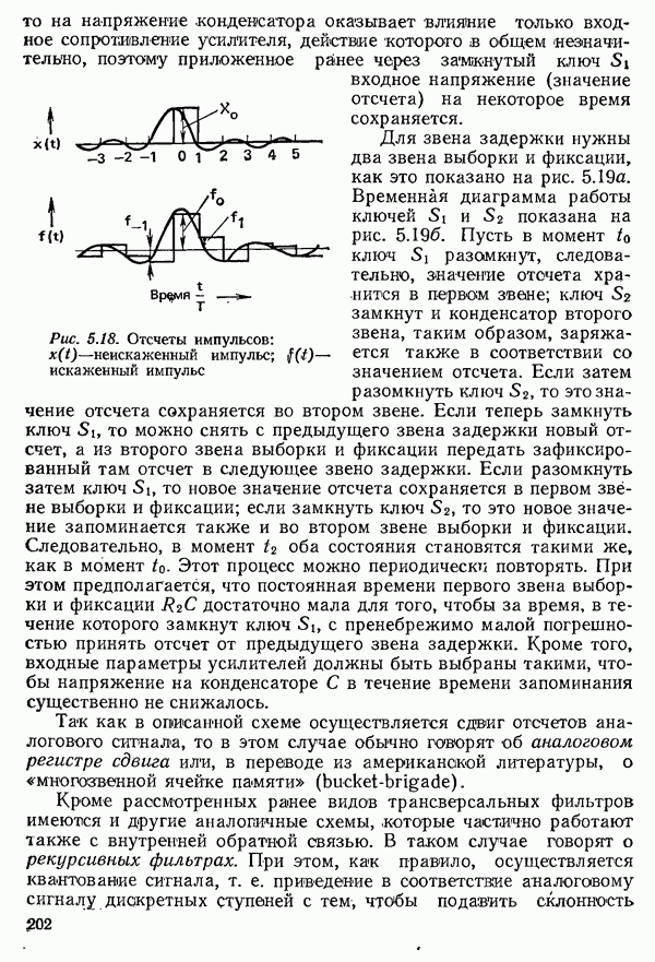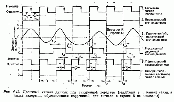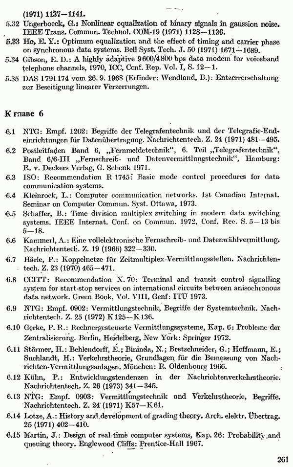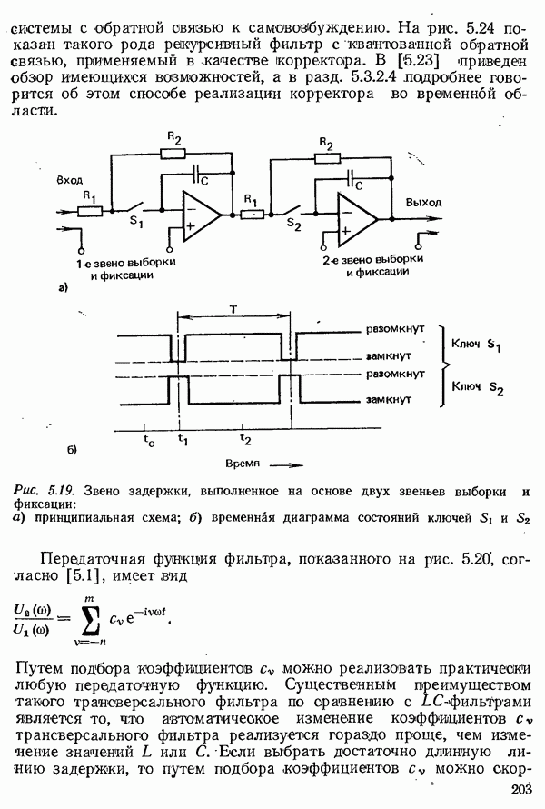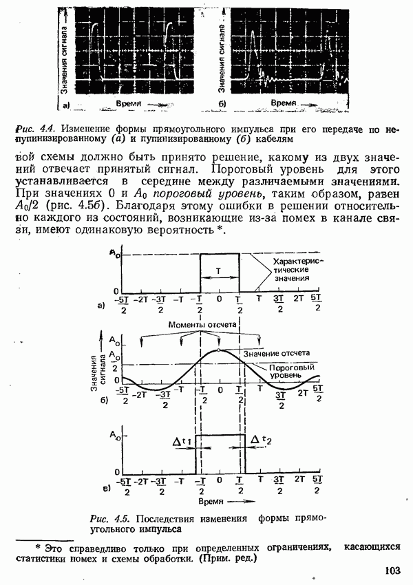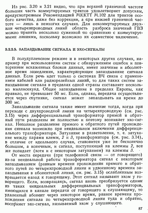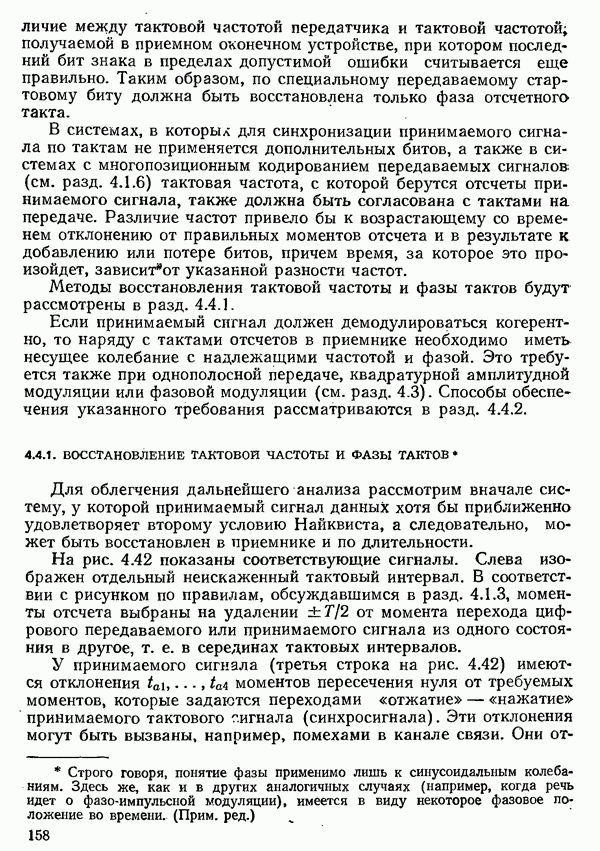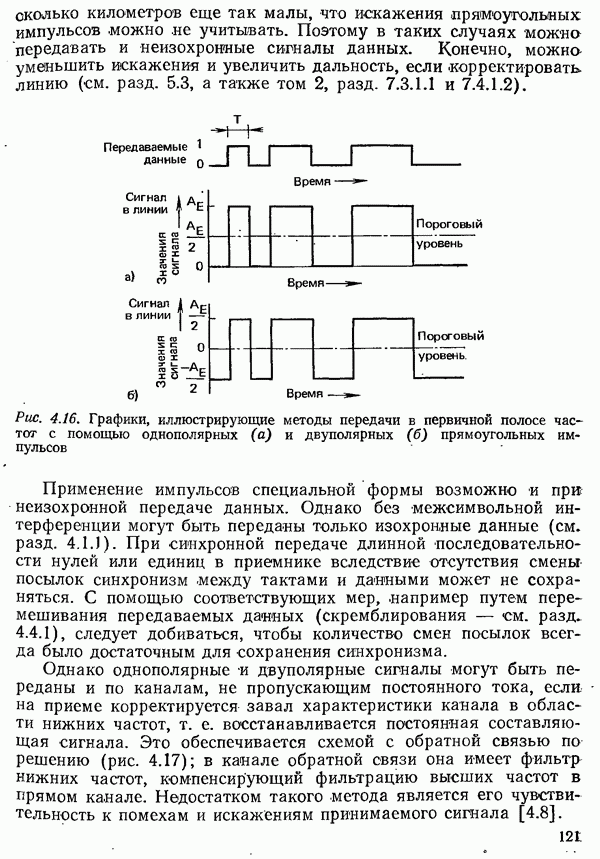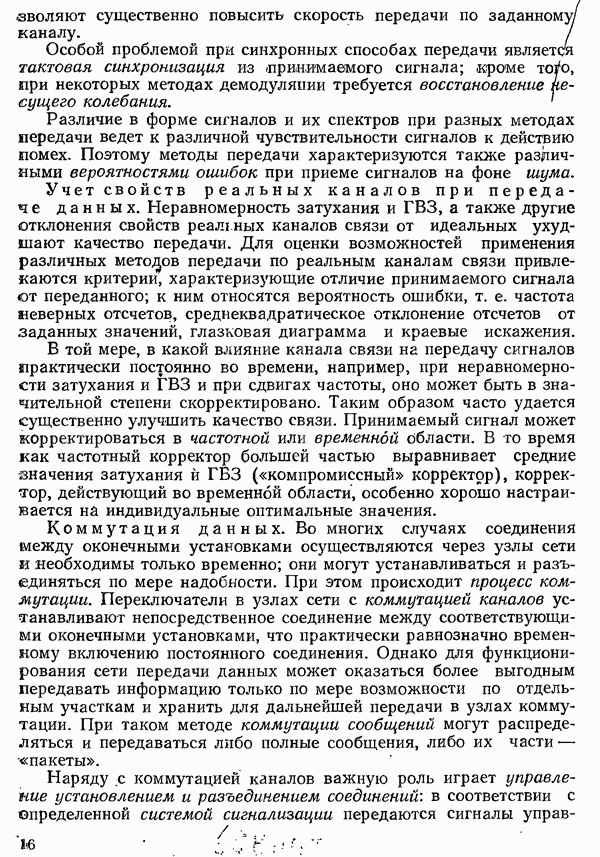 5.3. КОРРЕКЦИЯ ПРИНИМАЕМОГО СИГНАЛА ДАННЫХВ разд. 5.2 обсуждалось влияние характеристик канала связи на передачу сигналов данных. Влияние случайной помехи можно свести к минимуму в а счет надлежащей частотной избирательности цепей аппаратуры передачи данных. Характеристики и свойства каналов связи, практически постоянные во времени, — частотные характеристики затухания и ГВЗ, эхо, сдвиг частоты и периодическое дрожание фазы (джиттер фазы) — ведут к изменению формы принимаемого сигнала, а тем самым, в зависимости от метода и скорости передачи, к более сильной чувствительности к случайным помехам. Изменение формы передаваемого сигнала при высокой удельной скорости передачи может быть столь большим, что и без дополнительных помех безошибочная передача окажется уже невозможной. Так как упомянутые выше свойства канала связи практически постоянны, т. е. очень мало и медленно изменяются во времени, то их влияние можно в значительной степени скомпенсировать путем коррекции принимаемого сигнала. При этом следует различать коррекцию принимаемого аналогового сигнала и коррекцию восстановленного по нему двоичного сигнала данных. Прежде чем обсуждать коррекцию аналогового сигнала, коротко остановимся на коррекции двоичного сигнала данных. Как видно из рис. 4.42 (ем. разд. 4.4.1), показанный в строке 4 искаженно принятый аналоговый сигнал пересекает пороговый уровень с временными отклонениями В сетях передачи данных без синхронизации соединительный тракт содержит много последовательно включенных участков, которые работают асинхронно (см. том 2, разд. 11.1). Если ожидаемые во всем соединительном тракте краевые искажения слишком велики, то после одного или нескольких участков могут быть установлены корректоры, которые регенерируют знаки, передаваемые вместе со стартстопными элементами. Каждый принятый искаженный знак считывается при этом, начиная со стартового элемента, и неискаженным передается дальше. Такая коррекция зависит от скорости, а во многих случаях — и от знаков. При синхронной передаче сигнал данных, в принципе, корректируется. Наряду с тактовыми искажениями сигнала данных, при синхронной передаче необходимо принимать во внимание и тактовое дрожание. Тактовым дрожанием (тактовым джиттером) называют максимальное отклонение тактовых моментов времени от требуемых, отнесенное к требуемой длительности тактового интервала Принимаемый аналоговый сигнал данных, показанный на рис. 4.42, имеет такое искажение, которое еще не приводит к ошибочному решению. Ошибки в восстановленном двоичном сигнале, появляющиеся при более значительных искажениях, могут быть устранены лишь с помощью кодов, обнаруживающих или иоправляющих ошибки. Их можно также избежать, если корректировать уже аналоговый сигнал. Влияние незначительно и медленно меняющихся во времени характеристик канала связи на передаваемый сигнал данных основано, главным образом, на изменении с частотой затухания и ГВЗ. При этом учитывается также и эхо, которое согласно разд. 3.2.2.5 проявляется в периодических колебаниях частотных характеристик затухания и ГВЗ. В двух последующих разделах будут рассмотрены способы уменьшения влияния частотных характеристик канала за счет коррекции в частотной и временной областях. Методы уменьшения влияния периодического дрожания ф