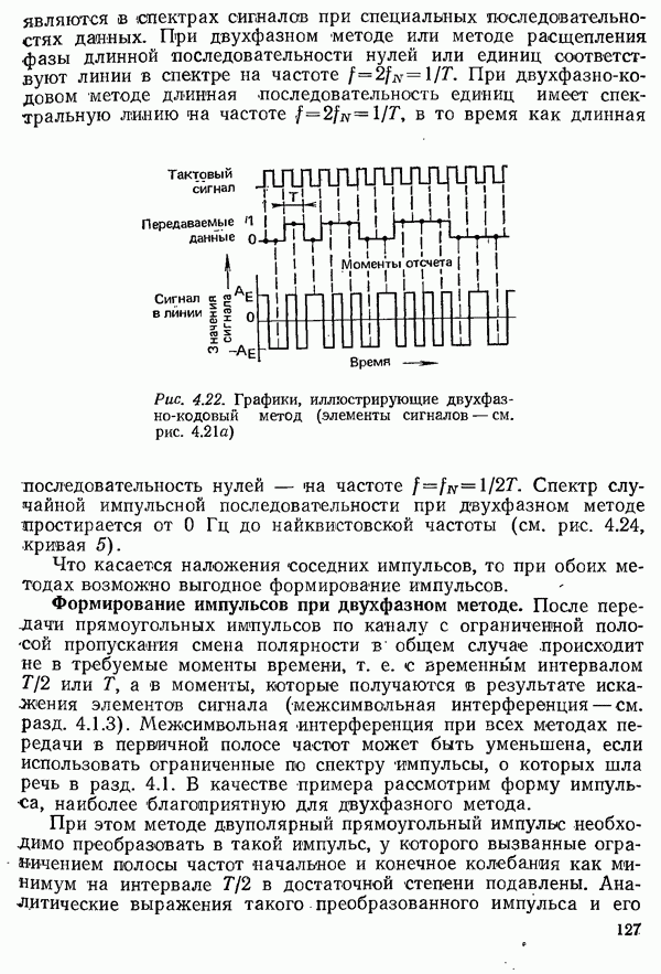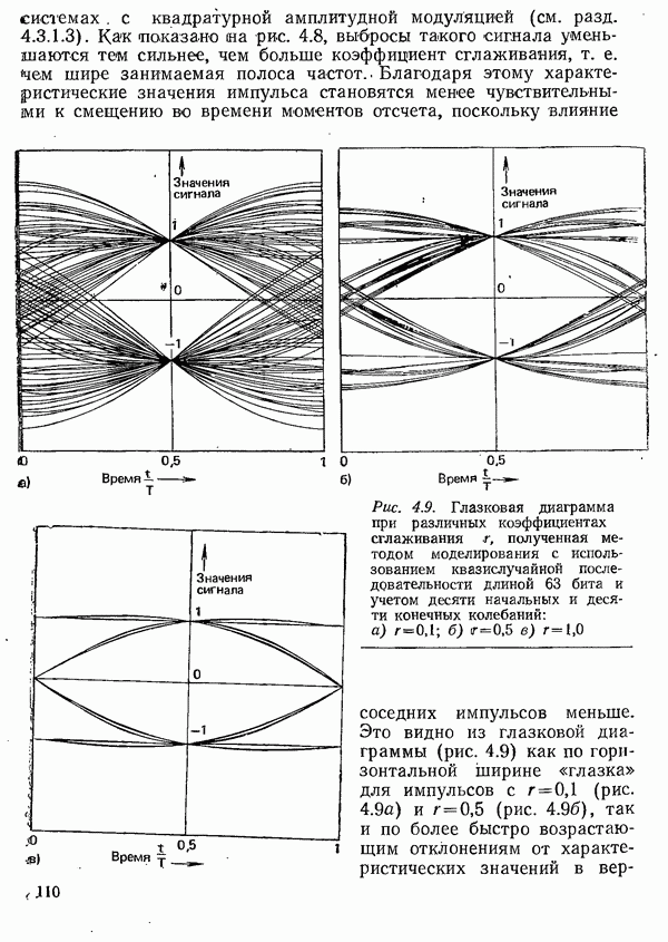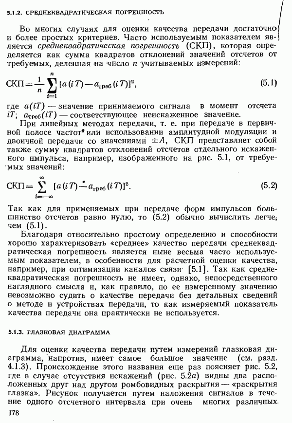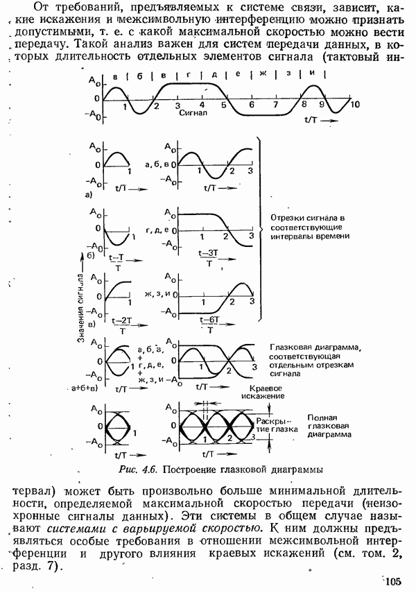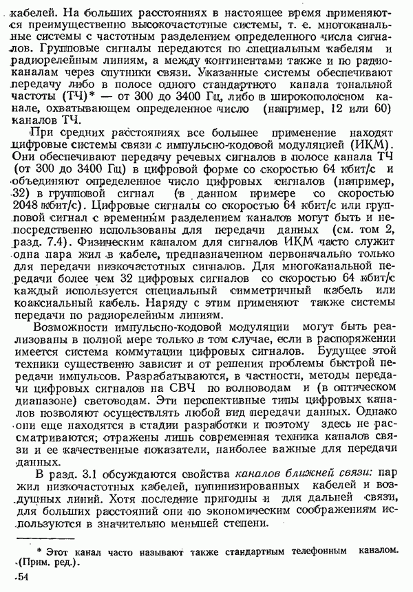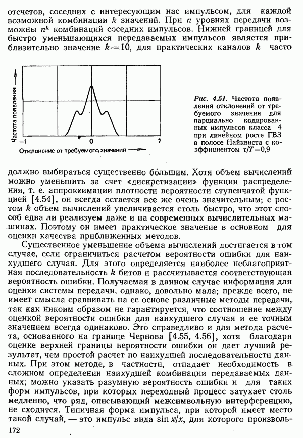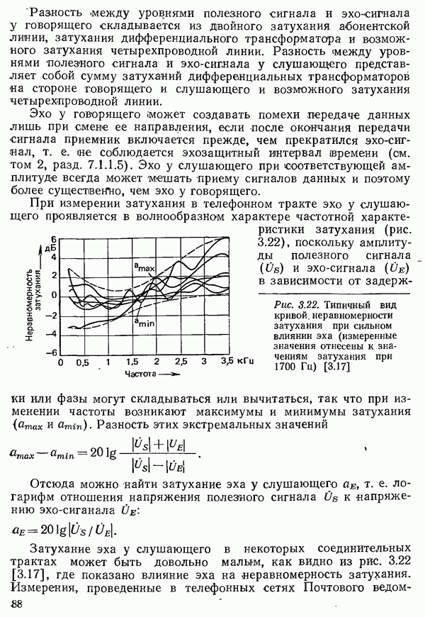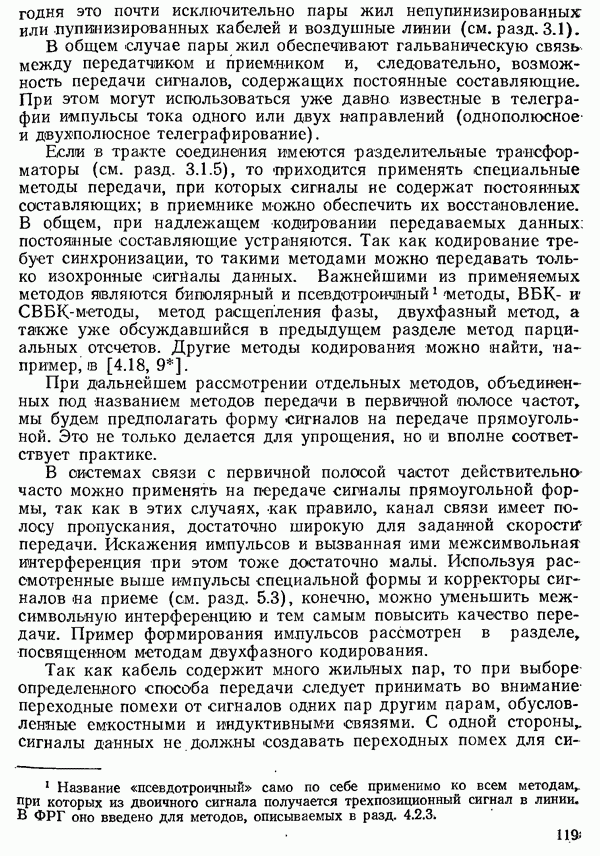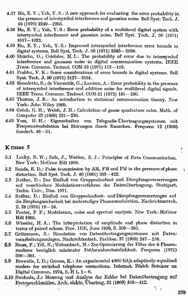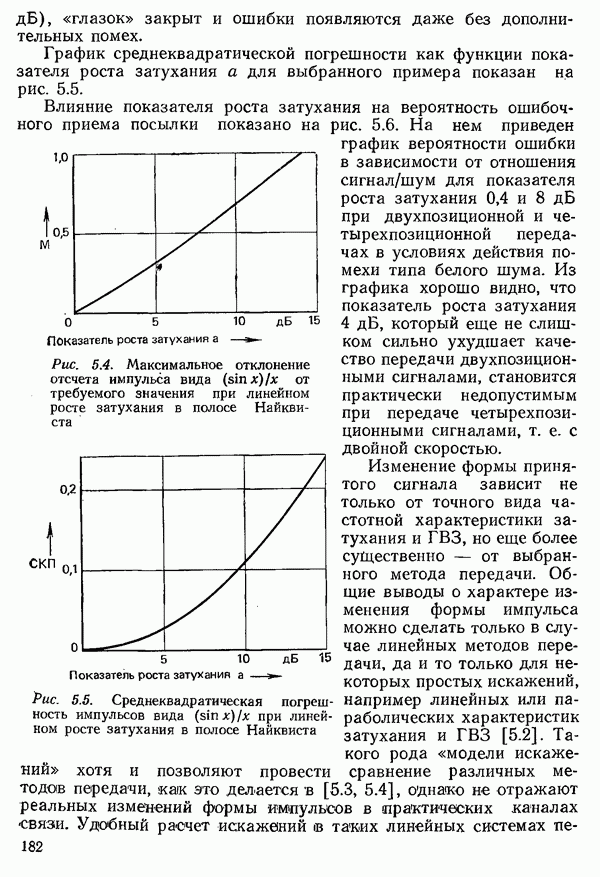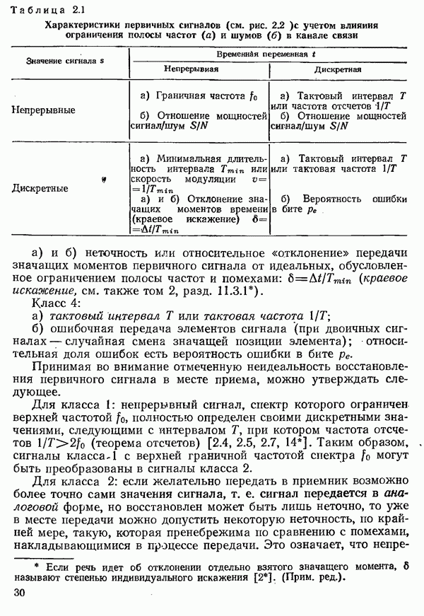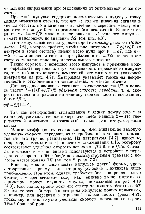 5.3. КОРРЕКЦИЯ ПРИНИМАЕМОГО СИГНАЛА ДАННЫХВ разд. 5.2 обсуждалось влияние характеристик канала связи на передачу сигналов данных. Влияние случайной помехи можно свести к минимуму в а счет надлежащей частотной избирательности цепей аппаратуры передачи данных. Характеристики и свойства каналов связи, практически постоянные во времени, — частотные характеристики затухания и ГВЗ, эхо, сдвиг частоты и периодическое дрожание фазы (джиттер фазы) — ведут к изменению формы принимаемого сигнала, а тем самым, в зависимости от метода и скорости передачи, к более сильной чувствительности к случайным помехам. Изменение формы передаваемого сигнала при высокой удельной скорости передачи может быть столь большим, что и без дополнительных помех безошибочная передача окажется уже невозможной. Так как упомянутые выше свойства канала связи практически постоянны, т. е. очень мало и медленно изменяются во времени, то их влияние можно в значительной степени скомпенсировать путем коррекции принимаемого сигнала. При этом следует различать коррекцию принимаемого аналогового сигнала и коррекцию восстановленного по нему двоичного сигнала данных. Прежде чем обсуждать коррекцию аналогового сигнала, коротко остановимся на коррекции двоичного сигнала данных. Как видно из рис. 4.42 (ем. разд. 4.4.1), показанный в строке 4 искаженно принятый аналоговый сигнал пересекает пороговый уровень с временными отклонениями В сетях передачи данных без синхронизации соединительный тракт содержит много последовательно включенных участков, которые работают асинхронно (см. том 2, разд. 11.1). Если ожидаемые во всем соединительном тракте краевые искажения слишком велики, то после одного или нескольких участков могут быть установлены корректоры, которые регенерируют знаки, передаваемые вместе со стартстопными элементами. Каждый принятый искаженный знак считывается при этом, начиная со стартового элемента, и неискаженным передается дальше. Такая коррекция зависит от скорости, а во многих случаях — и от знаков. При синхронной передаче сигнал данных, в принципе, корректируется. Наряду с тактовыми искажениями сигнала данных, при синхронной передаче необходимо принимать во внимание и тактовое дрожание. Тактовым дрожанием (тактовым джиттером) называют максимальное отклонение тактовых моментов времени от требуемых, отнесенное к требуемой длительности тактового интервала Принимаемый аналоговый сигнал данных, показанный на рис. 4.42, имеет такое искажение, которое еще не приводит к ошибочному решению. Ошибки в восстановленном двоичном сигнале, появляющиеся при более значительных искажениях, могут быть устранены лишь с помощью кодов, обнаруживающих или иоправляющих ошибки. Их можно также избежать, если корректировать уже аналоговый сигнал. Влияние незначительно и медленно меняющихся во времени характеристик канала связи на передаваемый сигнал данных основано, главным образом, на изменении с частотой затухания и ГВЗ. При этом учитывается также и эхо, которое согласно разд. 3.2.2.5 проявляется в периодических колебаниях частотных характеристик затухания и ГВЗ. В двух последующих разделах будут рассмотрены способы уменьшения влияния частотных характеристик канала за счет коррекции в частотной и временной областях. Методы уменьшения влияния периодического дрожания ф