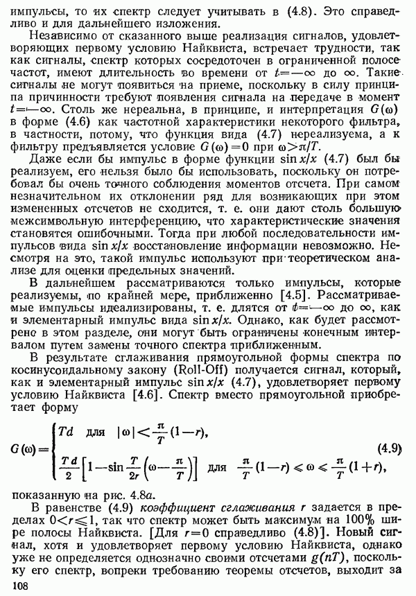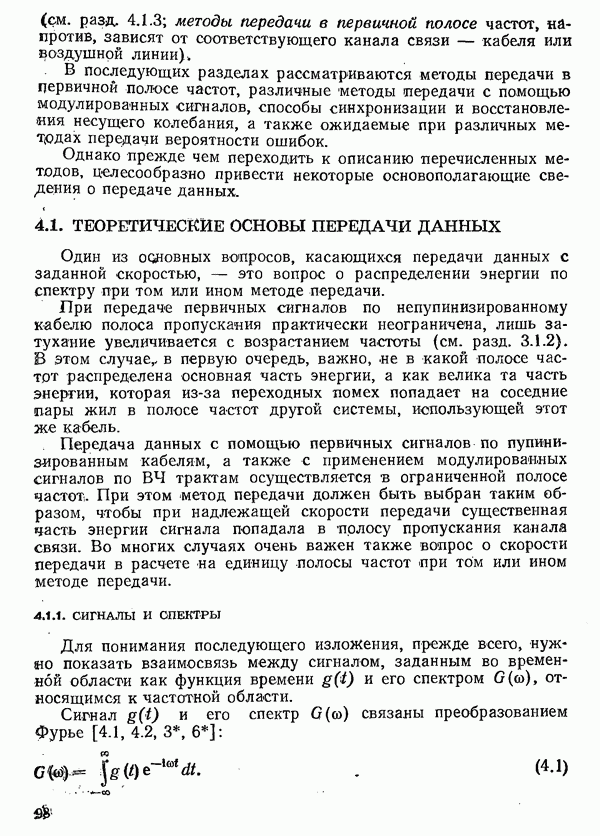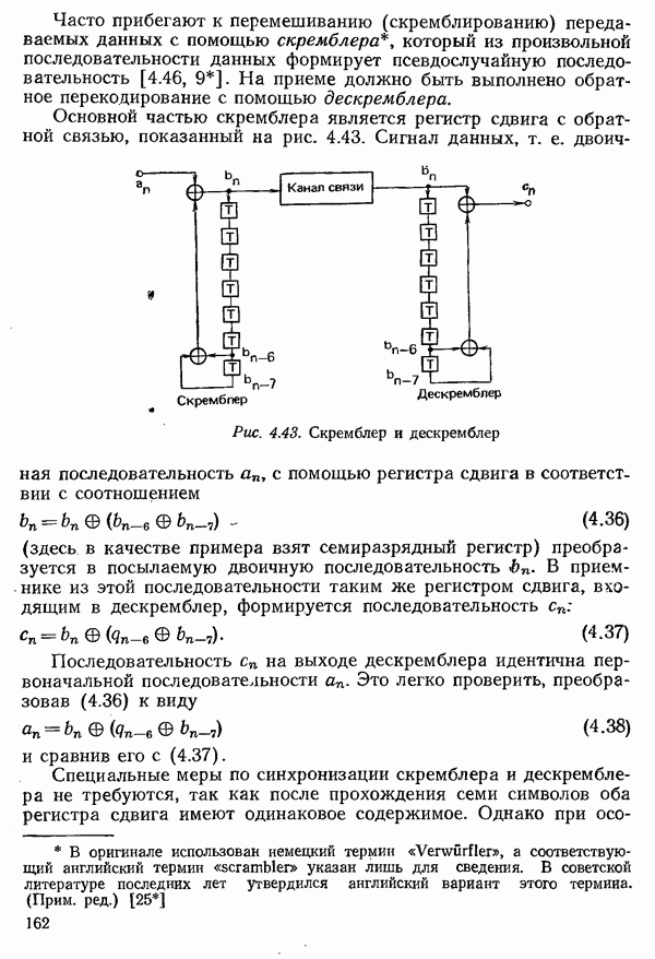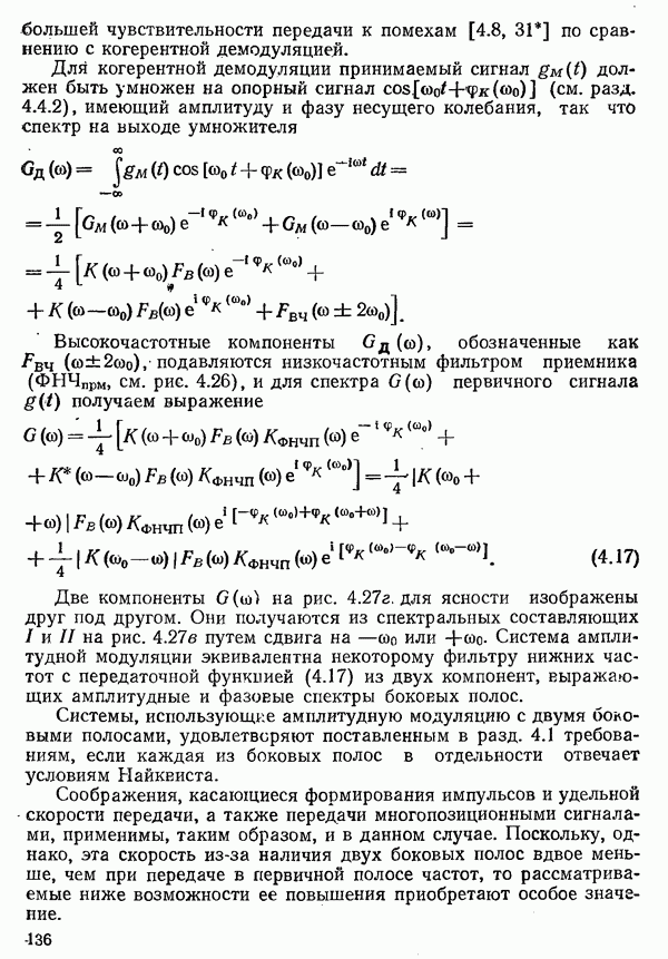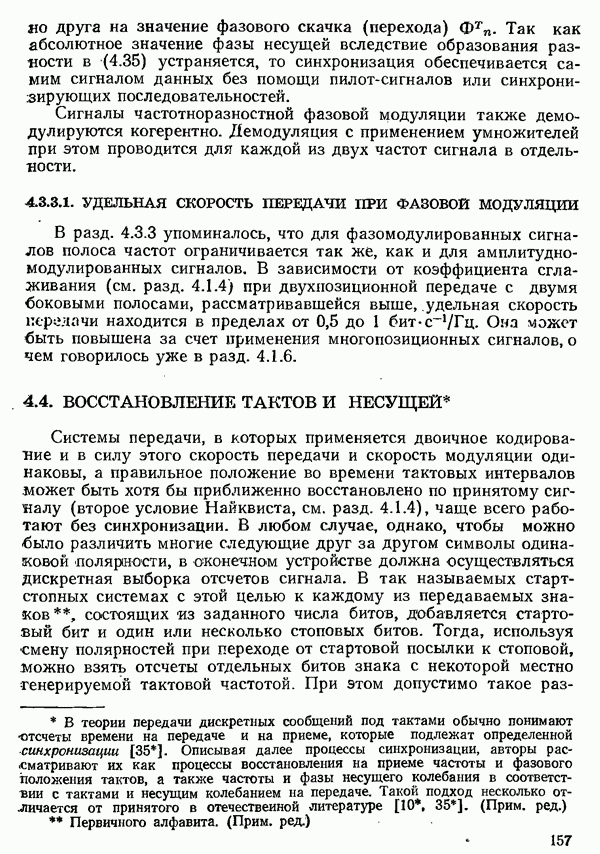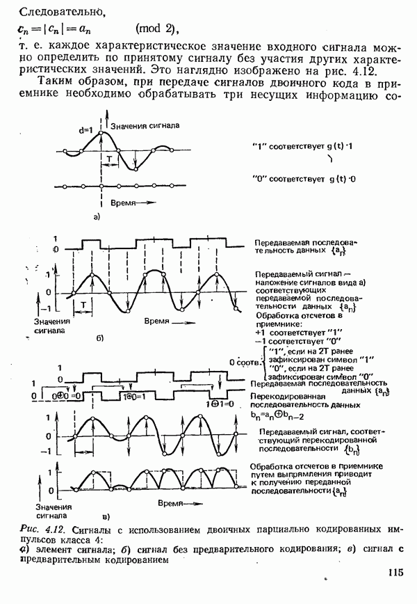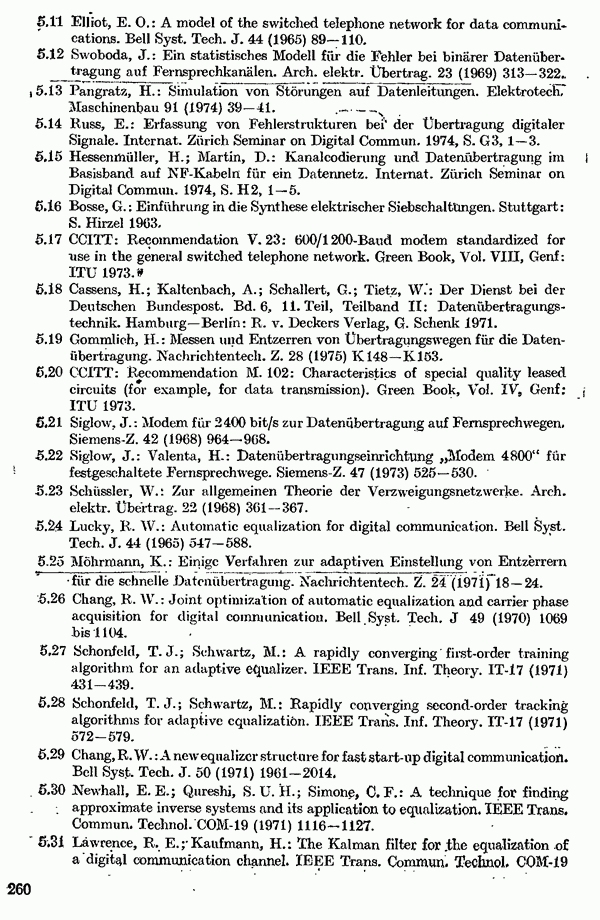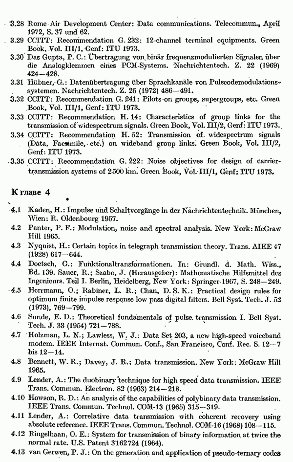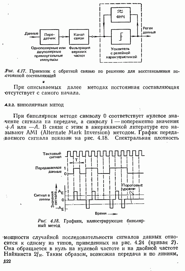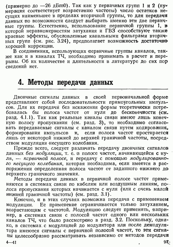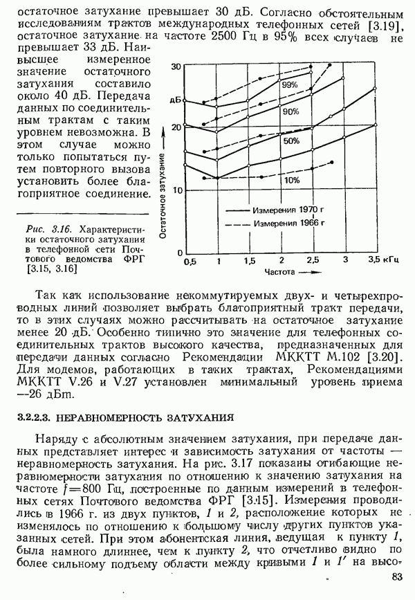 5.3. КОРРЕКЦИЯ ПРИНИМАЕМОГО СИГНАЛА ДАННЫХВ разд. 5.2 обсуждалось влияние характеристик канала связи на передачу сигналов данных. Влияние случайной помехи можно свести к минимуму в а счет надлежащей частотной избирательности цепей аппаратуры передачи данных. Характеристики и свойства каналов связи, практически постоянные во времени, — частотные характеристики затухания и ГВЗ, эхо, сдвиг частоты и периодическое дрожание фазы (джиттер фазы) — ведут к изменению формы принимаемого сигнала, а тем самым, в зависимости от метода и скорости передачи, к более сильной чувствительности к случайным помехам. Изменение формы передаваемого сигнала при высокой удельной скорости передачи может быть столь большим, что и без дополнительных помех безошибочная передача окажется уже невозможной. Так как упомянутые выше свойства канала связи практически постоянны, т. е. очень мало и медленно изменяются во времени, то их влияние можно в значительной степени скомпенсировать путем коррекции принимаемого сигнала. При этом следует различать коррекцию принимаемого аналогового сигнала и коррекцию восстановленного по нему двоичного сигнала данных. Прежде чем обсуждать коррекцию аналогового сигнала, коротко остановимся на коррекции двоичного сигнала данных. Как видно из рис. 4.42 (ем. разд. 4.4.1), показанный в строке 4 искаженно принятый аналоговый сигнал пересекает пороговый уровень с временными отклонениями В сетях передачи данных без синхронизации соединительный тракт содержит много последовательно включенных участков, которые работают асинхронно (см. том 2, разд. 11.1). Если ожидаемые во всем соединительном тракте краевые искажения слишком велики, то после одного или нескольких участков могут быть установлены корректоры, которые регенерируют знаки, передаваемые вместе со стартстопными элементами. Каждый принятый искаженный знак считывается при этом, начиная со стартового элемента, и неискаженным передается дальше. Такая коррекция зависит от скорости, а во многих случаях — и от знаков. При синхронной передаче сигнал данных, в принципе, корректируется. Наряду с тактовыми искажениями сигнала данных, при синхронной передаче необходимо принимать во внимание и тактовое дрожание. Тактовым дрожанием (тактовым джиттером) называют максимальное отклонение тактовых моментов времени от требуемых, отнесенное к требуемой длительности тактового интервала Принимаемый аналоговый сигнал данных, показанный на рис. 4.42, имеет такое искажение, которое еще не приводит к ошибочному решению. Ошибки в восстановленном двоичном сигнале, появляющиеся при более значительных искажениях, могут быть устранены лишь с помощью кодов, обнаруживающих или иоправляющих ошибки. Их можно также избежать, если корректировать уже аналоговый сигнал. Влияние незначительно и медленно меняющихся во времени характеристик канала связи на передаваемый сигнал данных основано, главным образом, на изменении с частотой затухания и ГВЗ. При этом учитывается также и эхо, которое согласно разд. 3.2.2.5 проявляется в периодических колебаниях частотных характеристик затухания и ГВЗ. В двух последующих разделах будут рассмотрены способы уменьшения влияния частотных характеристик канала за счет коррекции в частотной и временной областях. Методы уменьшения влияния периодического дрожания ф