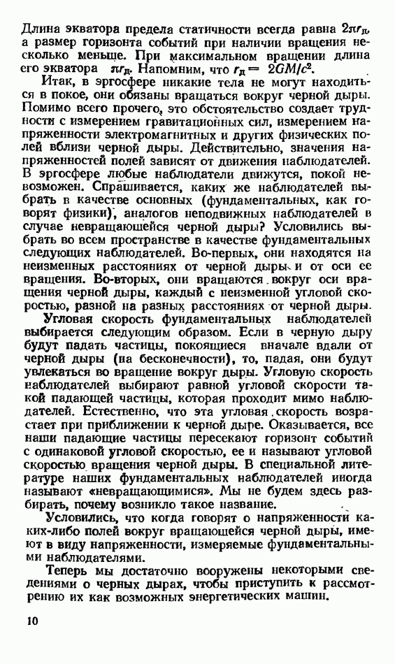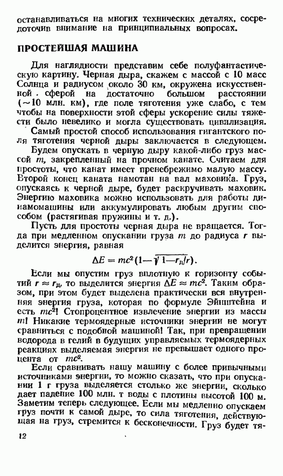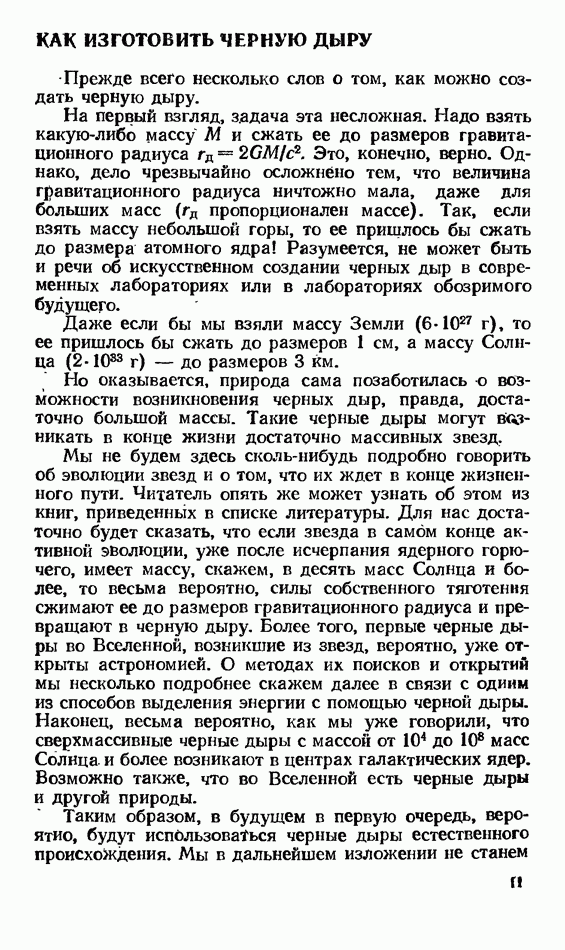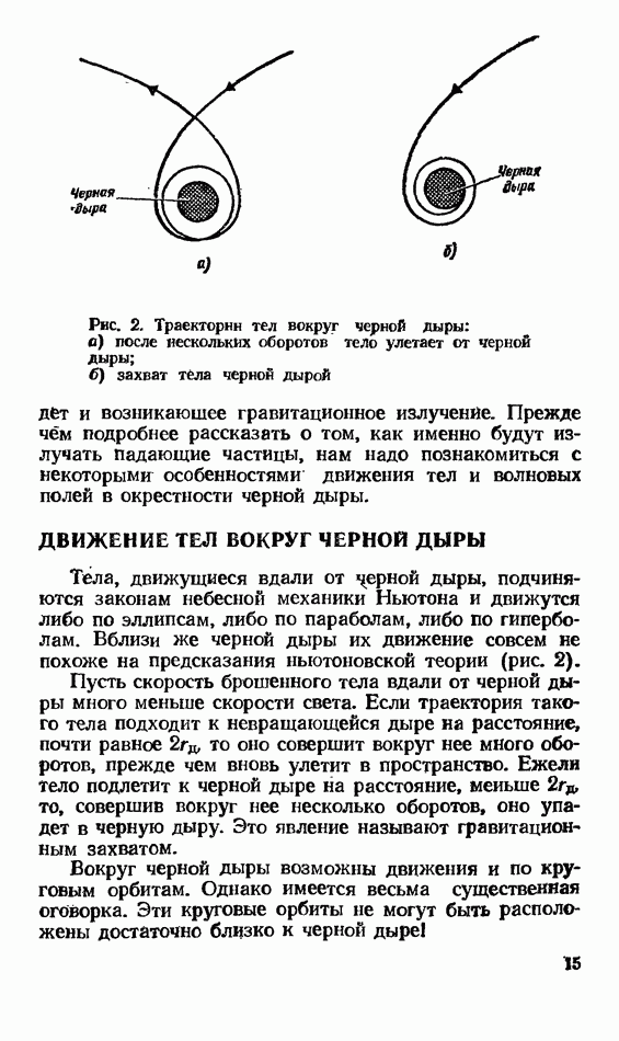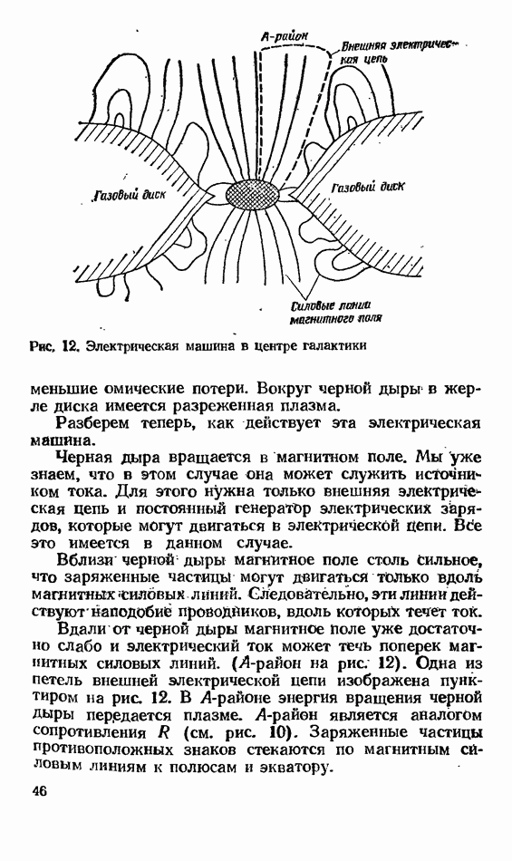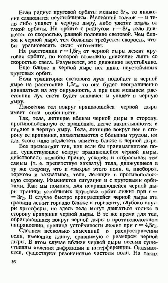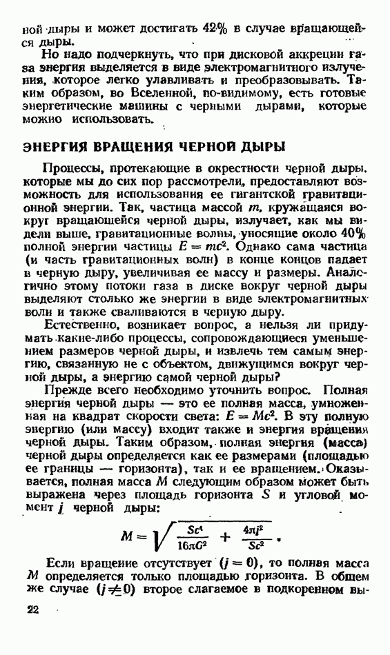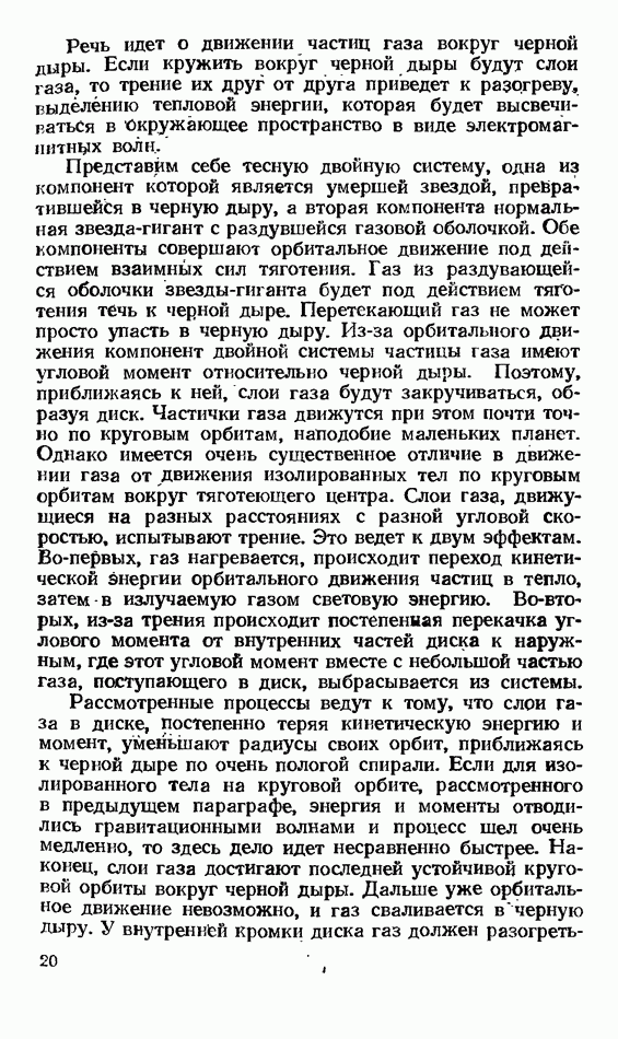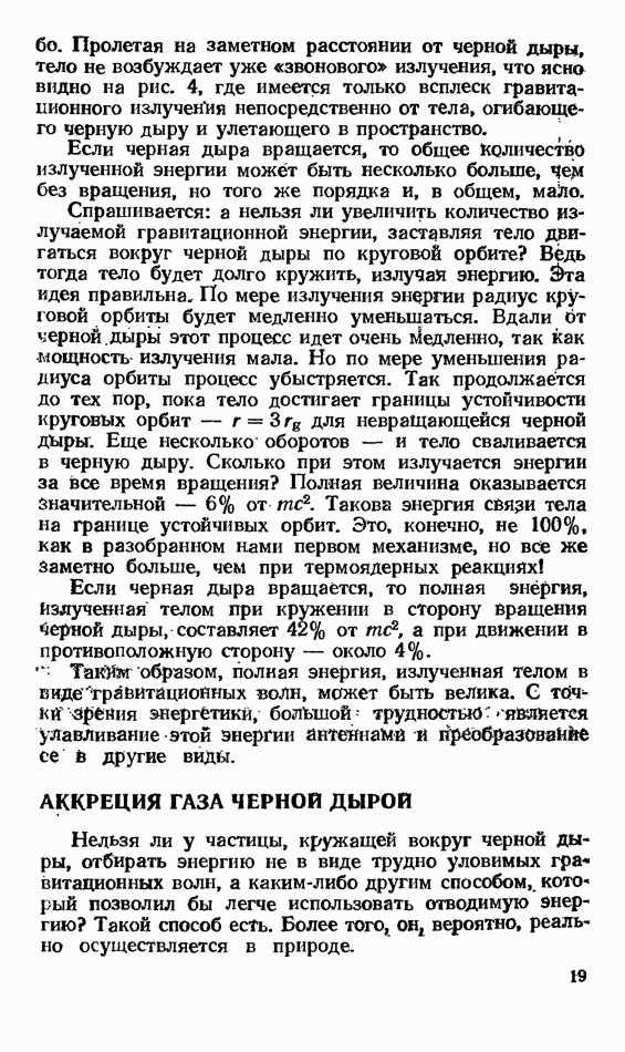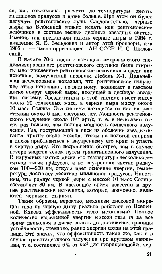 Распознанный текст, спецсимволы и формулы могут содержать ошибки, поэтому с корректным вариантом рекомендуем ознакомиться на отсканированных изображениях учебника выше Также, советуем воспользоваться поиском по сайту, мы уверены, что вы сможете найти больше информации по нужной Вам тематике ДЛЯ СТУДЕНТОВ И ШКОЛЬНИКОВ ЕСТЬZADANIA.TO АККРЕЦИЯ ГАЗА ЧЕРНОЙ ДЫРОЙНельзя ли у частицы, кружащей вокруг черной дыры, отбирать энергию не в виде трудно уловимых гравитационных волн, а каким-либо другим способом, который позволил бы легче использовать отводимую энергию? Такой способ есть. Более того, он, вероятно, реально осуществляется в природе. Речь идет о движении частиц газа вокруг черной дыры. Если кружить вокруг черной дыры будут слои газа, то трение их друг от друга приведет к разогреву, выделению тепловой энергии, которая будет высвечиваться в Окружающее пространство в виде электромагнитных волн. Представим себе тесную двойную систему, одна из компонент которой является умершей звездой, превратившейся в черную дыру, а вторая компонента нормальная звезда-гигант с раздувшейся газовой оболочкой. Обе компоненты совершают орбитальное движение под действием взаимных сил тяготения. Газ из раздувающейся оболочки звезды-гиганта будет под действием тяготения течь к черной дыре. Перетекающий газ не может просто упасть в черную дыру. Из-за орбитального движения компонент двойной системы частицы газа имеют угловой момент относительно черной дыры. Поэтому, приближаясь к ней, слои газа будут закручиваться, образуя диск. Частички газа движутся при этом почти точно по круговым орбитам, наподобие маленьких планет. Однако имеется очень существенное отличие в движении газа от движения изолированных тел по круговым орбитам вокруг тяготеющего центра. Слои газа, движущиеся на разных расстояниях с разной угловой скоростью, испытывают трение. Это ведет к двум эффектам. Во-первых, газ нагревается, происходит переход кинетической энергии орбитального движения частиц в тепло, затем в излучаемую газом световую энергию. Во-вторых, из-за трения происходит постепенная перекачка углового момента от внутренних частей диска к наружным, где этот угловой момент вместе с небольшой частью газа, поступающего в диск, выбрасывается из системы. Рассмотренные процессы ведут к тому, что слои газа в диске, постепенно теряя кинетическую энергию и момент, уменьшают радиусы своих орбит, приближаясь к черной дыре по очень пологой спирали. Если для изолированного тела на круговой орбите, рассмотренного в предыдущем параграфе, энергия и моменты отводились гравитационными волнами и процесс шел очень медленно, то здесь дело идет несравненно быстрее. Наконец, слои газа достигают последней устойчивой круговой орбиты вокруг черной дыры. Дальше уже орбитальное движение невозможно, и газ сваливается вчерную дыру, у внутренней кромки диска газ должен разогреться, как показывают расчеты, до температуры десять миллионов градусов и даже больше. При этом он будет излучать рентгеновские лучи. Следовательно, черные дыры во Вселенной можно искать как рентгеновские источники в составе тесных двойных звездных систем. Именно так предлагали искать черные дыры в 1964 г. академик  В начале 70-х годов с помощью американского специализированного рентгеновского спутника были открыты мног