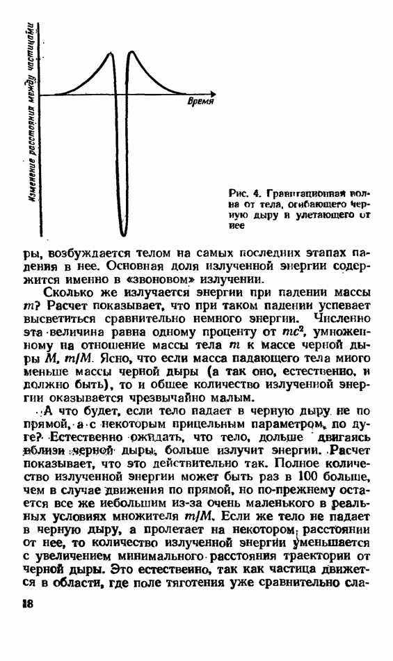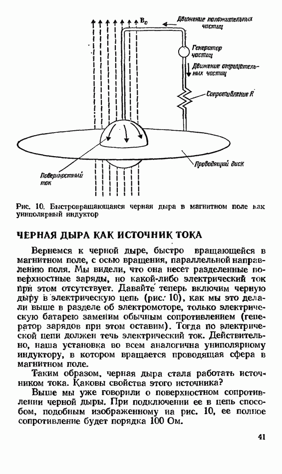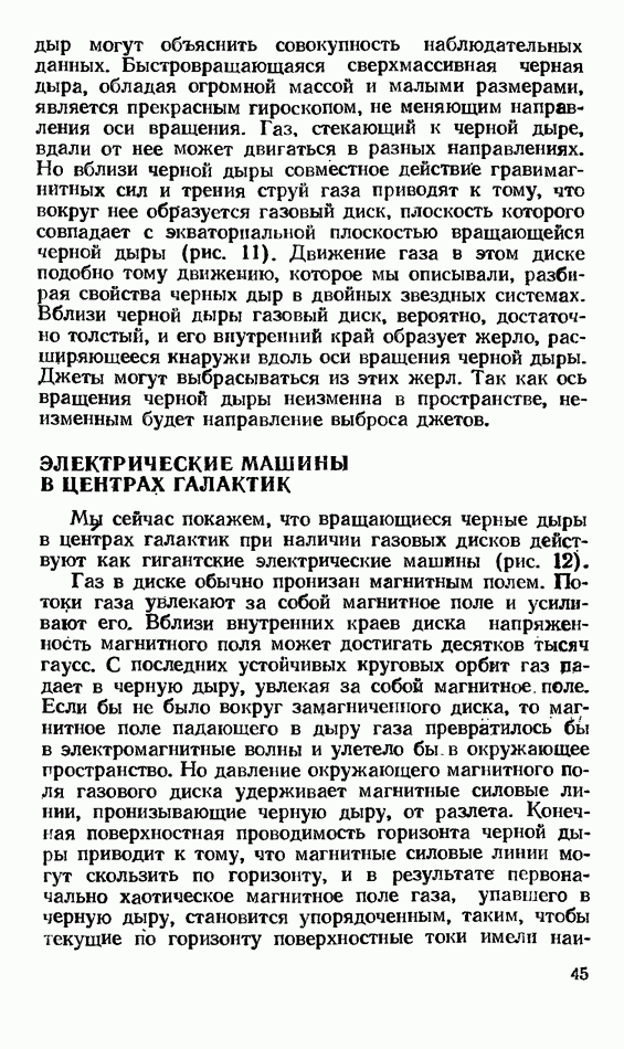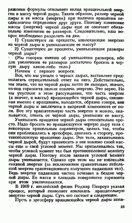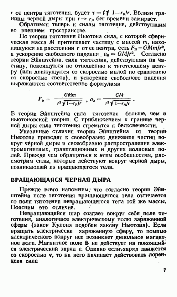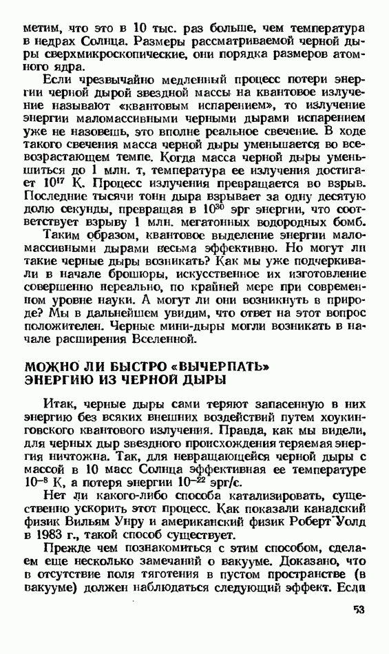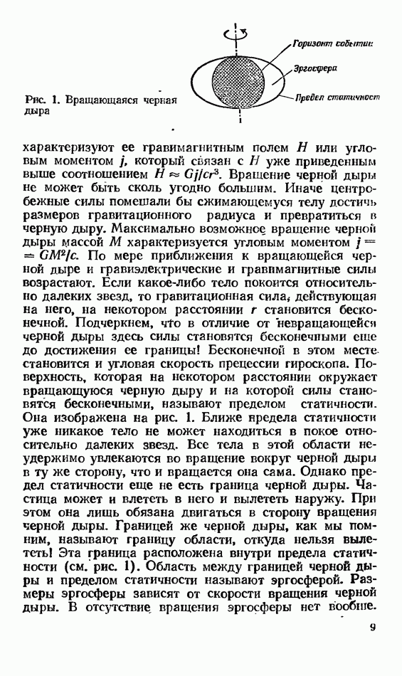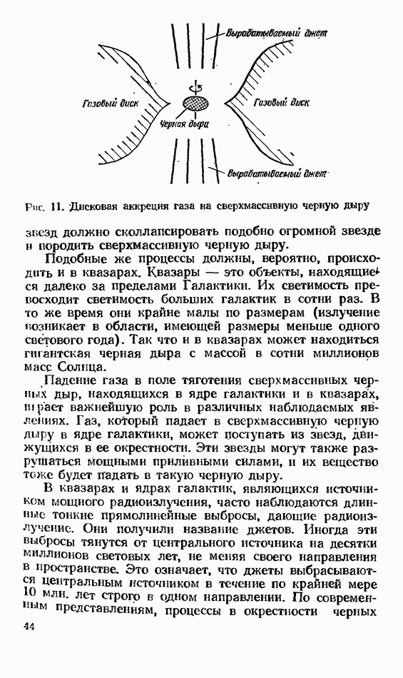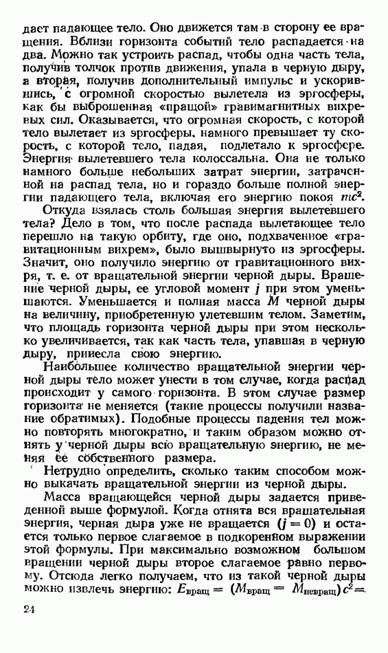 Распознанный текст, спецсимволы и формулы могут содержать ошибки, поэтому с корректным вариантом рекомендуем ознакомиться на отсканированных изображениях учебника выше Также, советуем воспользоваться поиском по сайту, мы уверены, что вы сможете найти больше информации по нужной Вам тематике ДЛЯ СТУДЕНТОВ И ШКОЛЬНИКОВ ЕСТЬZADANIA.TO АККРЕЦИЯ ГАЗА ЧЕРНОЙ ДЫРОЙНельзя ли у частицы, кружащей вокруг черной дыры, отбирать энергию не в виде трудно уловимых гравитационных волн, а каким-либо другим способом, который позволил бы легче использовать отводимую энергию? Такой способ есть. Более того, он, вероятно, реально осуществляется в природе. Речь идет о движении частиц газа вокруг черной дыры. Если кружить вокруг черной дыры будут слои газа, то трение их друг от друга приведет к разогреву, выделению тепловой энергии, которая будет высвечиваться в Окружающее пространство в виде электромагнитных волн. Представим себе тесную двойную систему, одна из компонент которой является умершей звездой, превратившейся в черную дыру, а вторая компонента нормальная звезда-гигант с раздувшейся газовой оболочкой. Обе компоненты совершают орбитальное движение под действием взаимных сил тяготения. Газ из раздувающейся оболочки звезды-гиганта будет под действием тяготения течь к черной дыре. Перетекающий газ не может просто упасть в черную дыру. Из-за орбитального движения компонент двойной системы частицы газа имеют угловой момент относительно черной дыры. Поэтому, приближаясь к ней, слои газа будут закручиваться, образуя диск. Частички газа движутся при этом почти точно по круговым орбитам, наподобие маленьких планет. Однако имеется очень существенное отличие в движении газа от движения изолированных тел по круговым орбитам вокруг тяготеющего центра. Слои газа, движущиеся на разных расстояниях с разной угловой скоростью, испытывают трение. Это ведет к двум эффектам. Во-первых, газ нагревается, происходит переход кинетической энергии орбитального движения частиц в тепло, затем в излучаемую газом световую энергию. Во-вторых, из-за трения происходит постепенная перекачка углового момента от внутренних частей диска к наружным, где этот угловой момент вместе с небольшой частью газа, поступающего в диск, выбрасывается из системы. Рассмотренные процессы ведут к тому, что слои газа в диске, постепенно теряя кинетическую энергию и момент, уменьшают радиусы своих орбит, приближаясь к черной дыре по очень пологой спирали. Если для изолированного тела на круговой орбите, рассмотренного в предыдущем параграфе, энергия и моменты отводились гравитационными волнами и процесс шел очень медленно, то здесь дело идет несравненно быстрее. Наконец, слои газа достигают последней устойчивой круговой орбиты вокруг черной дыры. Дальше уже орбитальное движение невозможно, и газ сваливается вчерную дыру, у внутренней кромки диска газ должен разогреться, как показывают расчеты, до температуры десять миллионов градусов и даже больше. При этом он будет излучать рентгеновские лучи. Следовательно, черные дыры во Вселенной можно искать как рентгеновские источники в составе тесных двойных звездных систем. Именно так предлагали искать черные дыры в 1964 г. академик  В начале 70-х годов с помощью американского специализированного рентгеновского спутника были открыты мног