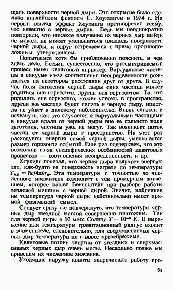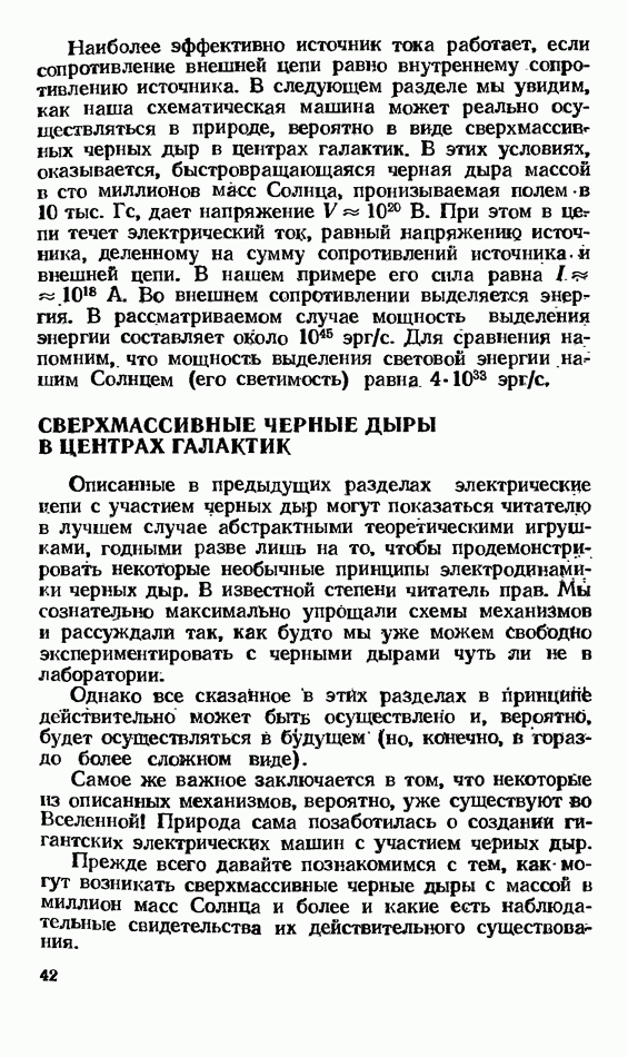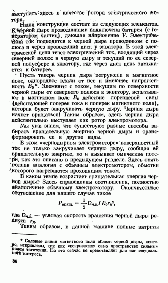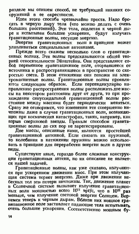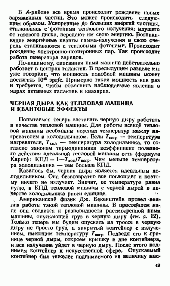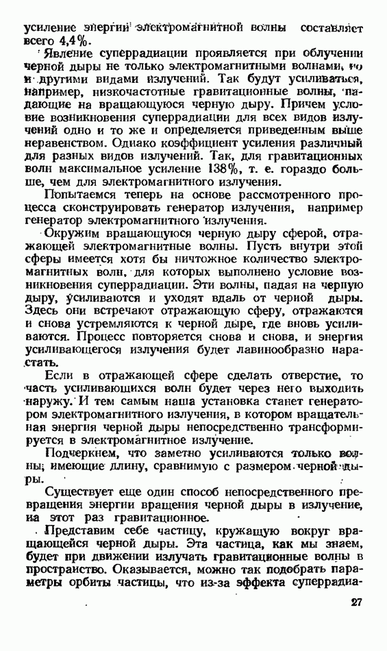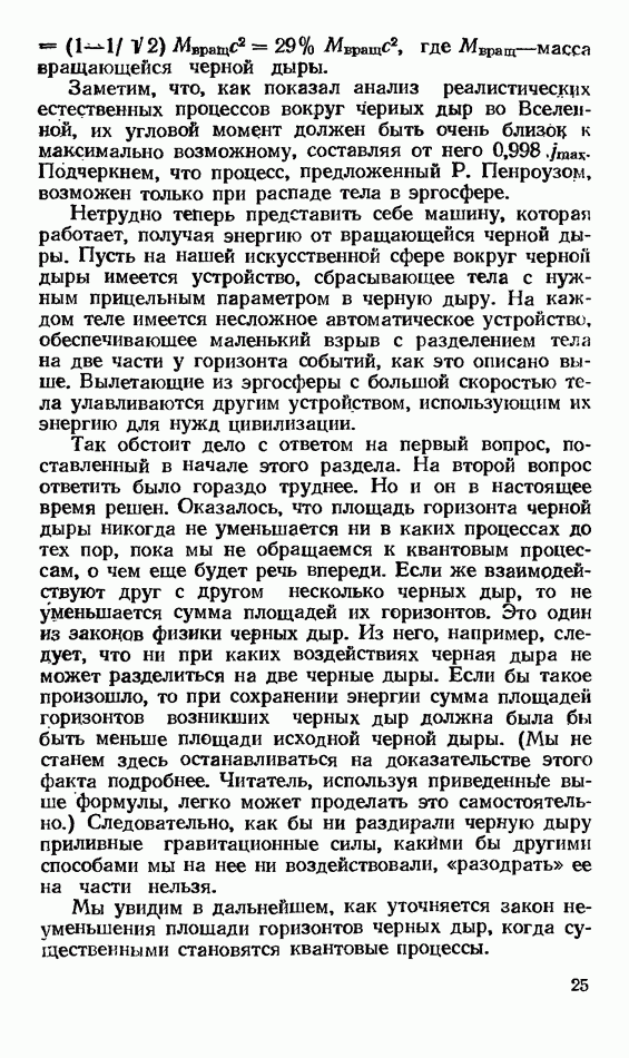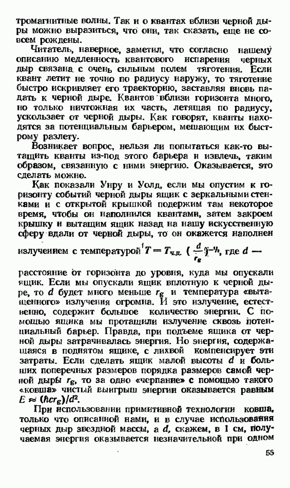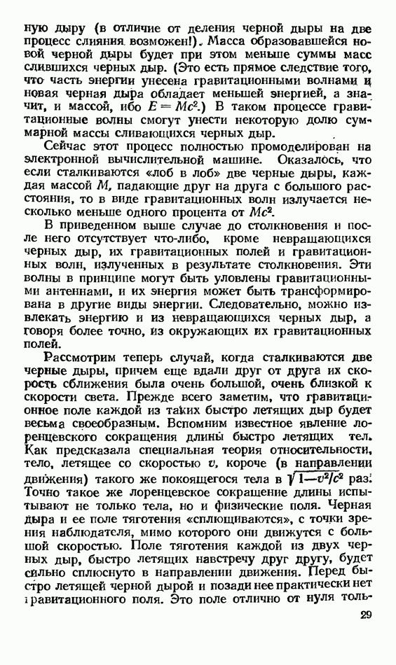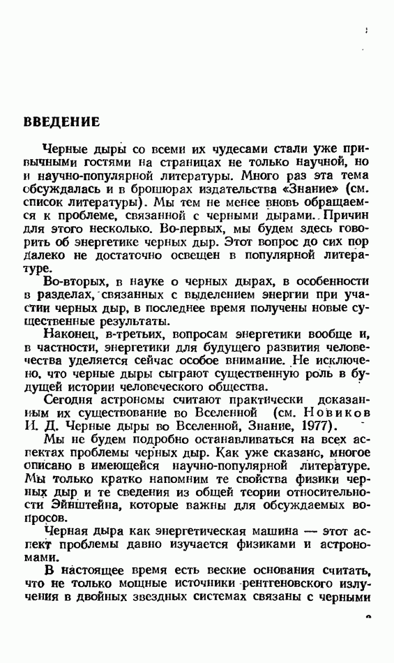 Распознанный текст, спецсимволы и формулы могут содержать ошибки, поэтому с корректным вариантом рекомендуем ознакомиться на отсканированных изображениях учебника выше Также, советуем воспользоваться поиском по сайту, мы уверены, что вы сможете найти больше информации по нужной Вам тематике ДЛЯ СТУДЕНТОВ И ШКОЛЬНИКОВ ЕСТЬZADANIA.TO АККРЕЦИЯ ГАЗА ЧЕРНОЙ ДЫРОЙНельзя ли у частицы, кружащей вокруг черной дыры, отбирать энергию не в виде трудно уловимых гравитационных волн, а каким-либо другим способом, который позволил бы легче использовать отводимую энергию? Такой способ есть. Более того, он, вероятно, реально осуществляется в природе. Речь идет о движении частиц газа вокруг черной дыры. Если кружить вокруг черной дыры будут слои газа, то трение их друг от друга приведет к разогреву, выделению тепловой энергии, которая будет высвечиваться в Окружающее пространство в виде электромагнитных волн. Представим себе тесную двойную систему, одна из компонент которой является умершей звездой, превратившейся в черную дыру, а вторая компонента нормальная звезда-гигант с раздувшейся газовой оболочкой. Обе компоненты совершают орбитальное движение под действием взаимных сил тяготения. Газ из раздувающейся оболочки звезды-гиганта будет под действием тяготения течь к черной дыре. Перетекающий газ не может просто упасть в черную дыру. Из-за орбитального движения компонент двойной системы частицы газа имеют угловой момент относительно черной дыры. Поэтому, приближаясь к ней, слои газа будут закручиваться, образуя диск. Частички газа движутся при этом почти точно по круговым орбитам, наподобие маленьких планет. Однако имеется очень существенное отличие в движении газа от движения изолированных тел по круговым орбитам вокруг тяготеющего центра. Слои газа, движущиеся на разных расстояниях с разной угловой скоростью, испытывают трение. Это ведет к двум эффектам. Во-первых, газ нагревается, происходит переход кинетической энергии орбитального движения частиц в тепло, затем в излучаемую газом световую энергию. Во-вторых, из-за трения происходит постепенная перекачка углового момента от внутренних частей диска к наружным, где этот угловой момент вместе с небольшой частью газа, поступающего в диск, выбрасывается из системы. Рассмотренные процессы ведут к тому, что слои газа в диске, постепенно теряя кинетическую энергию и момент, уменьшают радиусы своих орбит, приближаясь к черной дыре по очень пологой спирали. Если для изолированного тела на круговой орбите, рассмотренного в предыдущем параграфе, энергия и моменты отводились гравитационными волнами и процесс шел очень медленно, то здесь дело идет несравненно быстрее. Наконец, слои газа достигают последней устойчивой круговой орбиты вокруг черной дыры. Дальше уже орбитальное движение невозможно, и газ сваливается вчерную дыру, у внутренней кромки диска газ должен разогреться, как показывают расчеты, до температуры десять миллионов градусов и даже больше. При этом он будет излучать рентгеновские лучи. Следовательно, черные дыры во Вселенной можно искать как рентгеновские источники в составе тесных двойных звездных систем. Именно так предлагали искать черные дыры в 1964 г. академик  В начале 70-х годов с помощью американского специализированного рентгеновского спутника были открыты мног