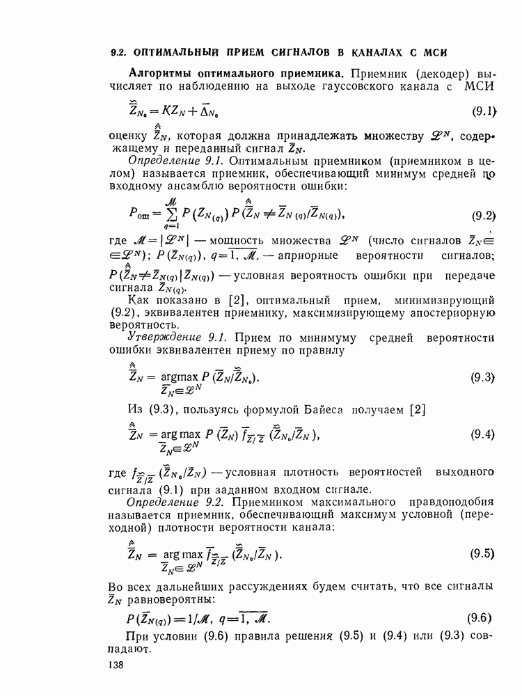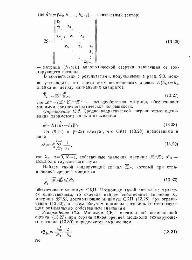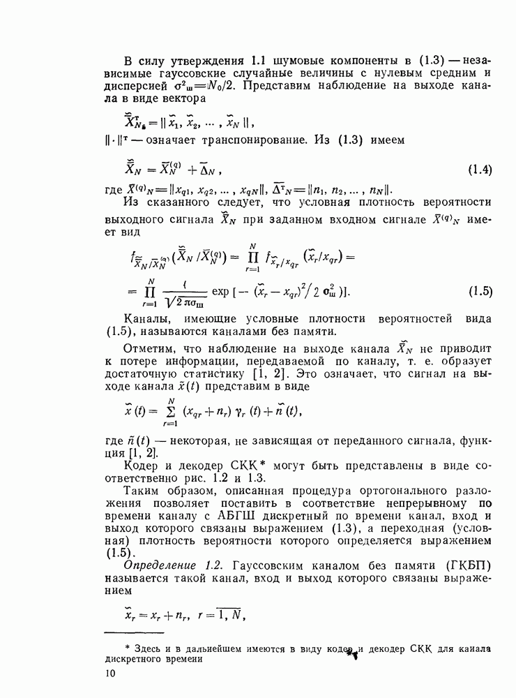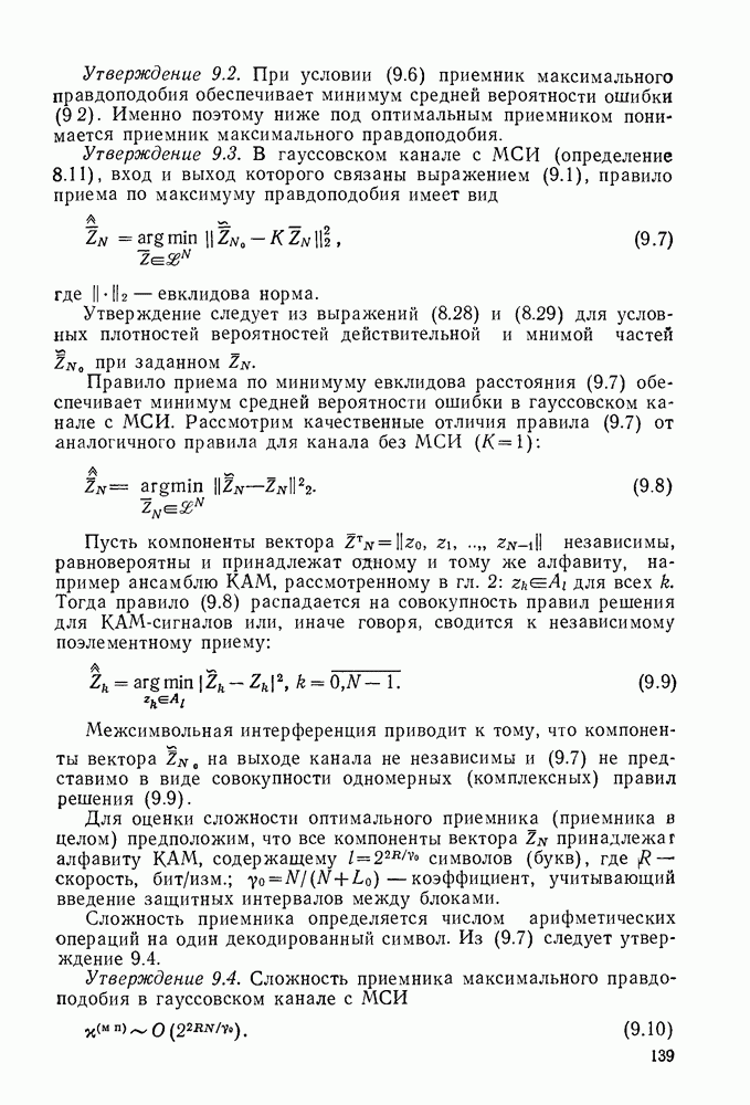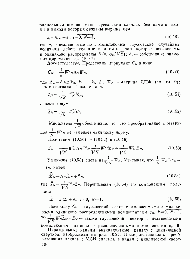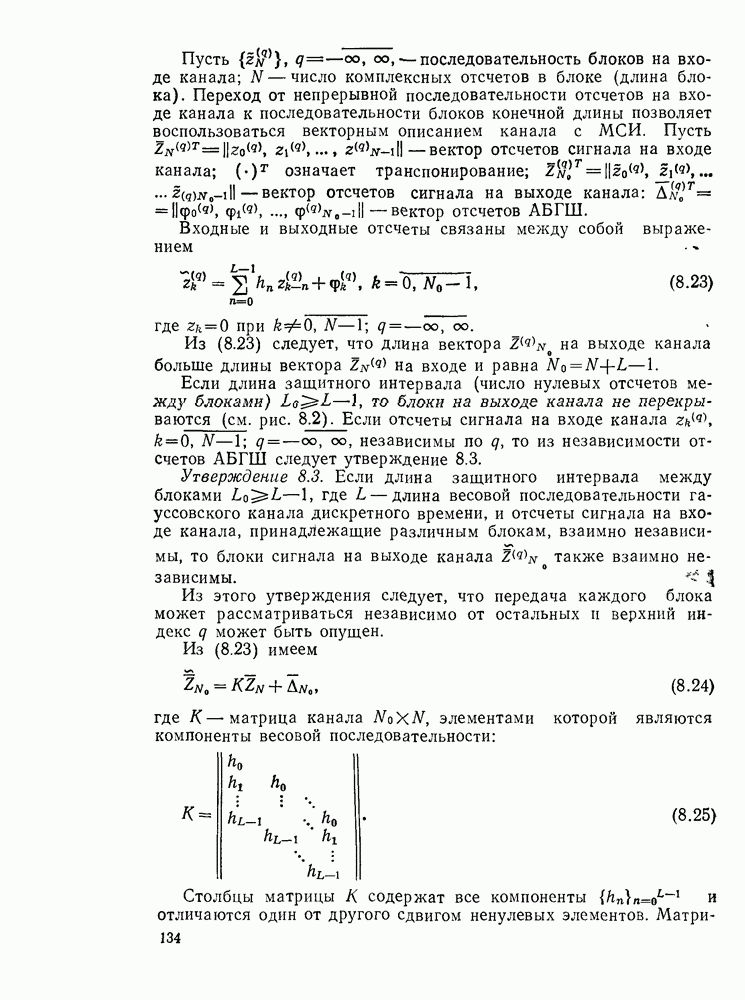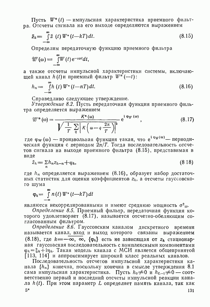 являются некоррелированными и имеют среднюю мощность Определение 8.5. Приемный фильтр, передаточная функция которого удовлетворяет (8.17), называется отсчетно-обеляющим согласованным фильтром. Определение 8.6. Гауссовским каналом дискретного времени называется канал, вход и выход которого связаны выражением (8.18), где Последовательность отсчетов импульсной характеристики канала