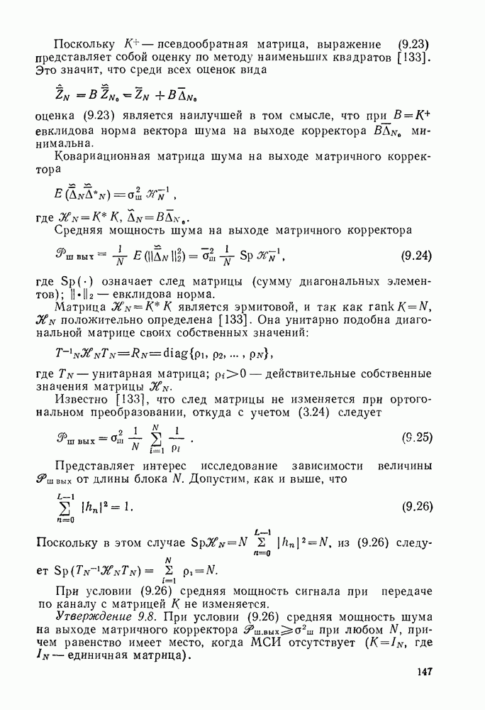 и подавлении компоненты, не лежащей в этом подпространстве, так как последняя может быть образована только шумом. Из (8.13) и (8.14) следует, что отсчеты шума на выходе согласованного фильтра являются коррелированными: