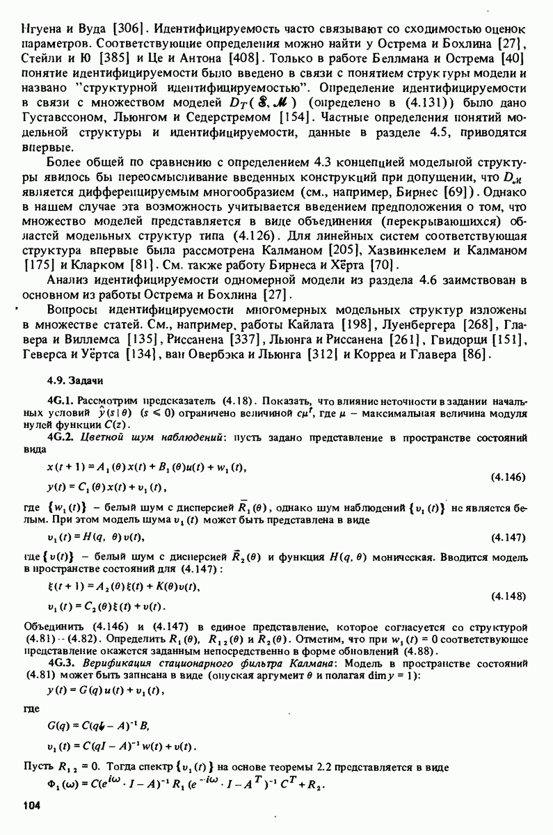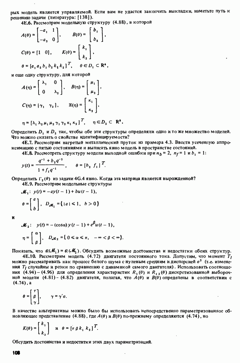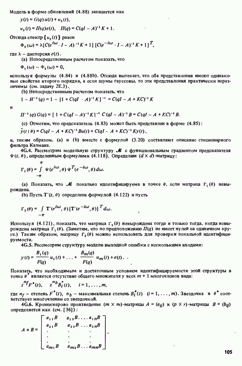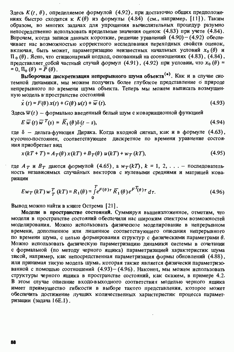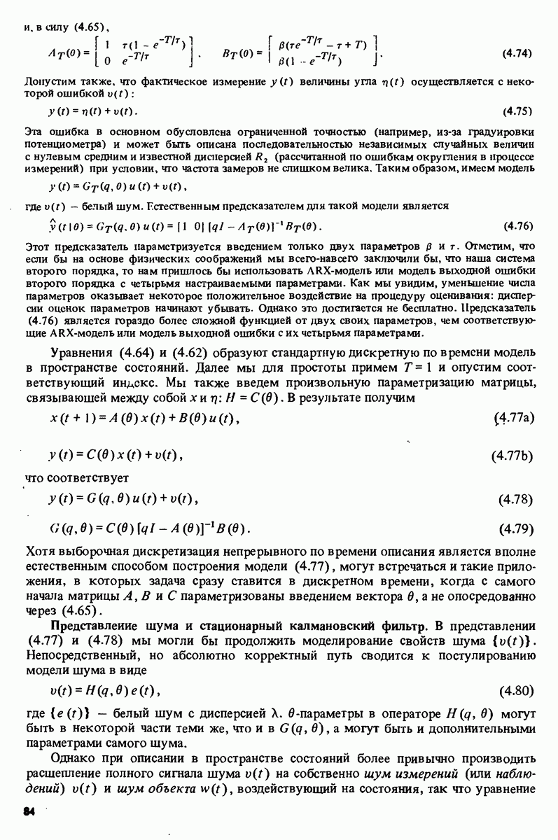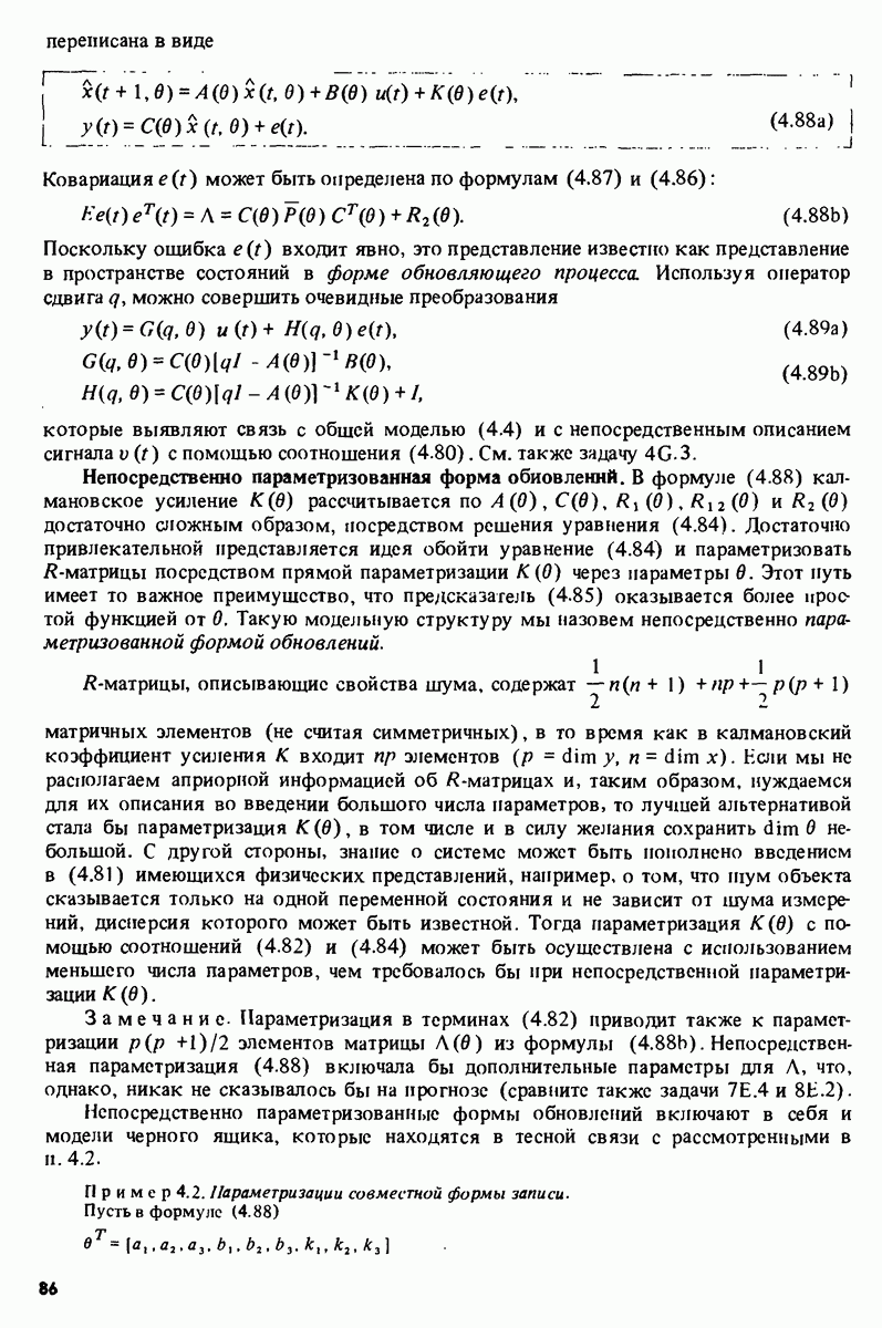 Можно использовать физическую параметризацию динамики системы в сочетании с формальной (по методу черного ящика) параметризацией характеристик шума такой, например, как непосредственная параметризация формы обновлений (4,88), или принимая такую модель шума, которая также является физически параметризованной с помощью соотношений (4.93)-(4,96). Наконец, мы можем использовать структуры черного ящика в пространстве состояний, как скажем, в примере 4.2. В этом случае описание входо-выходного соответствия моделью черного ящика имеет преимущество гибкости в выборе такого представления, которое может обеспечить достижение лучших количественных характеристик процесса параметризации (задача 16Е.1).