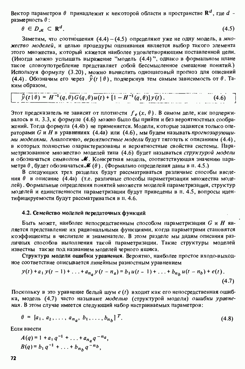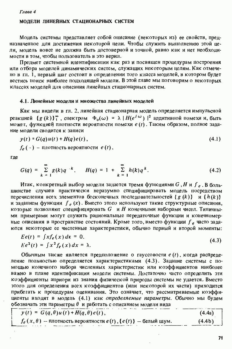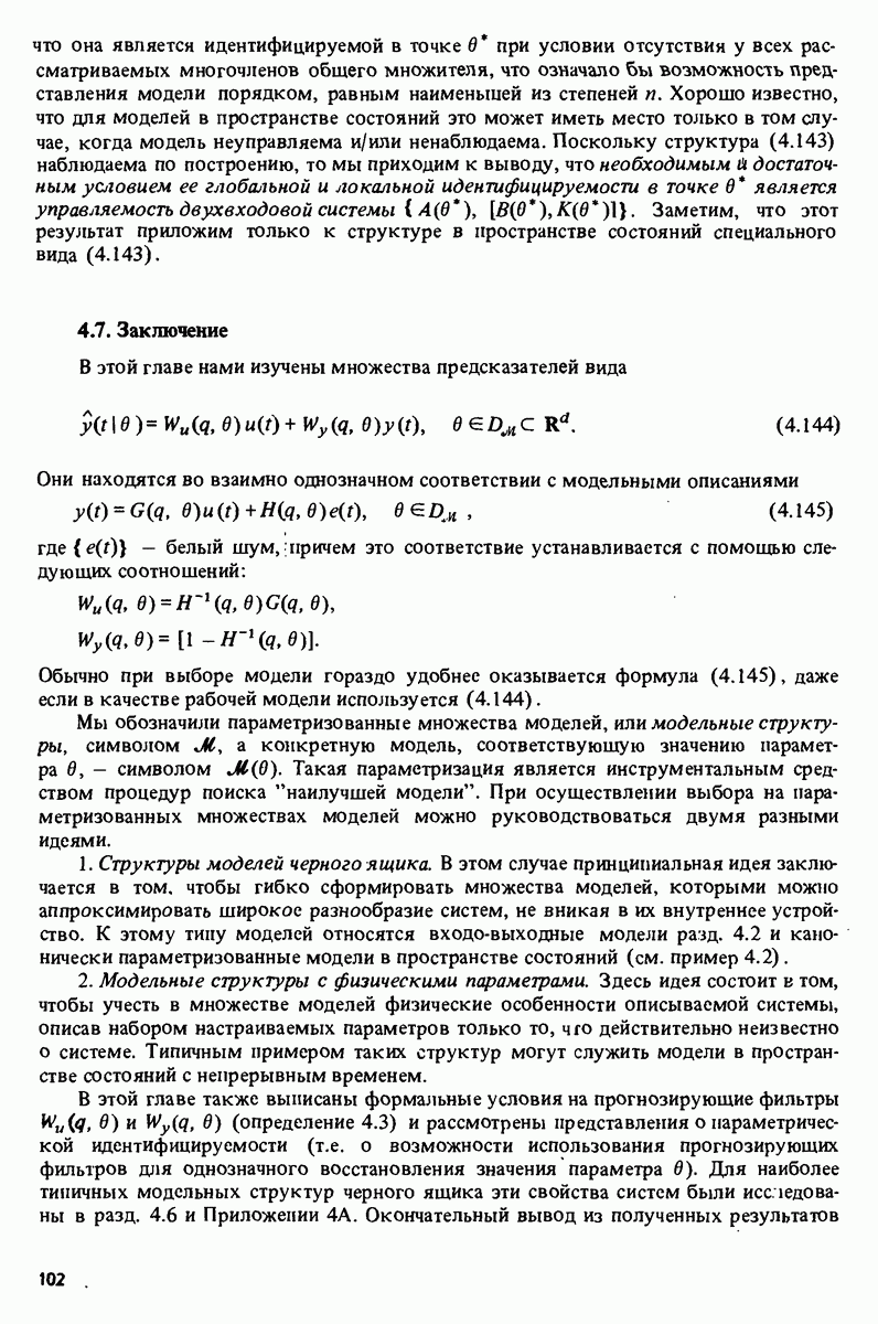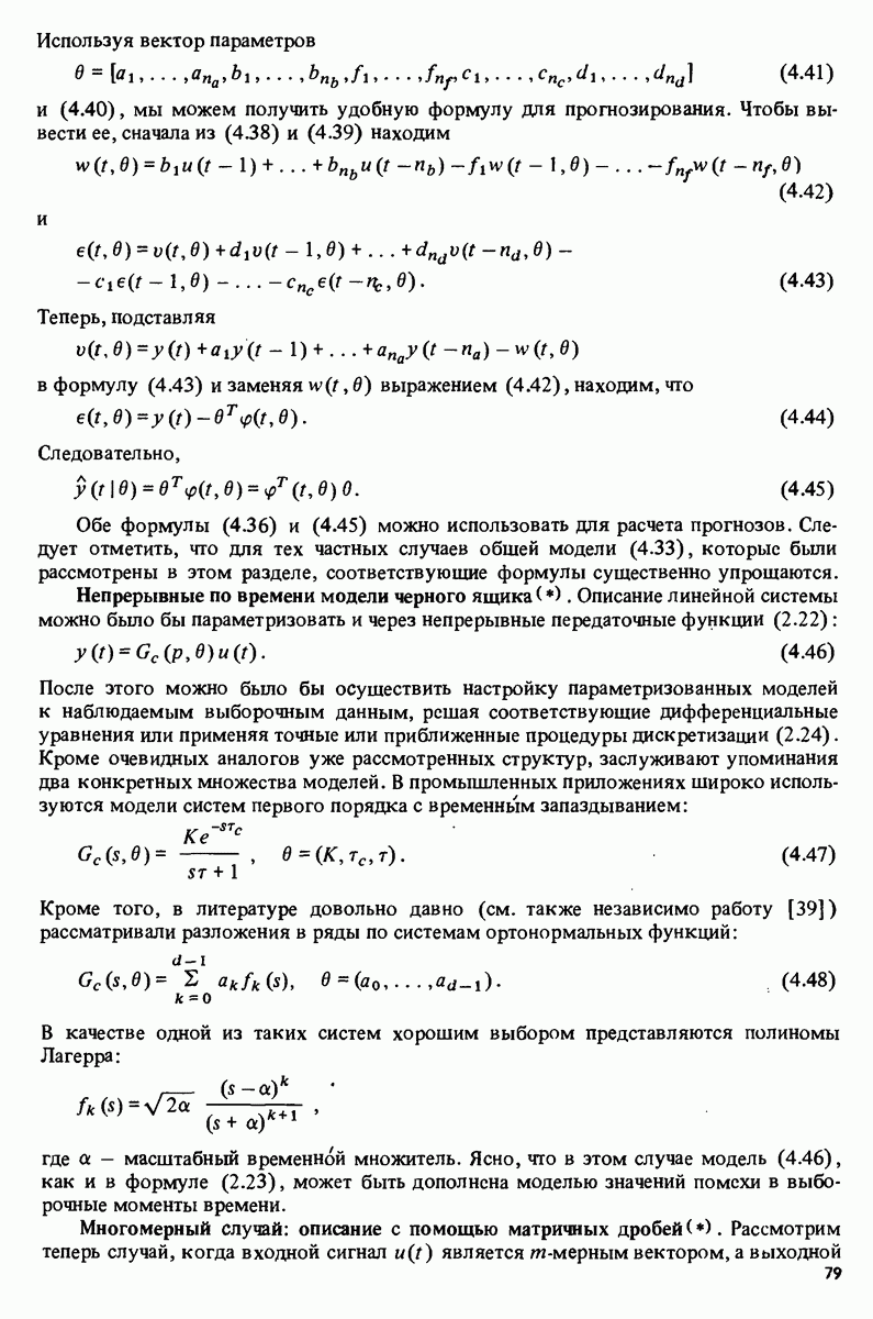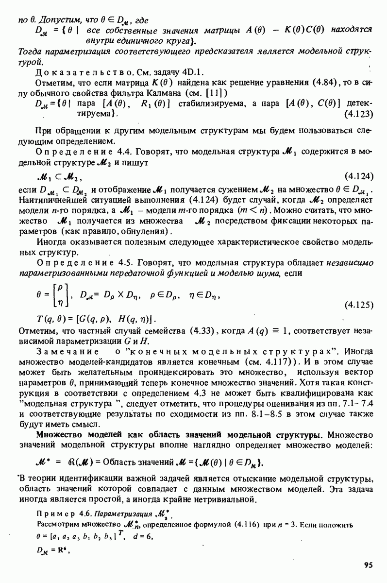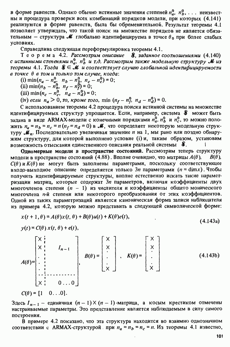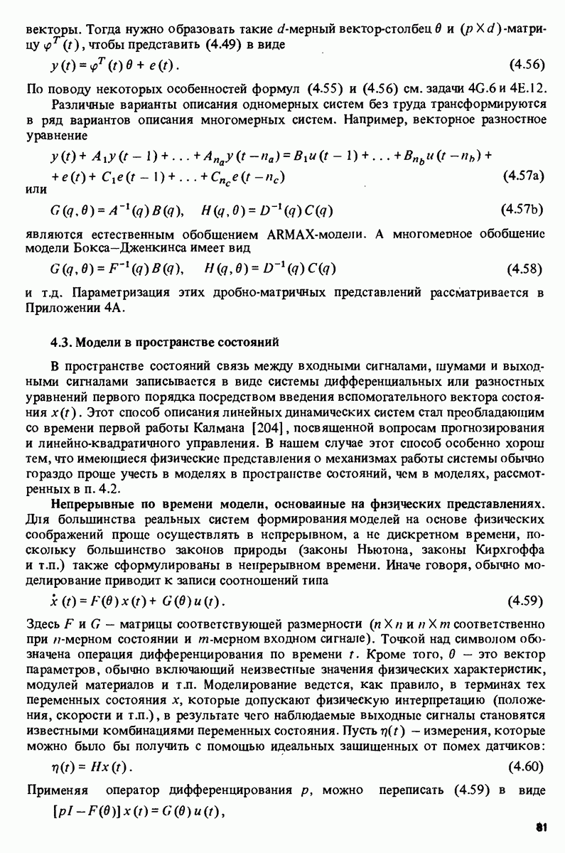 Можно использовать физическую параметризацию динамики системы в сочетании с формальной (по методу черного ящика) параметризацией характеристик шума такой, например, как непосредственная параметризация формы обновлений (4,88), или принимая такую модель шума, которая также является физически параметризованной с помощью соотношений (4.93)-(4,96). Наконец, мы можем использовать структуры черного ящика в пространстве состояний, как скажем, в примере 4.2. В этом случае описание входо-выходного соответствия моделью черного ящика имеет преимущество гибкости в выборе такого представления, которое может обеспечить достижение лучших количественных характеристик процесса параметризации (задача 16Е.1).