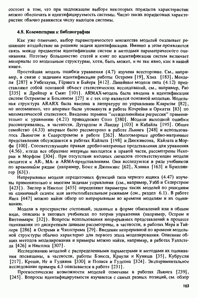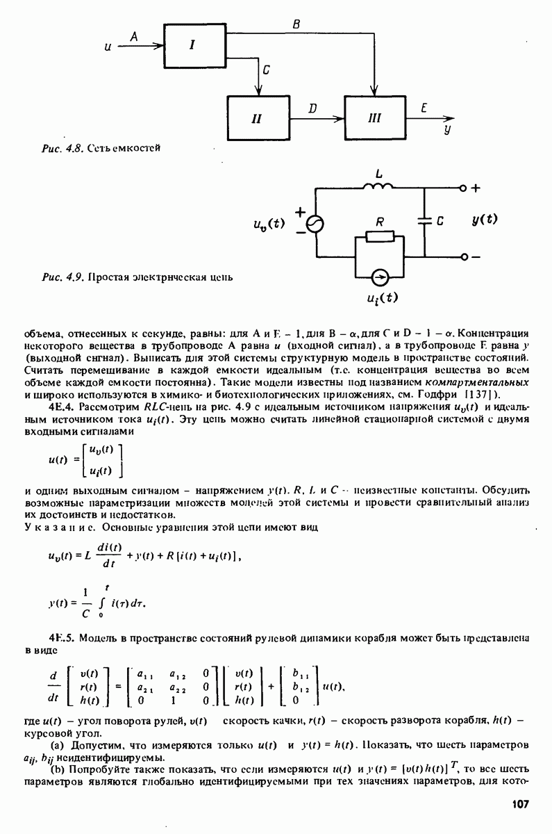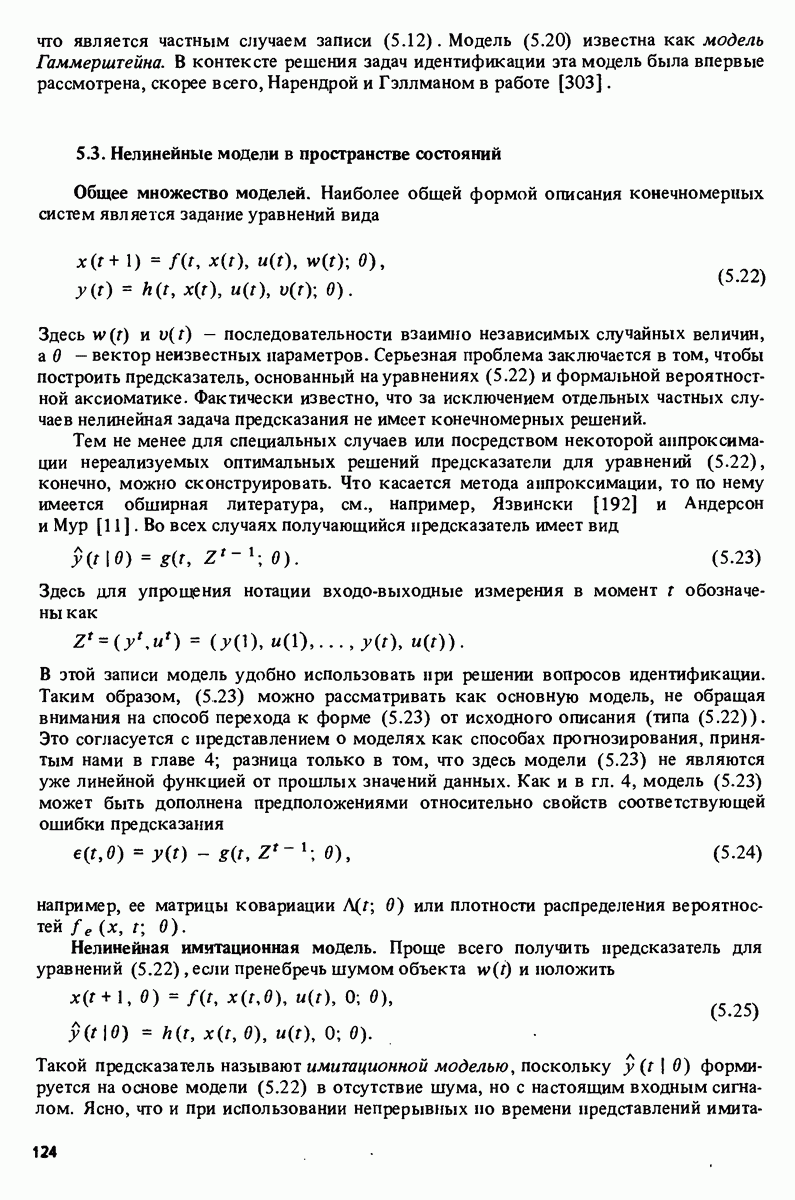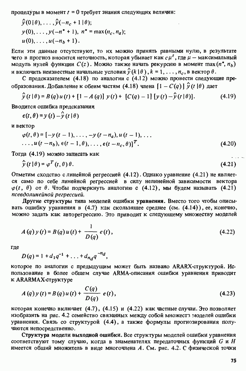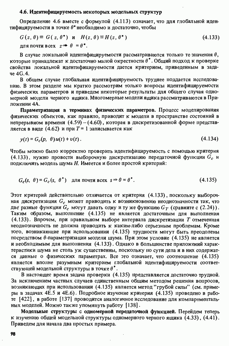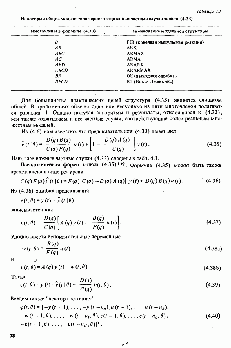 Можно использовать физическую параметризацию динамики системы в сочетании с формальной (по методу черного ящика) параметризацией характеристик шума такой, например, как непосредственная параметризация формы обновлений (4,88), или принимая такую модель шума, которая также является физически параметризованной с помощью соотношений (4.93)-(4,96). Наконец, мы можем использовать структуры черного ящика в пространстве состояний, как скажем, в примере 4.2. В этом случае описание входо-выходного соответствия моделью черного ящика имеет преимущество гибкости в выборе такого представления, которое может обеспечить достижение лучших количественных характеристик процесса параметризации (задача 16Е.1).