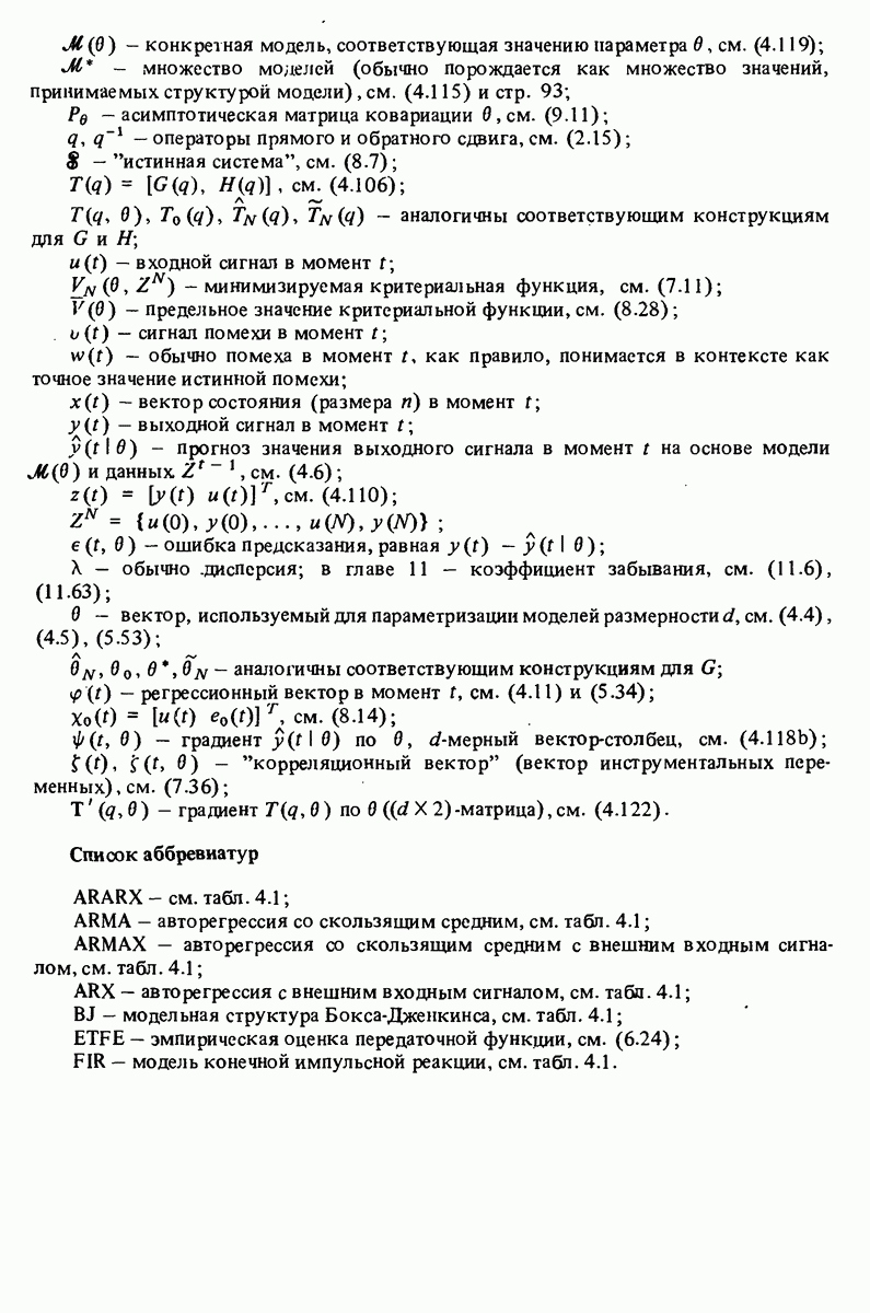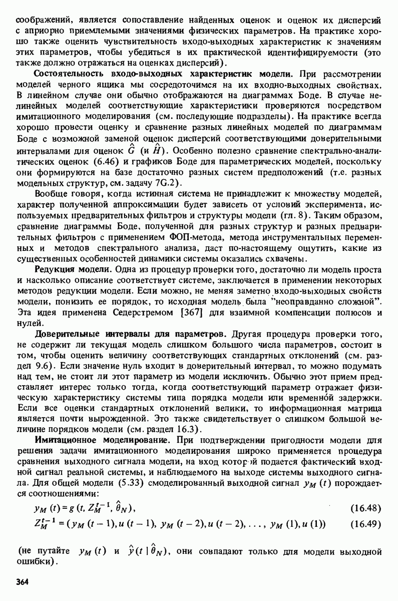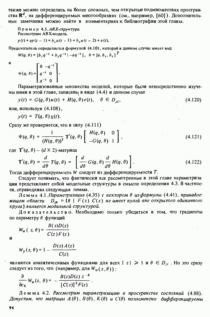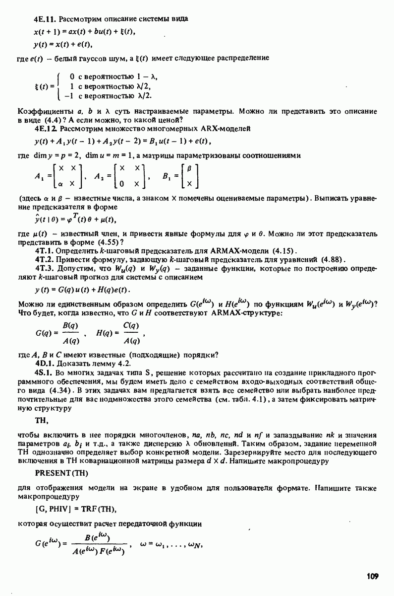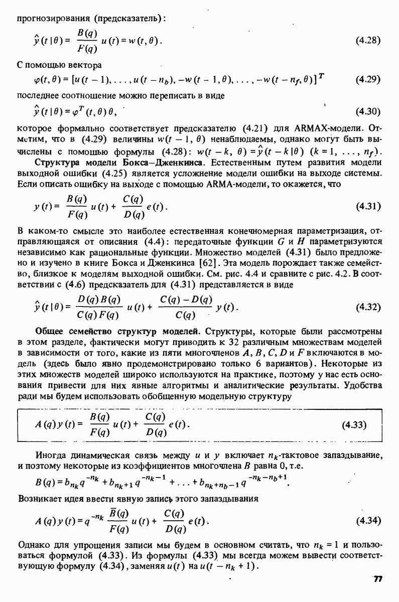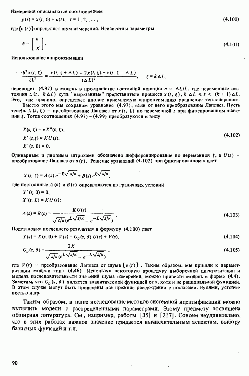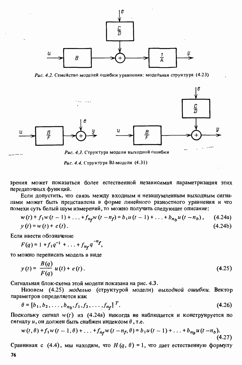 Можно использовать физическую параметризацию динамики системы в сочетании с формальной (по методу черного ящика) параметризацией характеристик шума такой, например, как непосредственная параметризация формы обновлений (4,88), или принимая такую модель шума, которая также является физически параметризованной с помощью соотношений (4.93)-(4,96). Наконец, мы можем использовать структуры черного ящика в пространстве состояний, как скажем, в примере 4.2. В этом случае описание входо-выходного соответствия моделью черного ящика имеет преимущество гибкости в выборе такого представления, которое может обеспечить достижение лучших количественных характеристик процесса параметризации (задача 16Е.1).