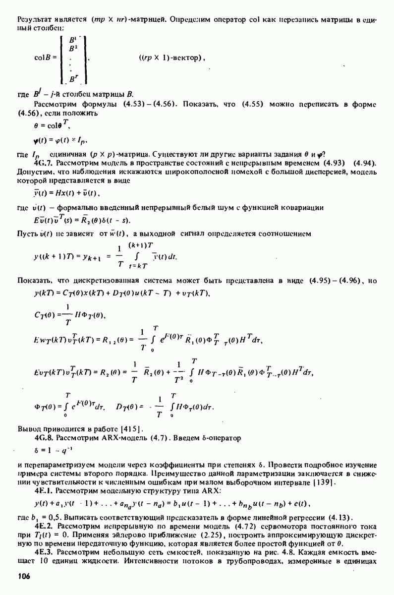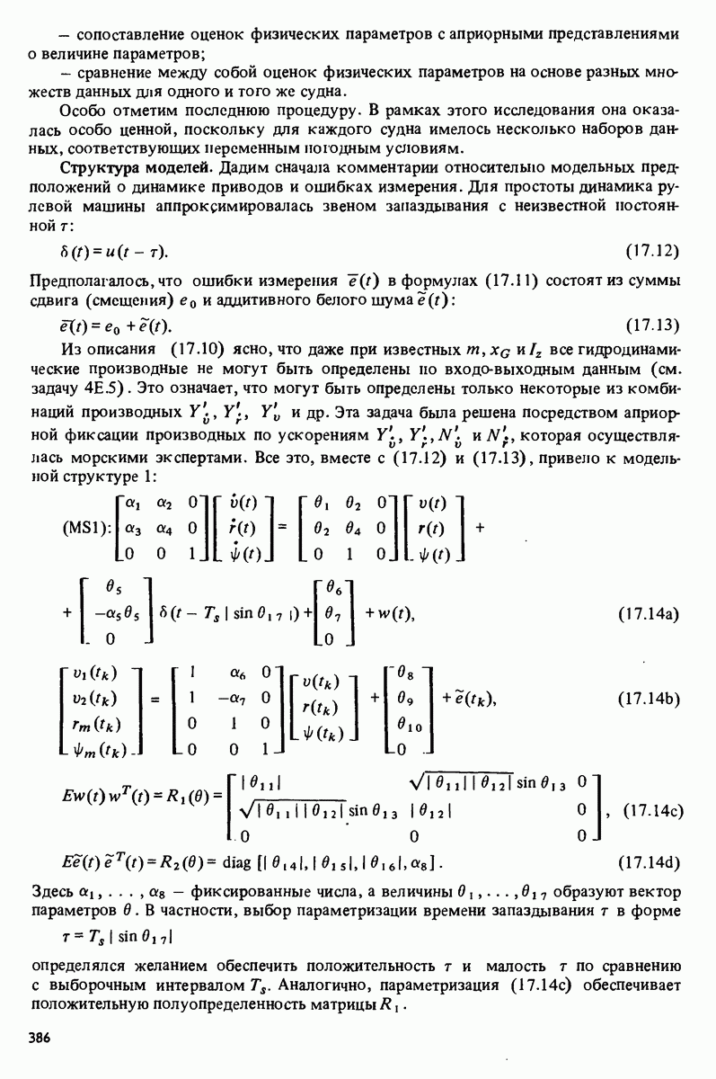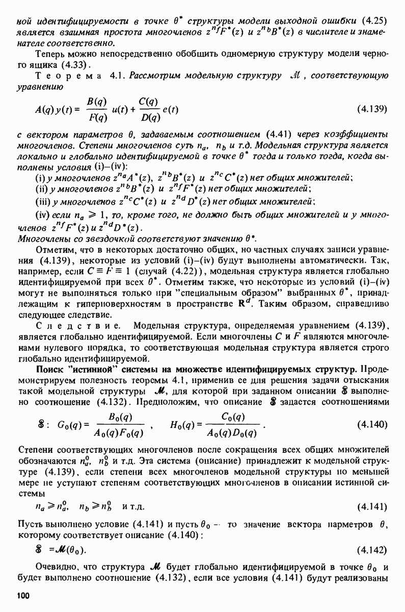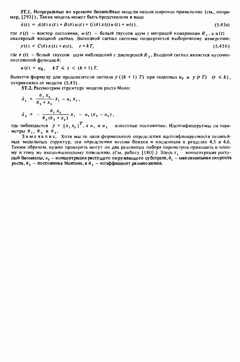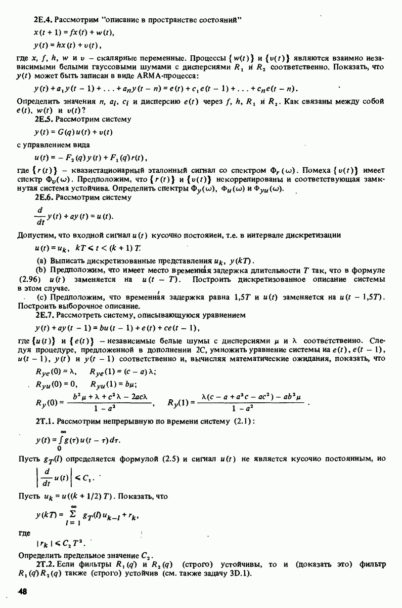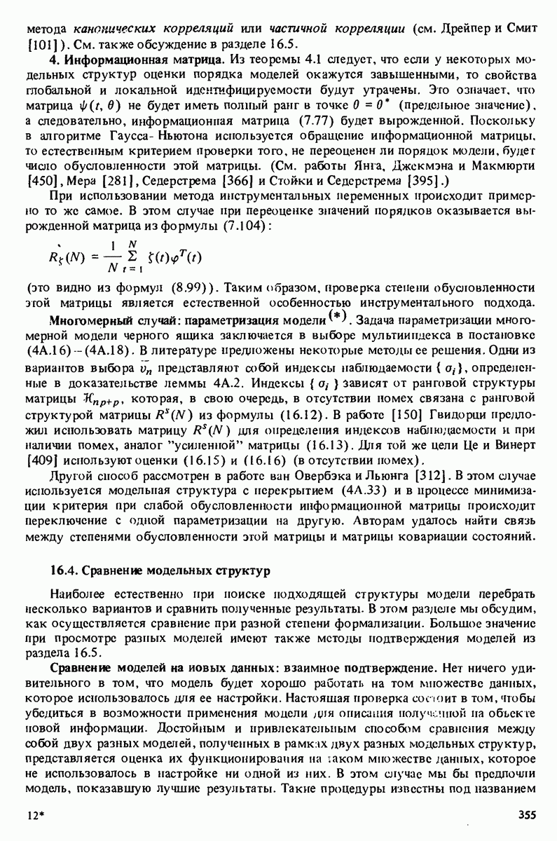 Можно использовать физическую параметризацию динамики системы в сочетании с формальной (по методу черного ящика) параметризацией характеристик шума такой, например, как непосредственная параметризация формы обновлений (4,88), или принимая такую модель шума, которая также является физически параметризованной с помощью соотношений (4.93)-(4,96). Наконец, мы можем использовать структуры черного ящика в пространстве состояний, как скажем, в примере 4.2. В этом случае описание входо-выходного соответствия моделью черного ящика имеет преимущество гибкости в выборе такого представления, которое может обеспечить достижение лучших количественных характеристик процесса параметризации (задача 16Е.1).