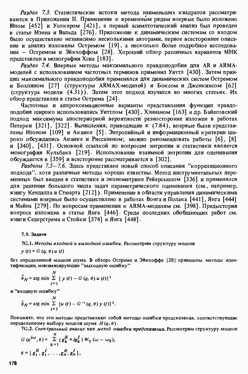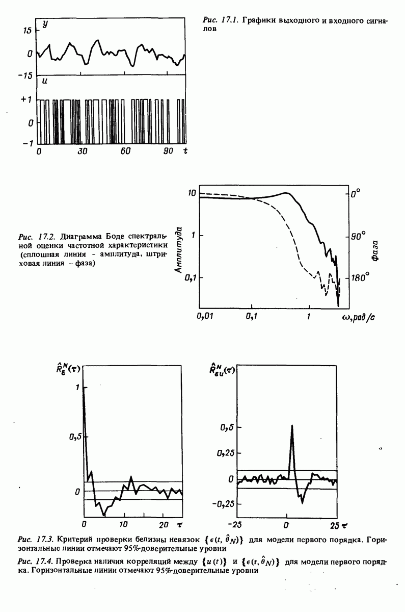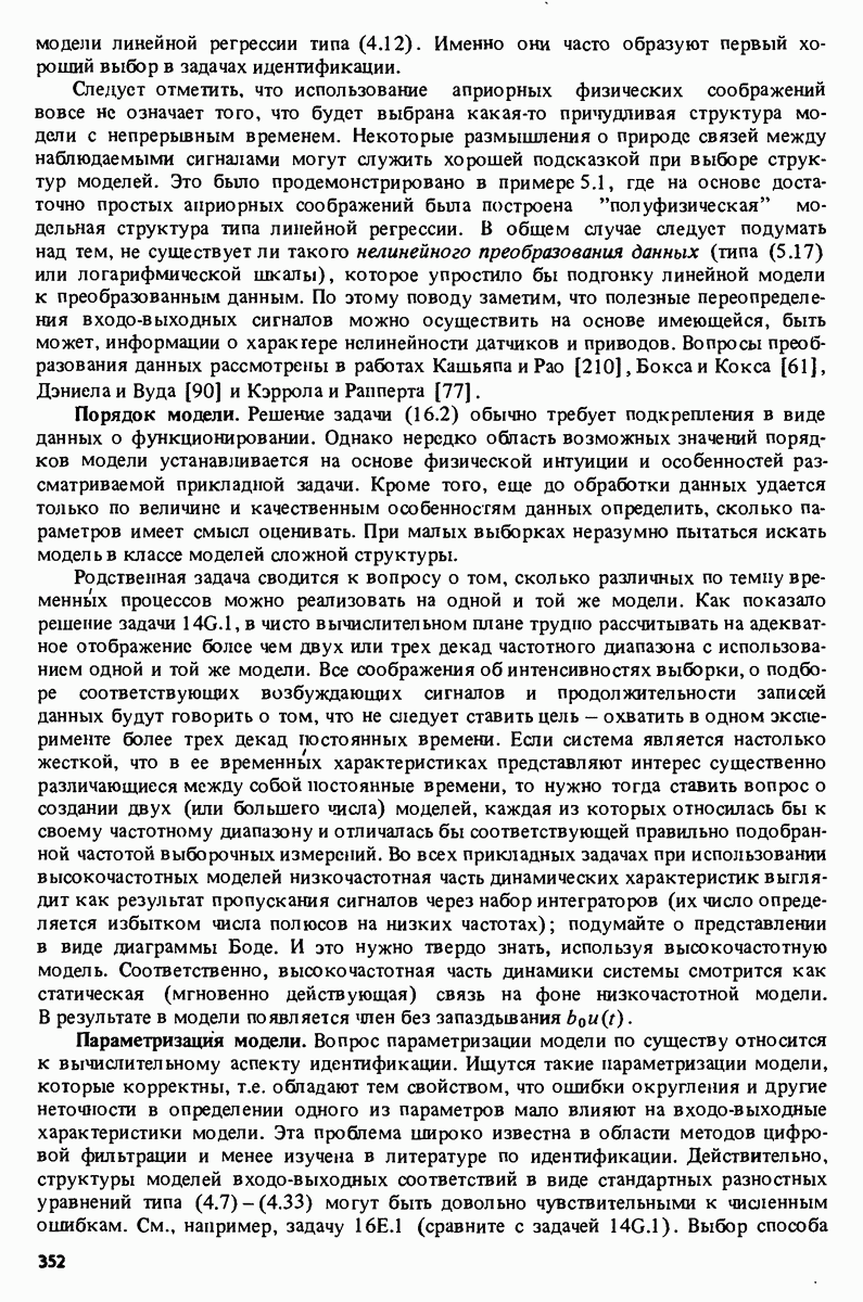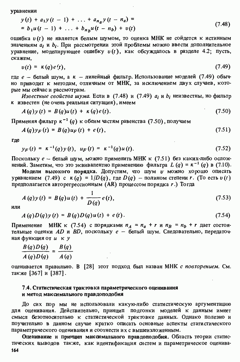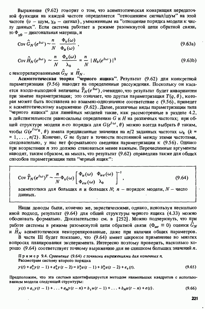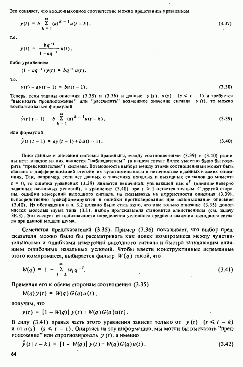 Можно использовать физическую параметризацию динамики системы в сочетании с формальной (по методу черного ящика) параметризацией характеристик шума такой, например, как непосредственная параметризация формы обновлений (4,88), или принимая такую модель шума, которая также является физически параметризованной с помощью соотношений (4.93)-(4,96). Наконец, мы можем использовать структуры черного ящика в пространстве состояний, как скажем, в примере 4.2. В этом случае описание входо-выходного соответствия моделью черного ящика имеет преимущество гибкости в выборе такого представления, которое может обеспечить достижение лучших количественных характеристик процесса параметризации (задача 16Е.1).