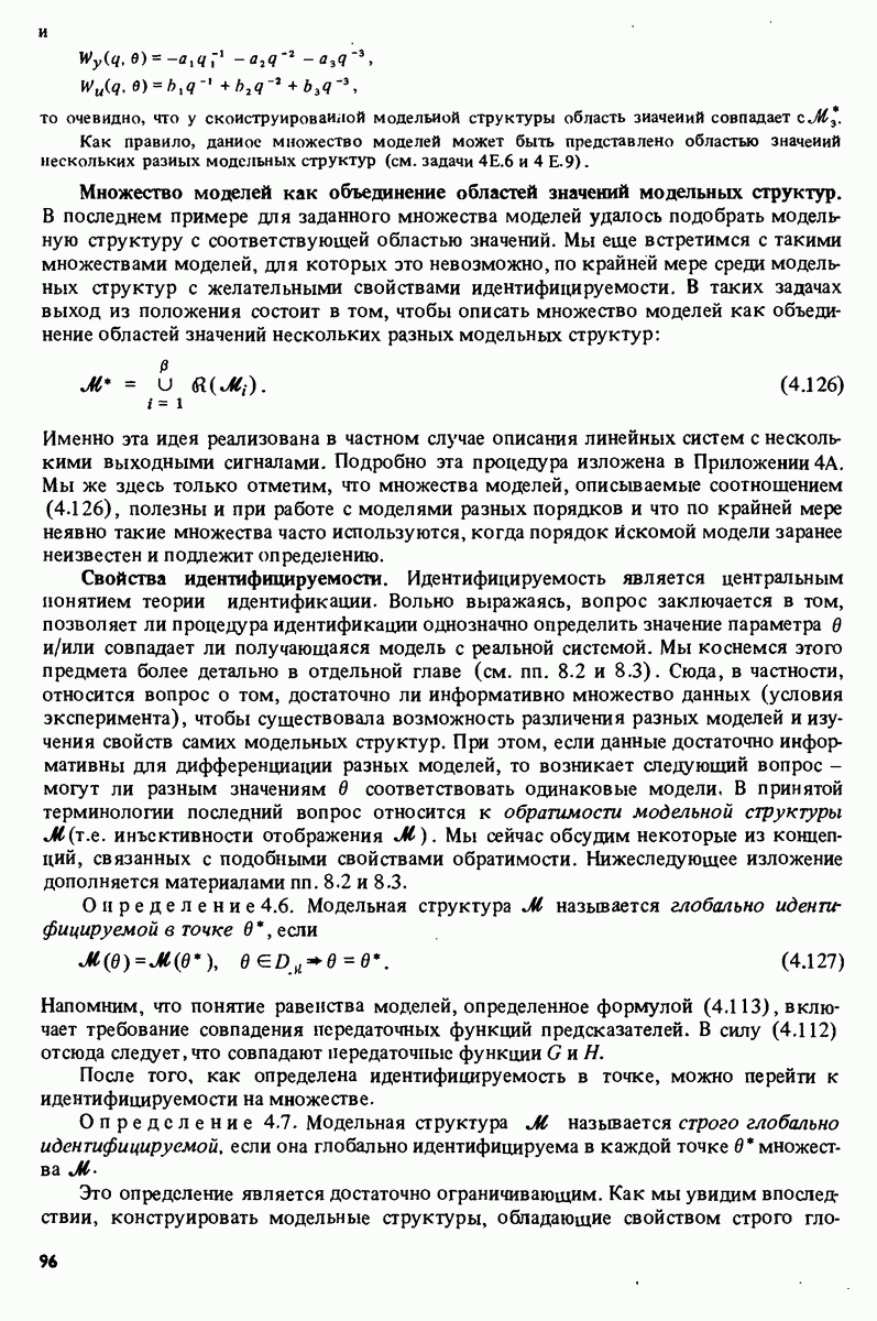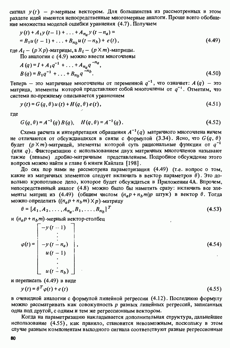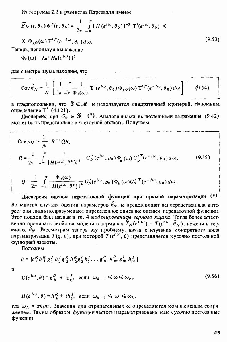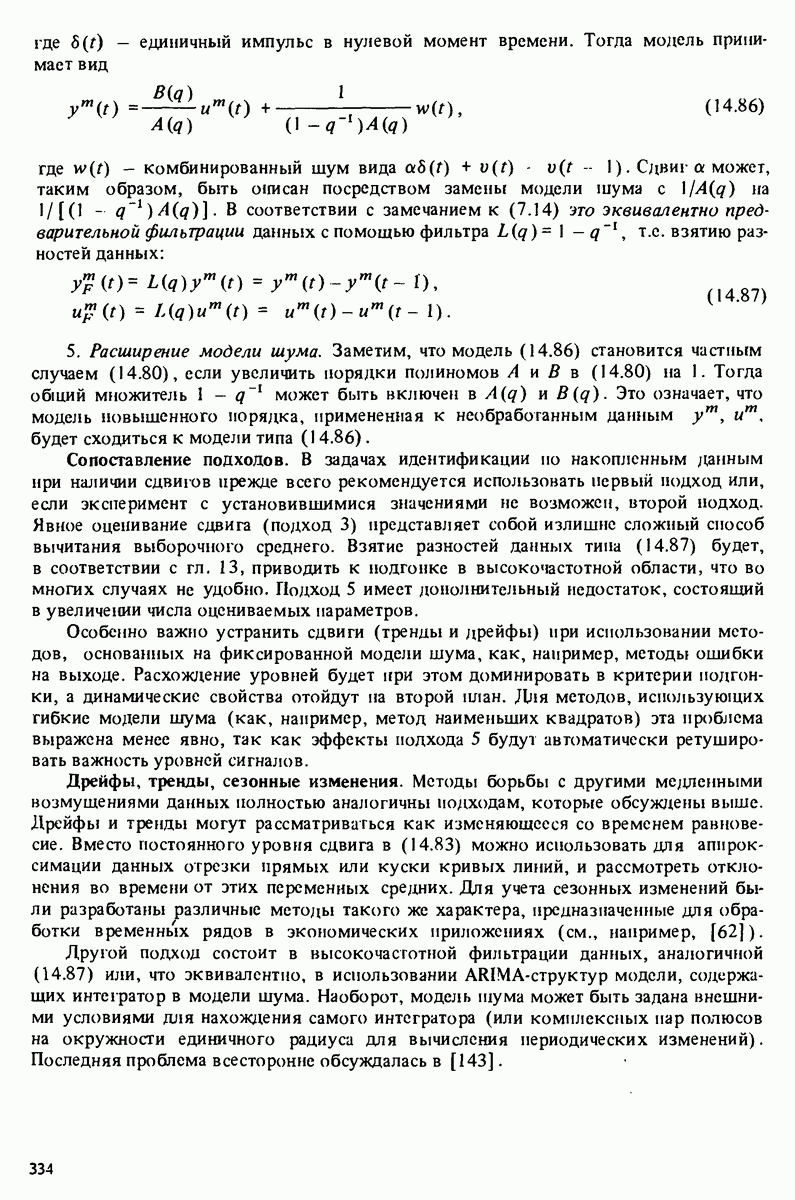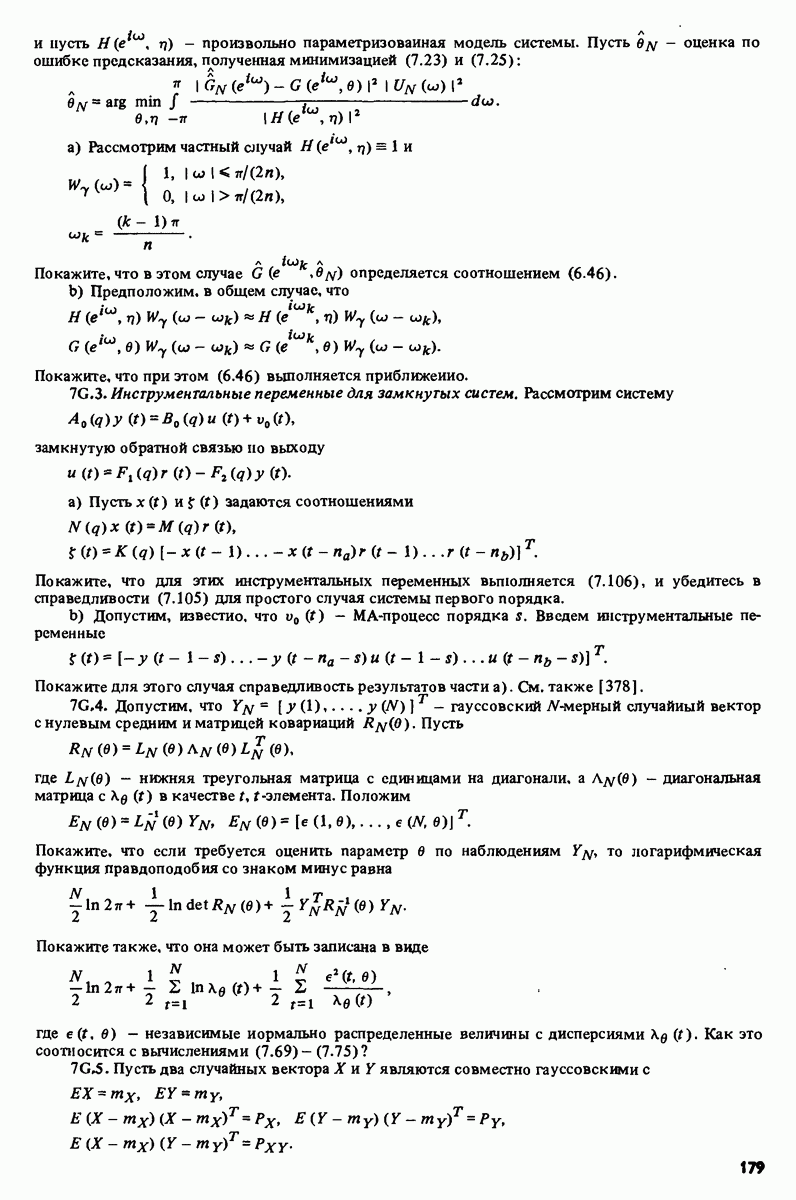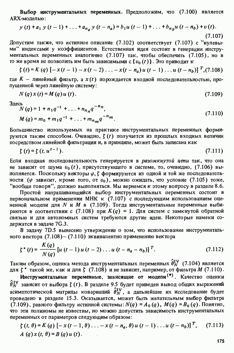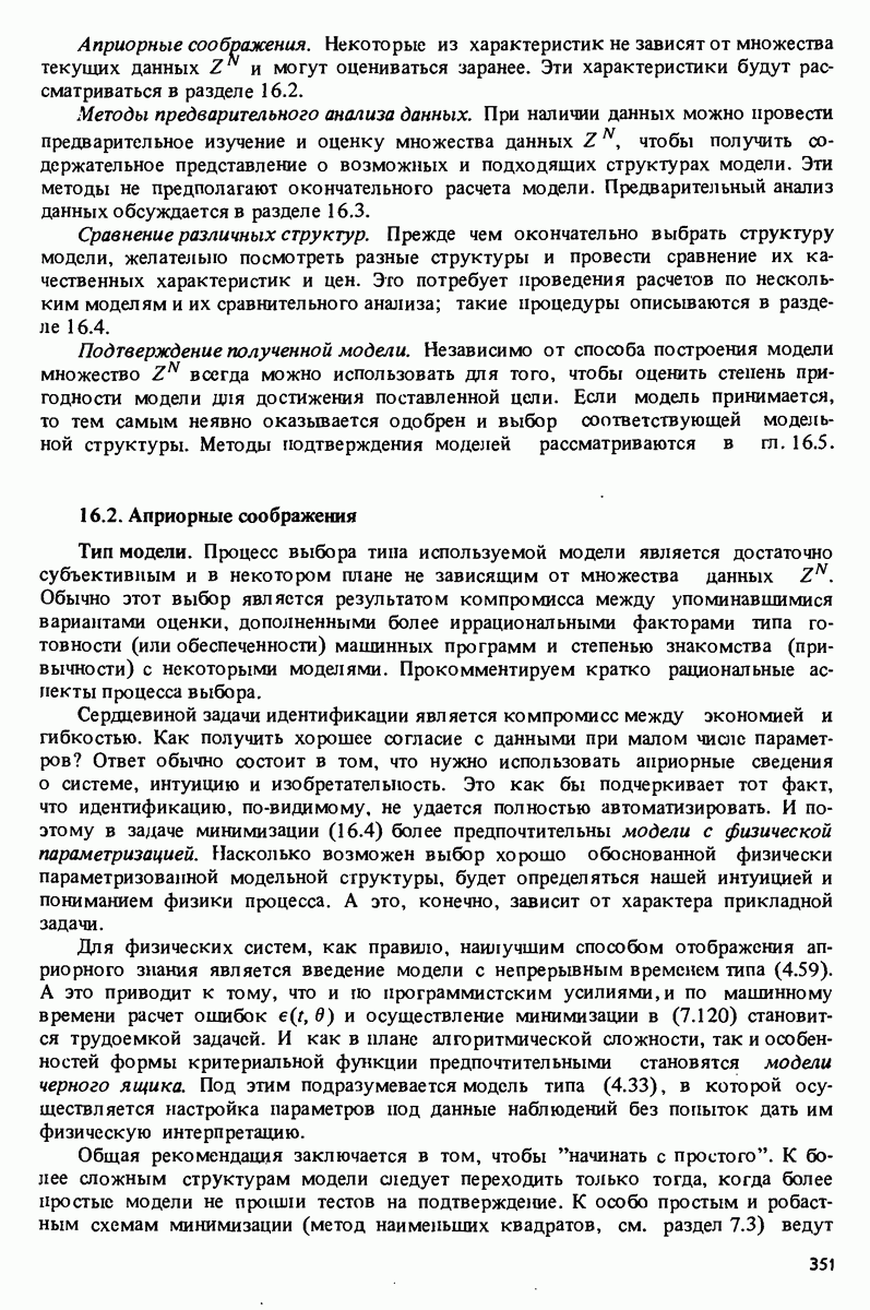 Можно использовать физическую параметризацию динамики системы в сочетании с формальной (по методу черного ящика) параметризацией характеристик шума такой, например, как непосредственная параметризация формы обновлений (4,88), или принимая такую модель шума, которая также является физически параметризованной с помощью соотношений (4.93)-(4,96). Наконец, мы можем использовать структуры черного ящика в пространстве состояний, как скажем, в примере 4.2. В этом случае описание входо-выходного соответствия моделью черного ящика имеет преимущество гибкости в выборе такого представления, которое может обеспечить достижение лучших количественных характеристик процесса параметризации (задача 16Е.1).