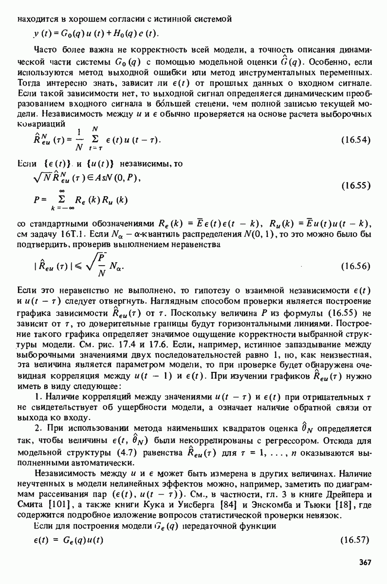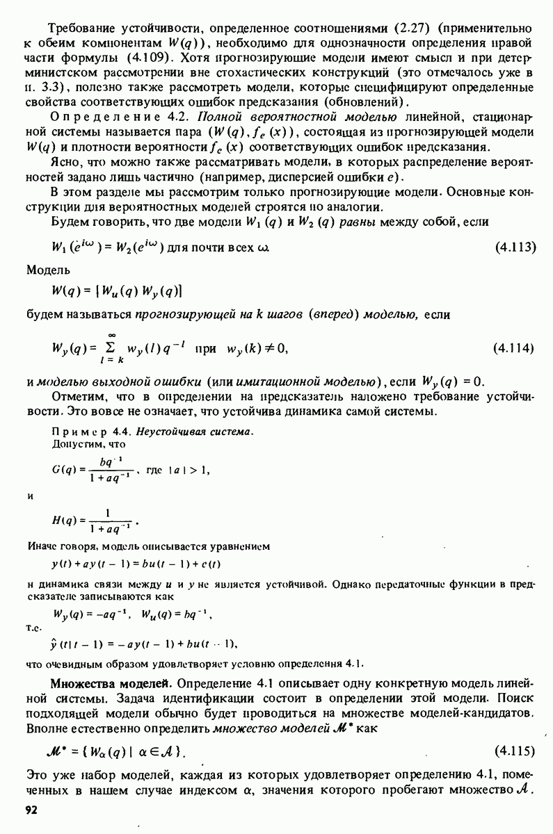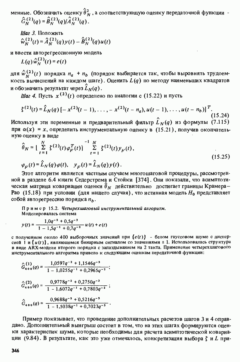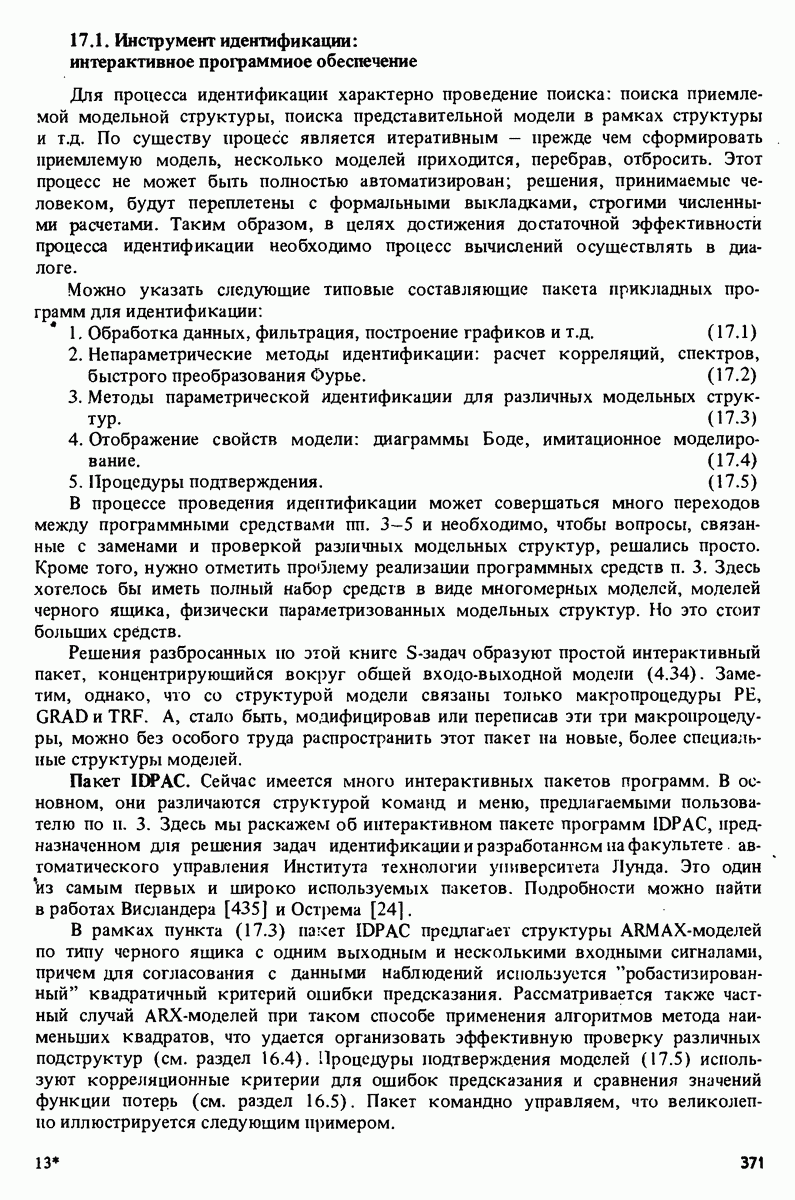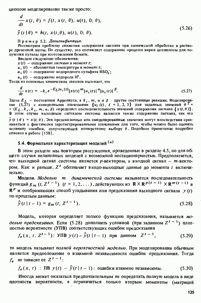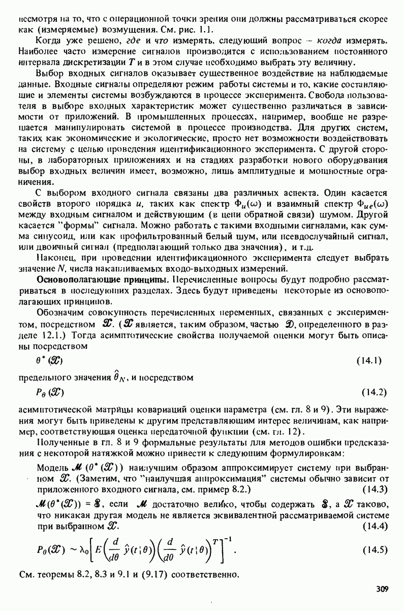 Можно использовать физическую параметризацию динамики системы в сочетании с формальной (по методу черного ящика) параметризацией характеристик шума такой, например, как непосредственная параметризация формы обновлений (4,88), или принимая такую модель шума, которая также является физически параметризованной с помощью соотношений (4.93)-(4,96). Наконец, мы можем использовать структуры черного ящика в пространстве состояний, как скажем, в примере 4.2. В этом случае описание входо-выходного соответствия моделью черного ящика имеет преимущество гибкости в выборе такого представления, которое может обеспечить достижение лучших количественных характеристик процесса параметризации (задача 16Е.1).