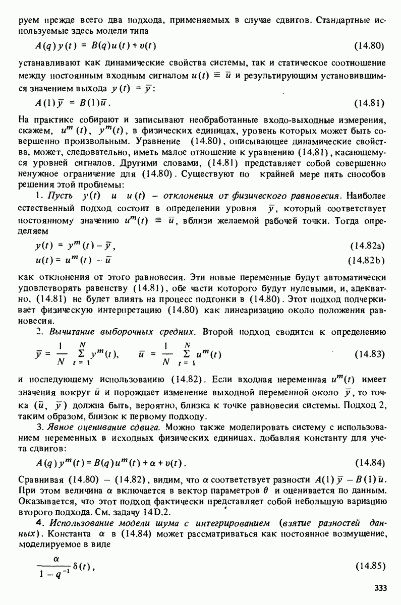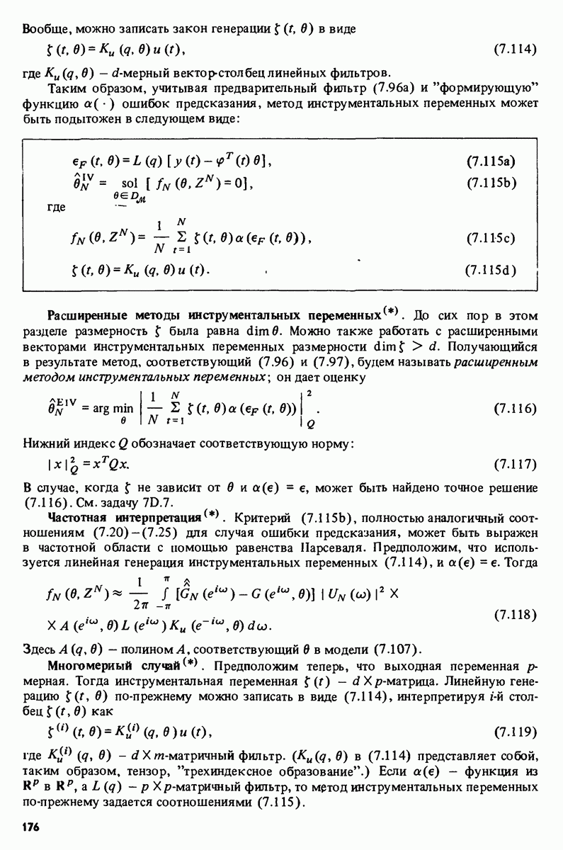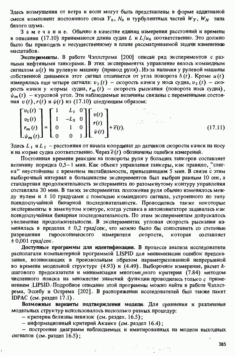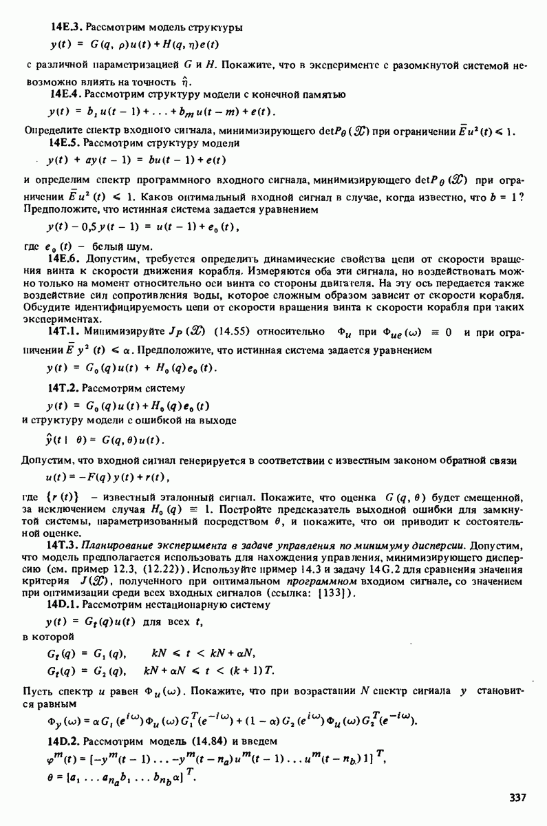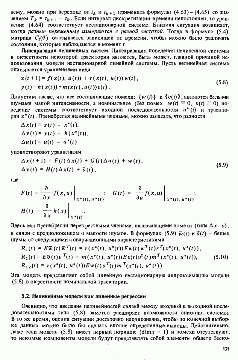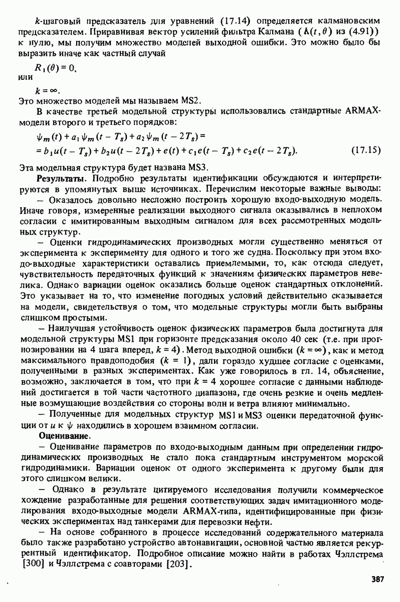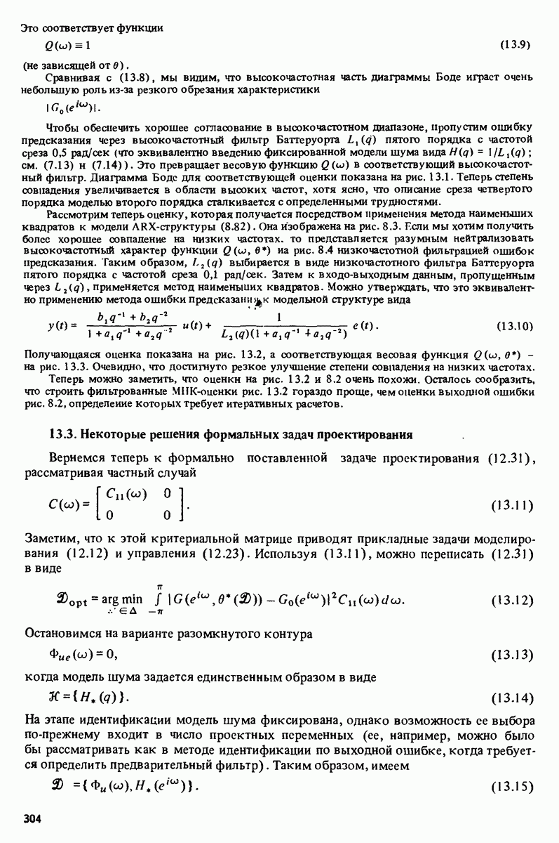 Можно использовать физическую параметризацию динамики системы в сочетании с формальной (по методу черного ящика) параметризацией характеристик шума такой, например, как непосредственная параметризация формы обновлений (4,88), или принимая такую модель шума, которая также является физически параметризованной с помощью соотношений (4.93)-(4,96). Наконец, мы можем использовать структуры черного ящика в пространстве состояний, как скажем, в примере 4.2. В этом случае описание входо-выходного соответствия моделью черного ящика имеет преимущество гибкости в выборе такого представления, которое может обеспечить достижение лучших количественных характеристик процесса параметризации (задача 16Е.1).