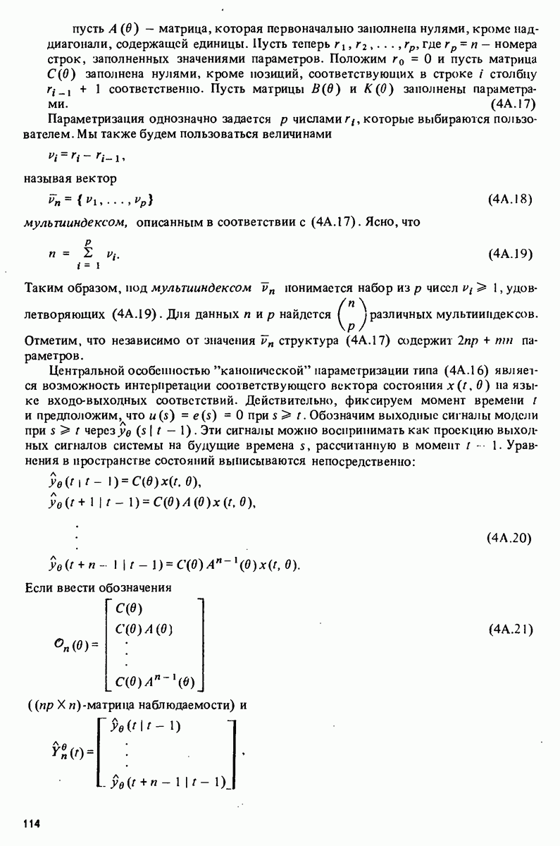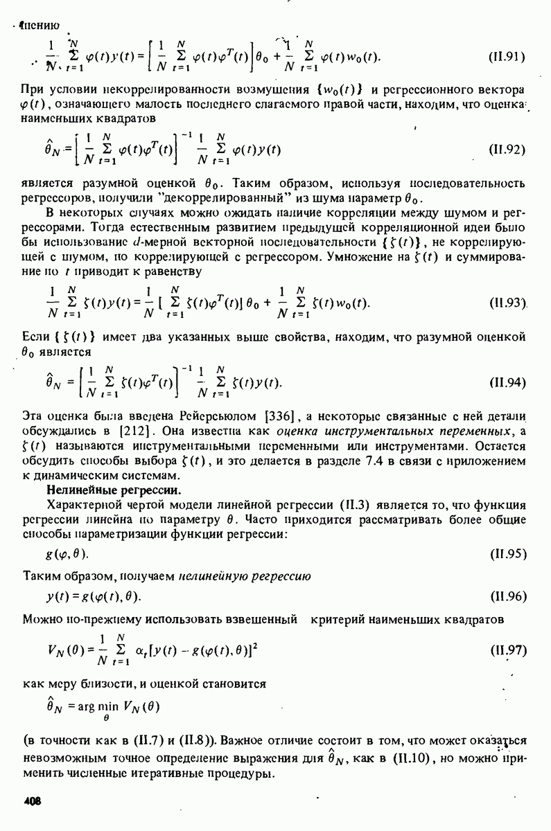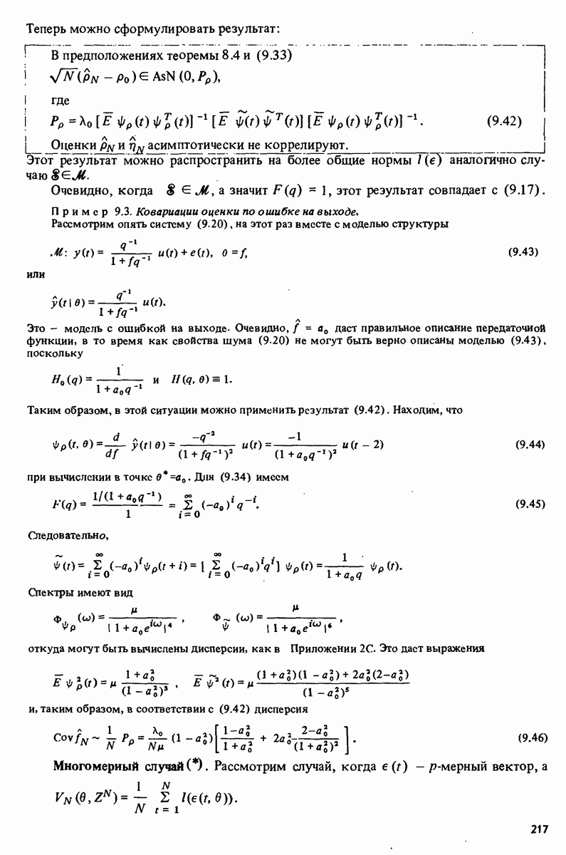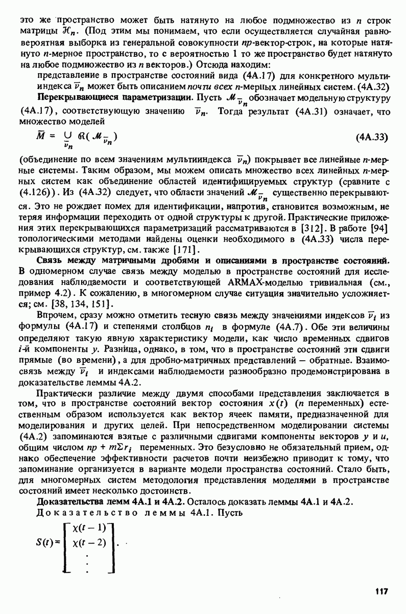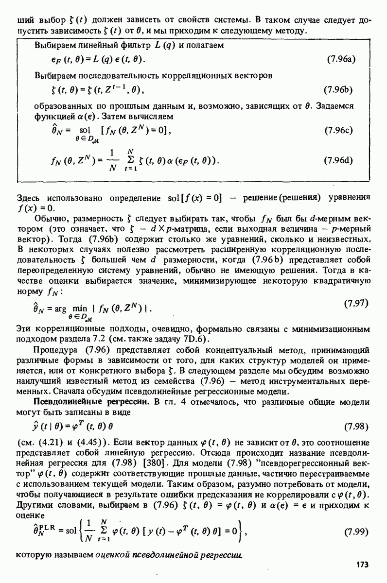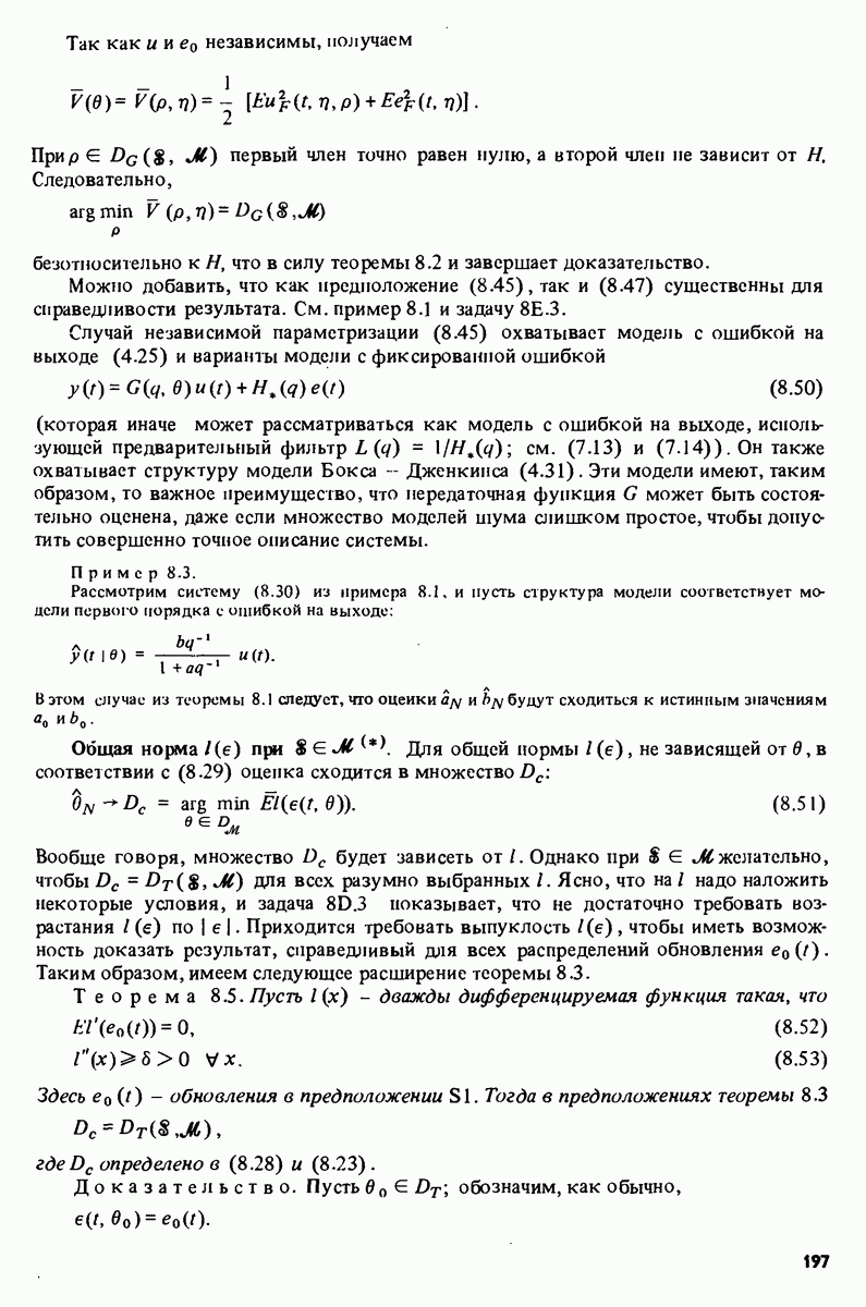 Можно использовать физическую параметризацию динамики системы в сочетании с формальной (по методу черного ящика) параметризацией характеристик шума такой, например, как непосредственная параметризация формы обновлений (4,88), или принимая такую модель шума, которая также является физически параметризованной с помощью соотношений (4.93)-(4,96). Наконец, мы можем использовать структуры черного ящика в пространстве состояний, как скажем, в примере 4.2. В этом случае описание входо-выходного соответствия моделью черного ящика имеет преимущество гибкости в выборе такого представления, которое может обеспечить достижение лучших количественных характеристик процесса параметризации (задача 16Е.1).