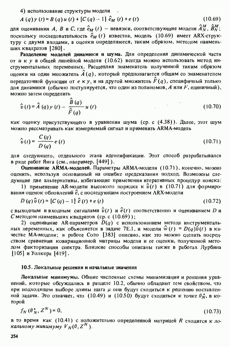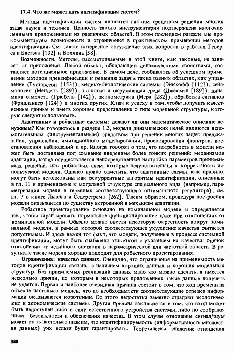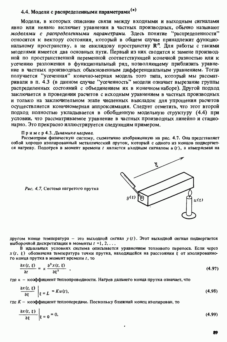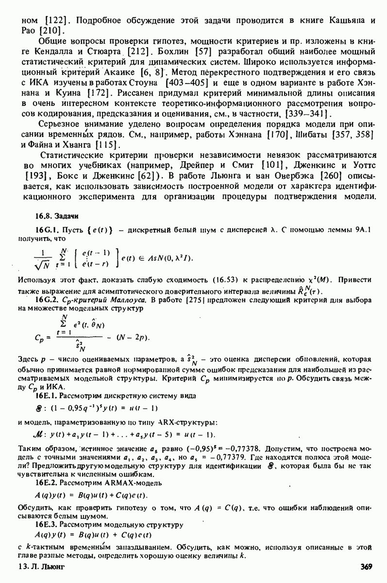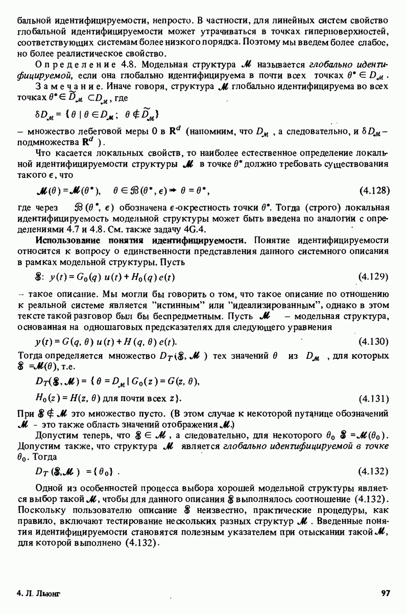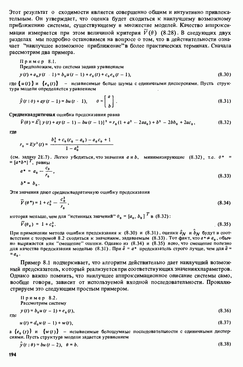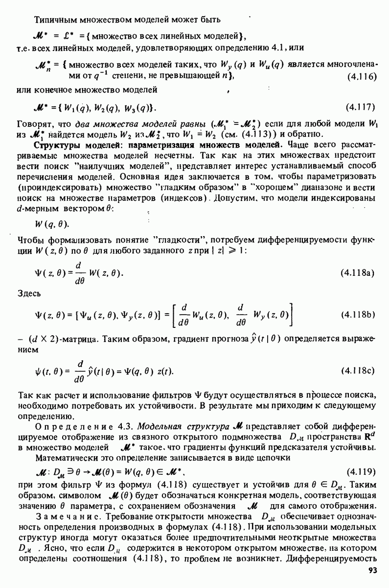 Можно использовать физическую параметризацию динамики системы в сочетании с формальной (по методу черного ящика) параметризацией характеристик шума такой, например, как непосредственная параметризация формы обновлений (4,88), или принимая такую модель шума, которая также является физически параметризованной с помощью соотношений (4.93)-(4,96). Наконец, мы можем использовать структуры черного ящика в пространстве состояний, как скажем, в примере 4.2. В этом случае описание входо-выходного соответствия моделью черного ящика имеет преимущество гибкости в выборе такого представления, которое может обеспечить достижение лучших количественных характеристик процесса параметризации (задача 16Е.1).