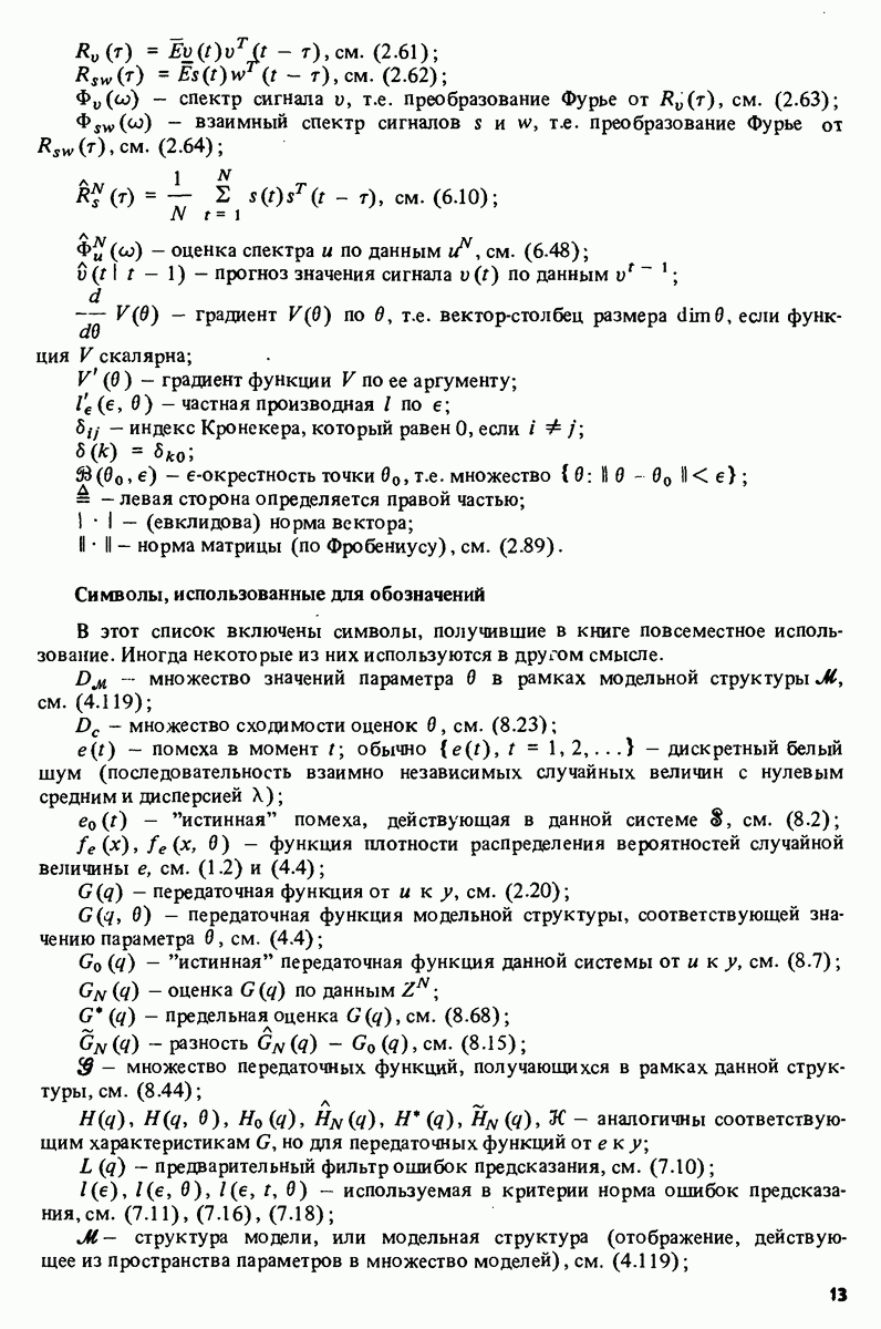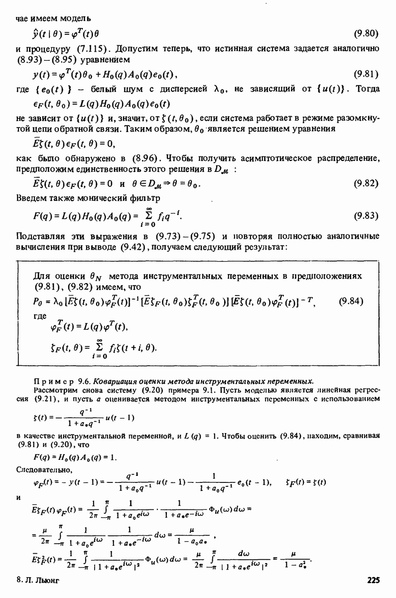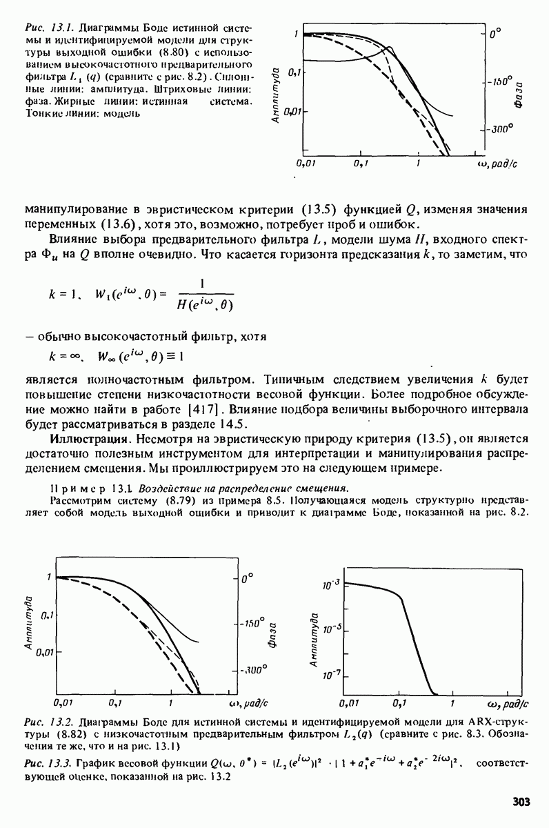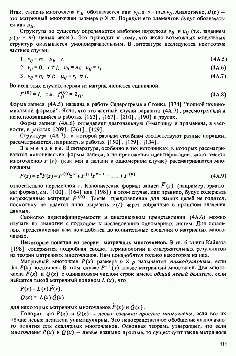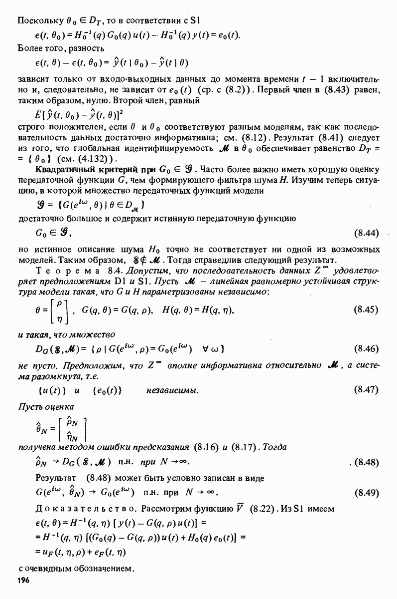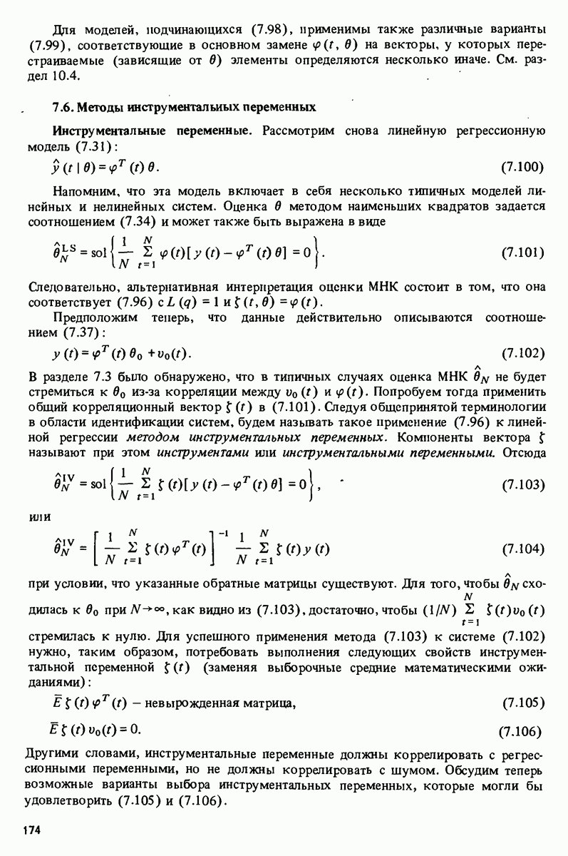 Можно использовать физическую параметризацию динамики системы в сочетании с формальной (по методу черного ящика) параметризацией характеристик шума такой, например, как непосредственная параметризация формы обновлений (4,88), или принимая такую модель шума, которая также является физически параметризованной с помощью соотношений (4.93)-(4,96). Наконец, мы можем использовать структуры черного ящика в пространстве состояний, как скажем, в примере 4.2. В этом случае описание входо-выходного соответствия моделью черного ящика имеет преимущество гибкости в выборе такого представления, которое может обеспечить достижение лучших количественных характеристик процесса параметризации (задача 16Е.1).