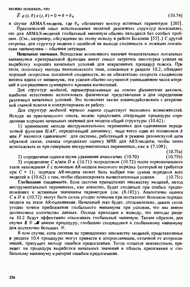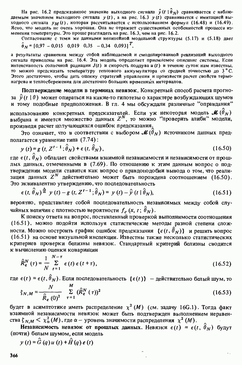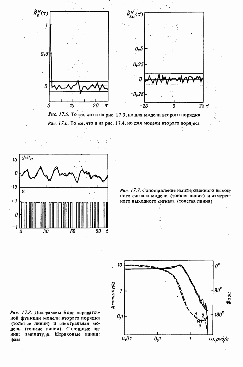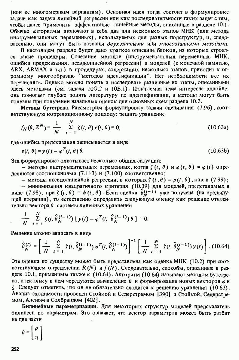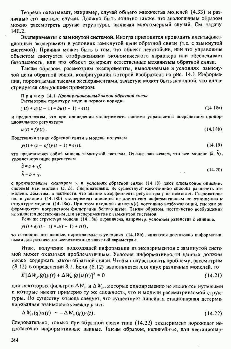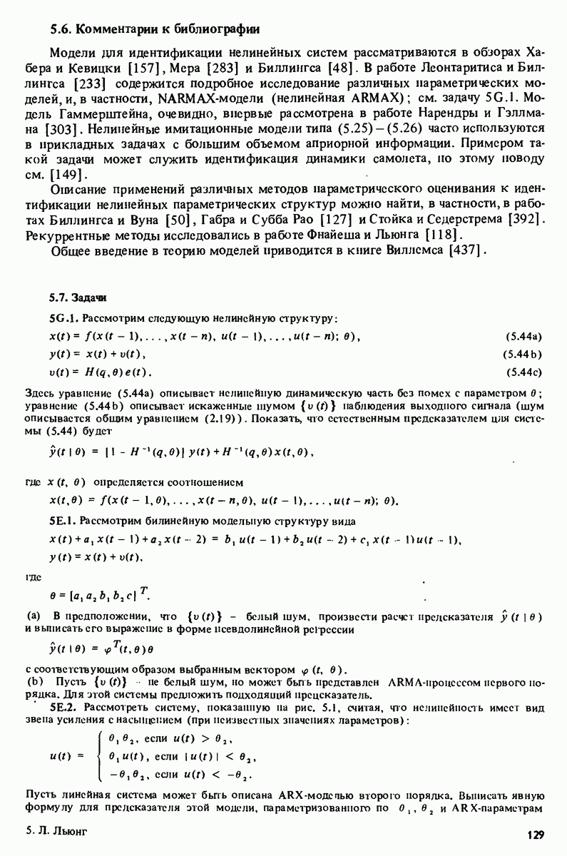 Можно использовать физическую параметризацию динамики системы в сочетании с формальной (по методу черного ящика) параметризацией характеристик шума такой, например, как непосредственная параметризация формы обновлений (4,88), или принимая такую модель шума, которая также является физически параметризованной с помощью соотношений (4.93)-(4,96). Наконец, мы можем использовать структуры черного ящика в пространстве состояний, как скажем, в примере 4.2. В этом случае описание входо-выходного соответствия моделью черного ящика имеет преимущество гибкости в выборе такого представления, которое может обеспечить достижение лучших количественных характеристик процесса параметризации (задача 16Е.1).