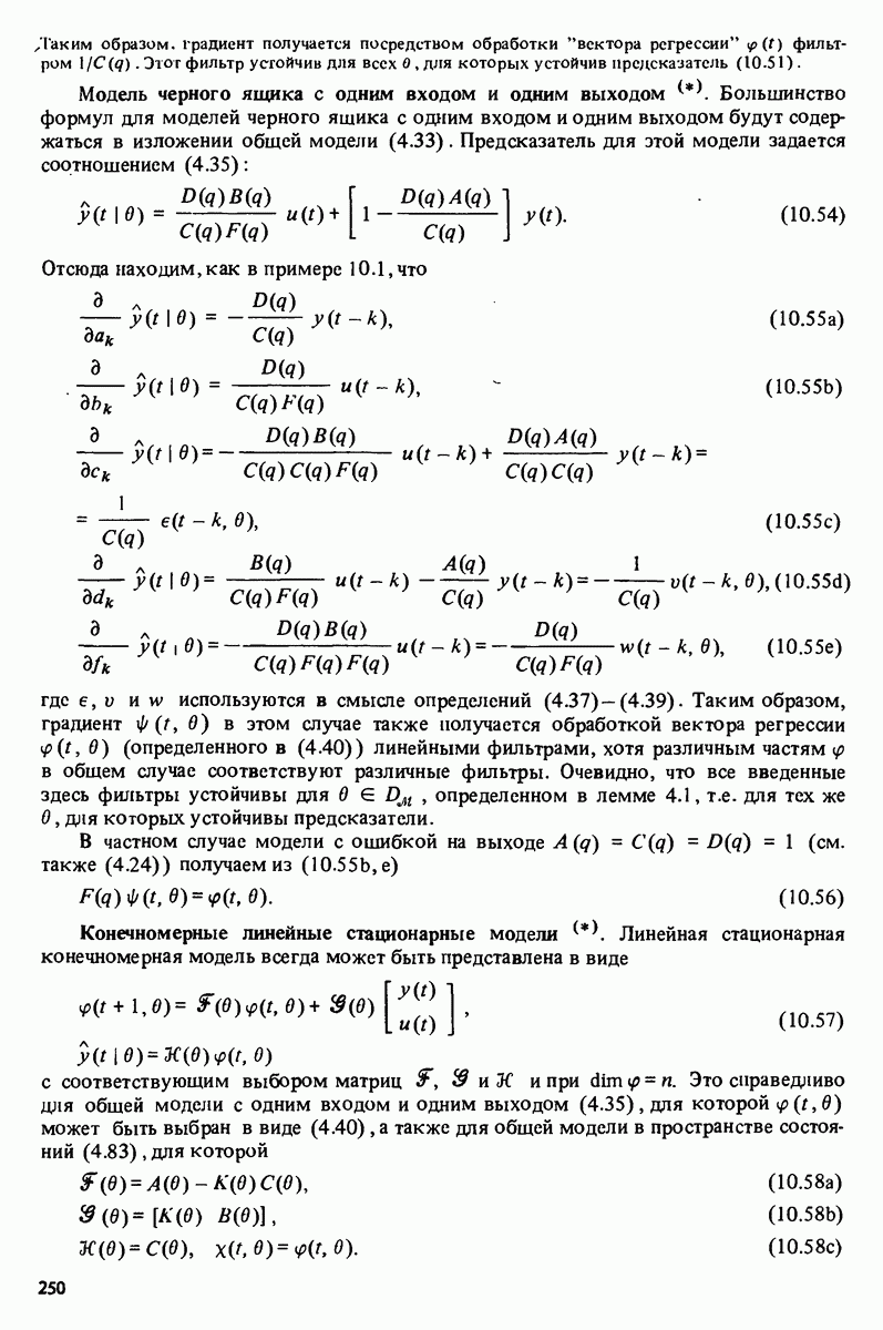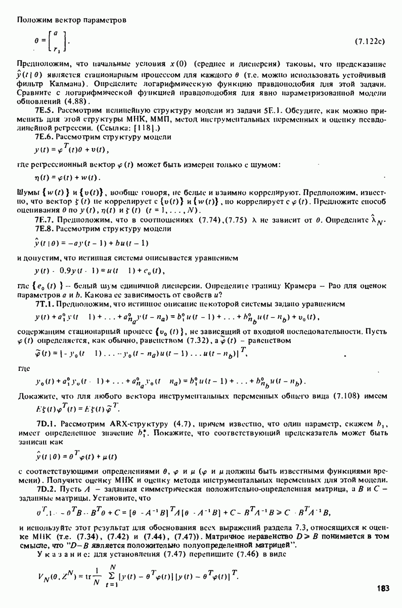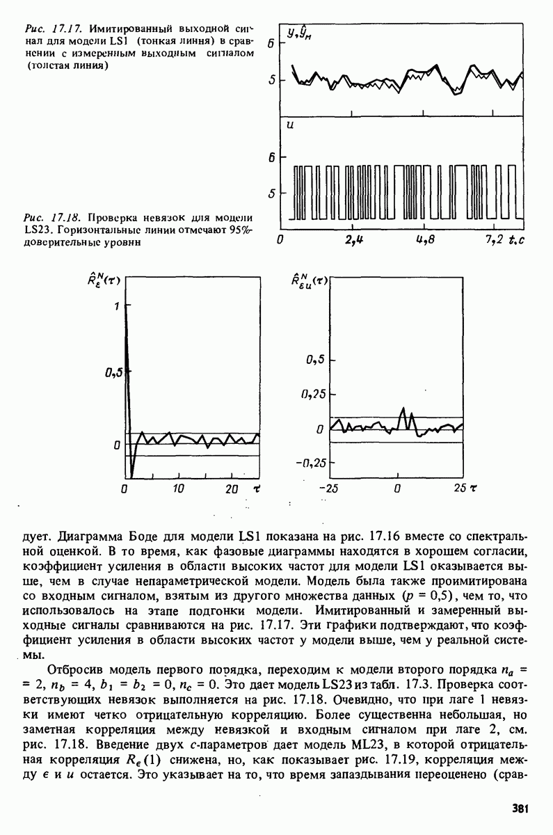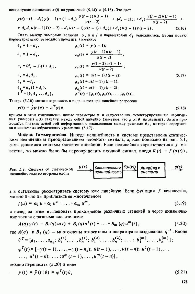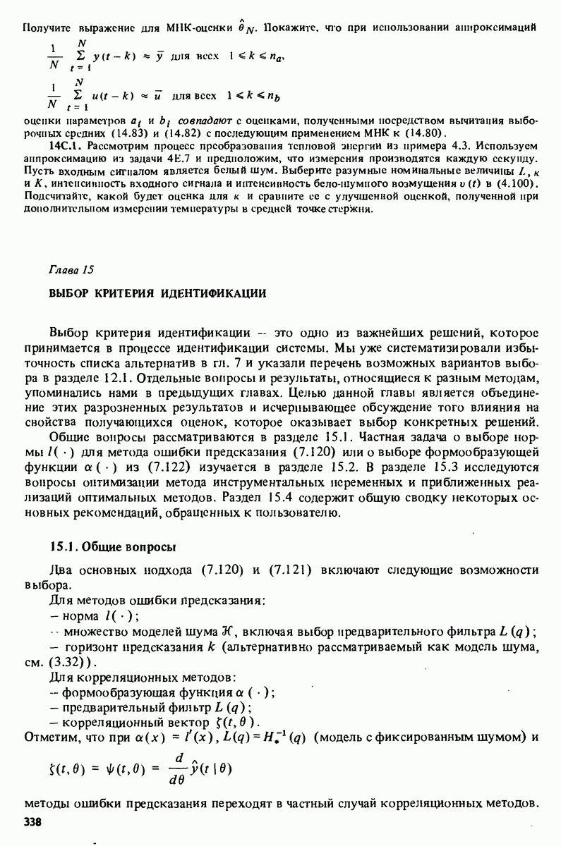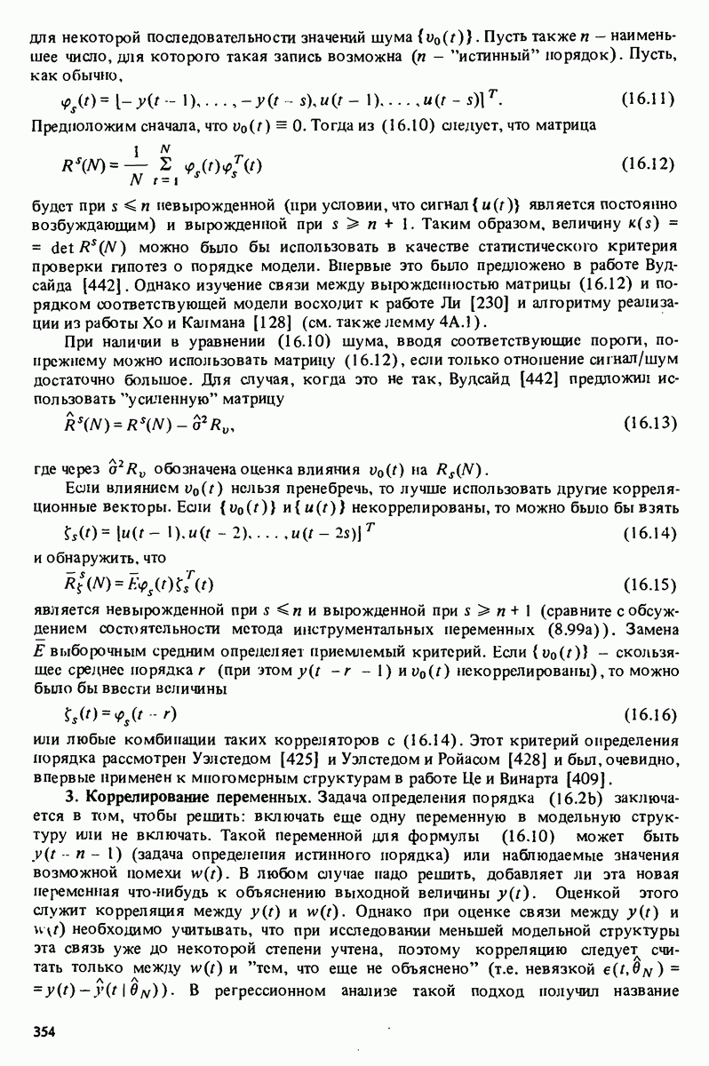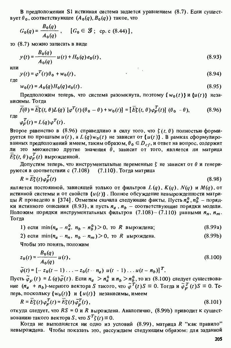 Можно использовать физическую параметризацию динамики системы в сочетании с формальной (по методу черного ящика) параметризацией характеристик шума такой, например, как непосредственная параметризация формы обновлений (4,88), или принимая такую модель шума, которая также является физически параметризованной с помощью соотношений (4.93)-(4,96). Наконец, мы можем использовать структуры черного ящика в пространстве состояний, как скажем, в примере 4.2. В этом случае описание входо-выходного соответствия моделью черного ящика имеет преимущество гибкости в выборе такого представления, которое может обеспечить достижение лучших количественных характеристик процесса параметризации (задача 16Е.1).