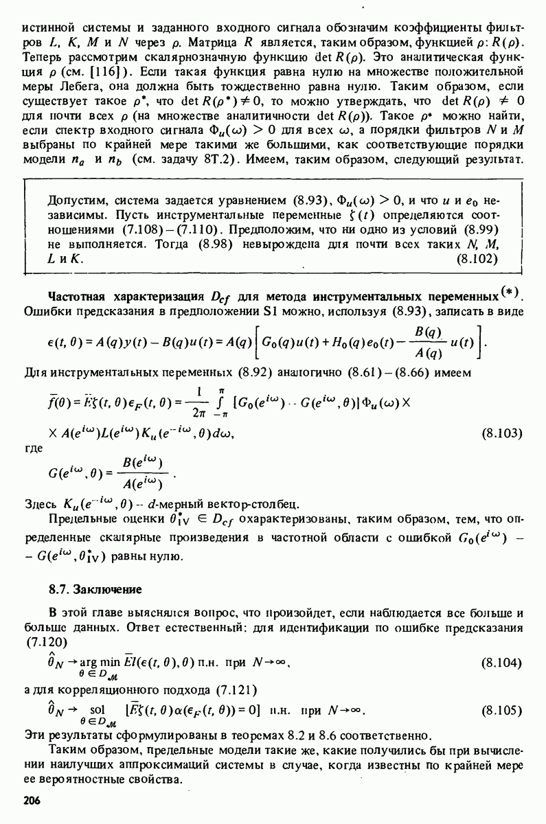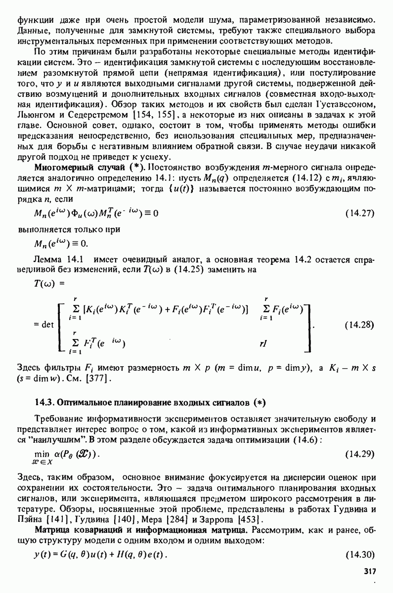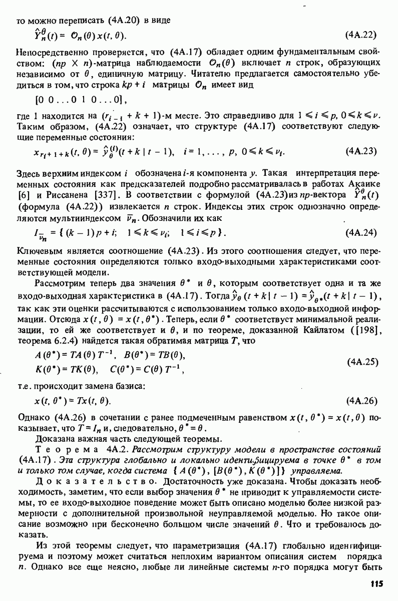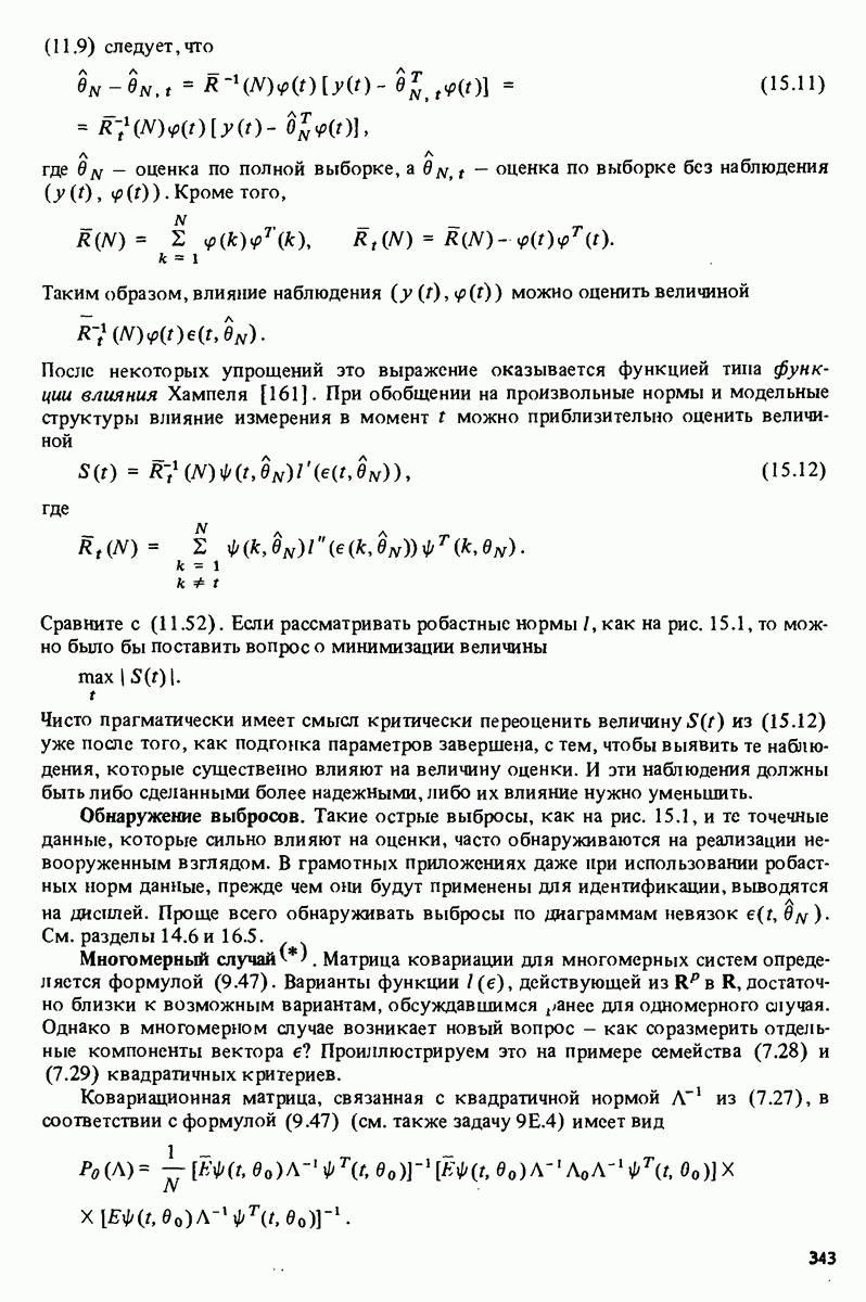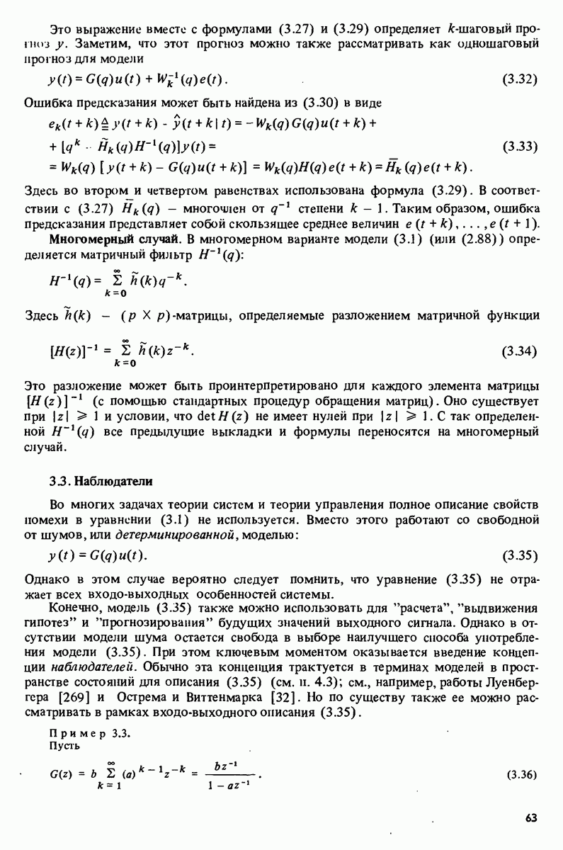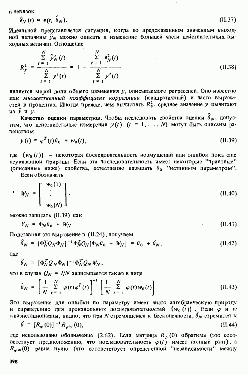 Можно использовать физическую параметризацию динамики системы в сочетании с формальной (по методу черного ящика) параметризацией характеристик шума такой, например, как непосредственная параметризация формы обновлений (4,88), или принимая такую модель шума, которая также является физически параметризованной с помощью соотношений (4.93)-(4,96). Наконец, мы можем использовать структуры черного ящика в пространстве состояний, как скажем, в примере 4.2. В этом случае описание входо-выходного соответствия моделью черного ящика имеет преимущество гибкости в выборе такого представления, которое может обеспечить достижение лучших количественных характеристик процесса параметризации (задача 16Е.1).