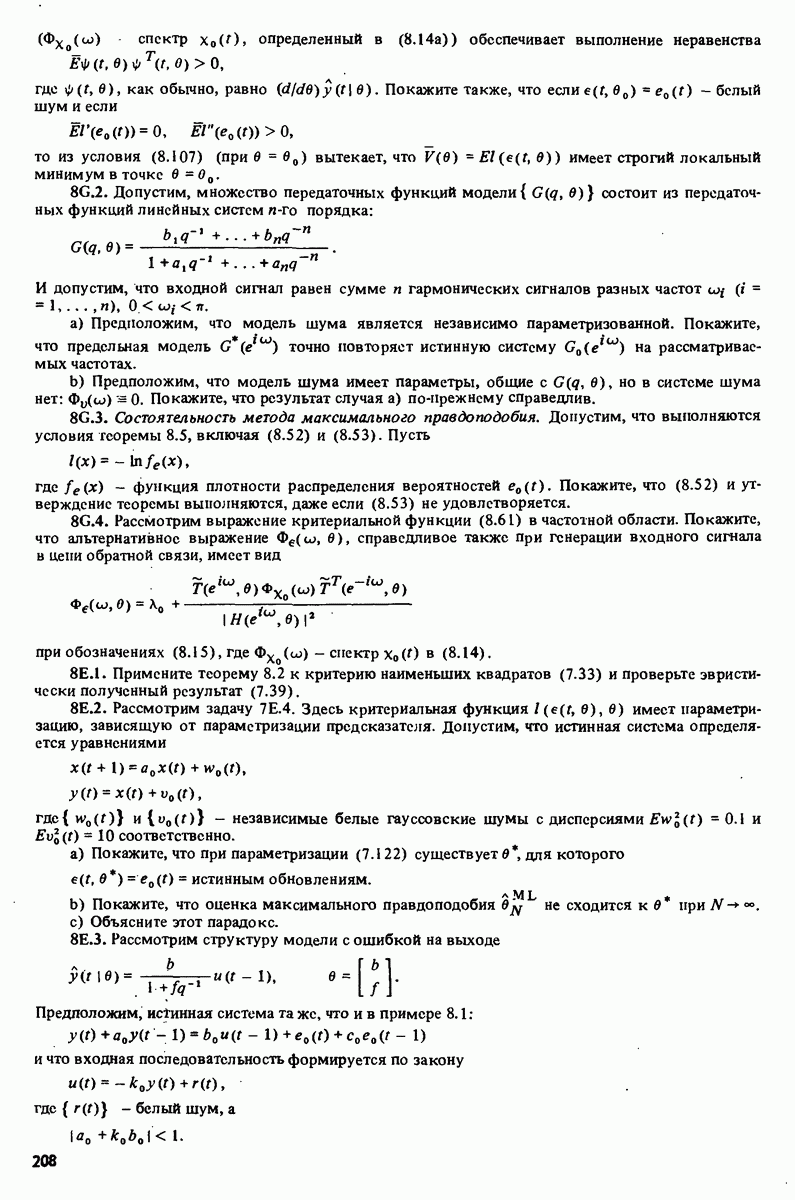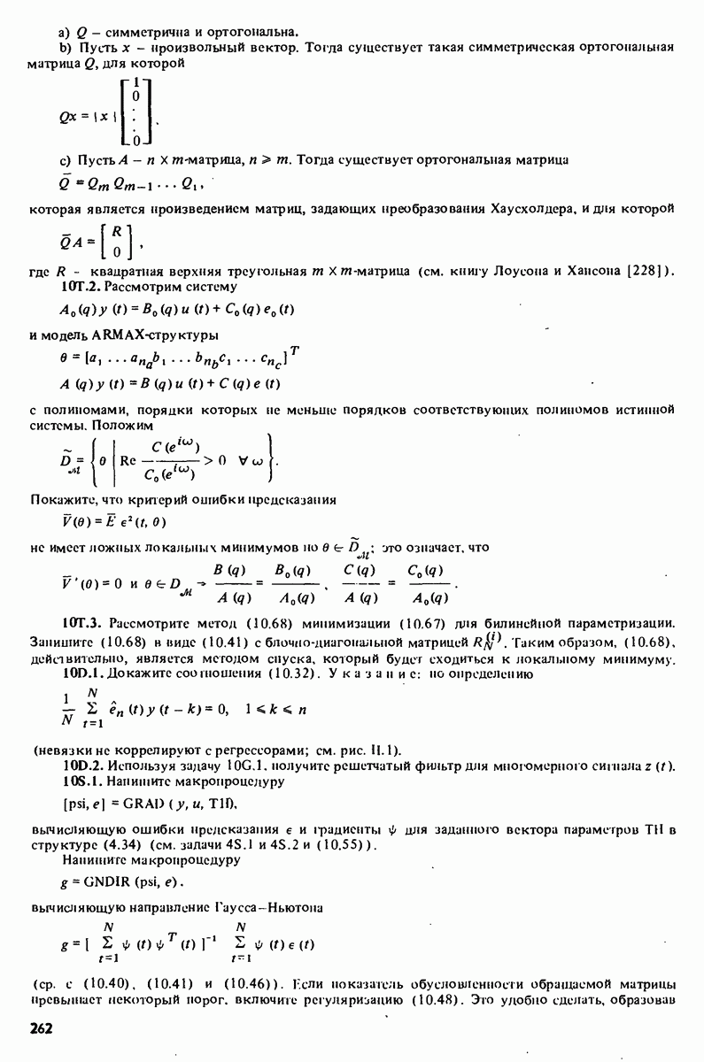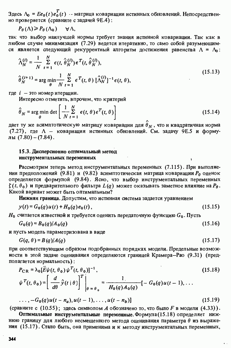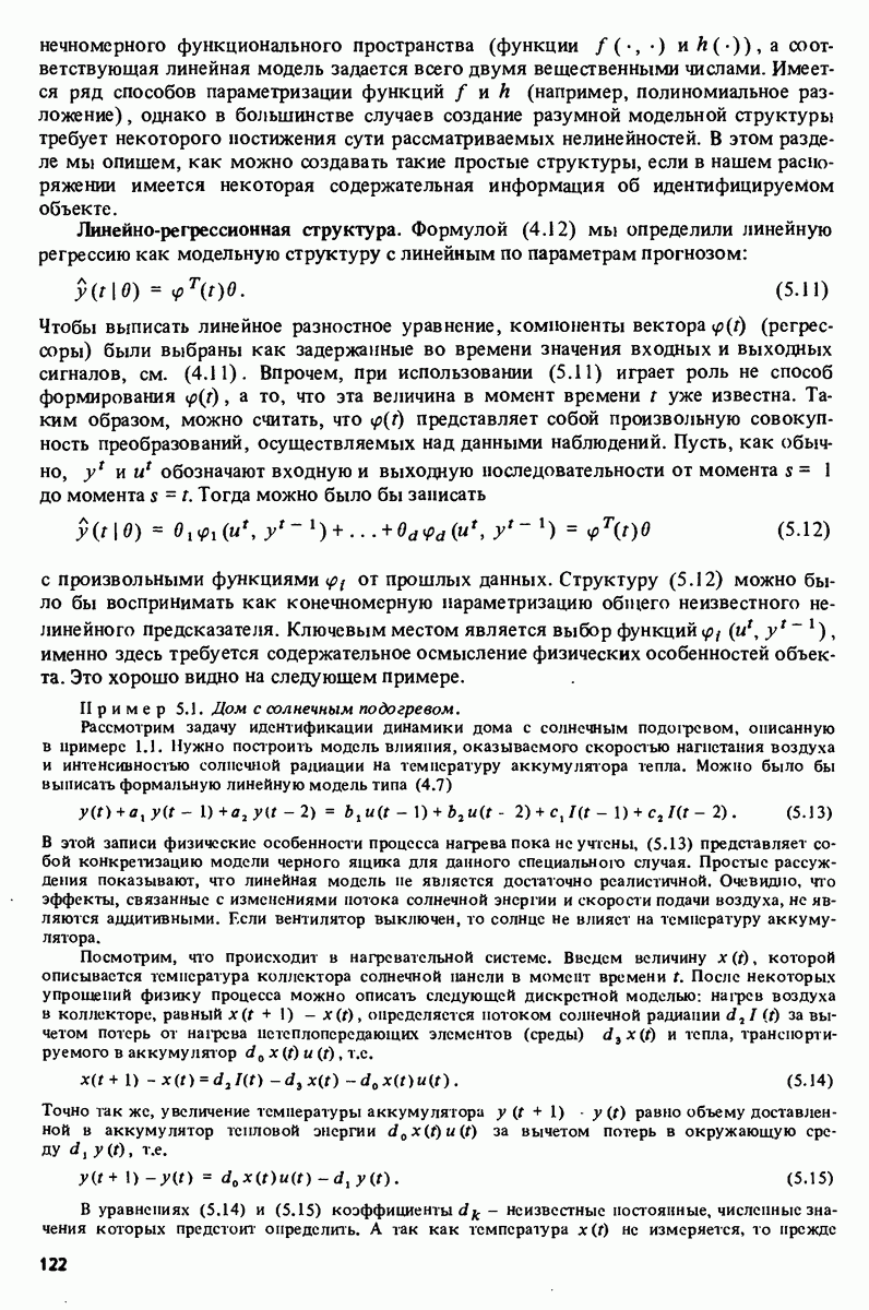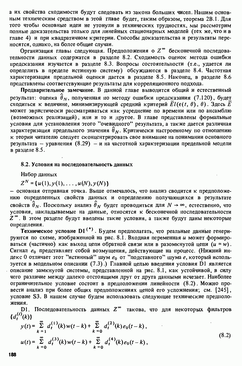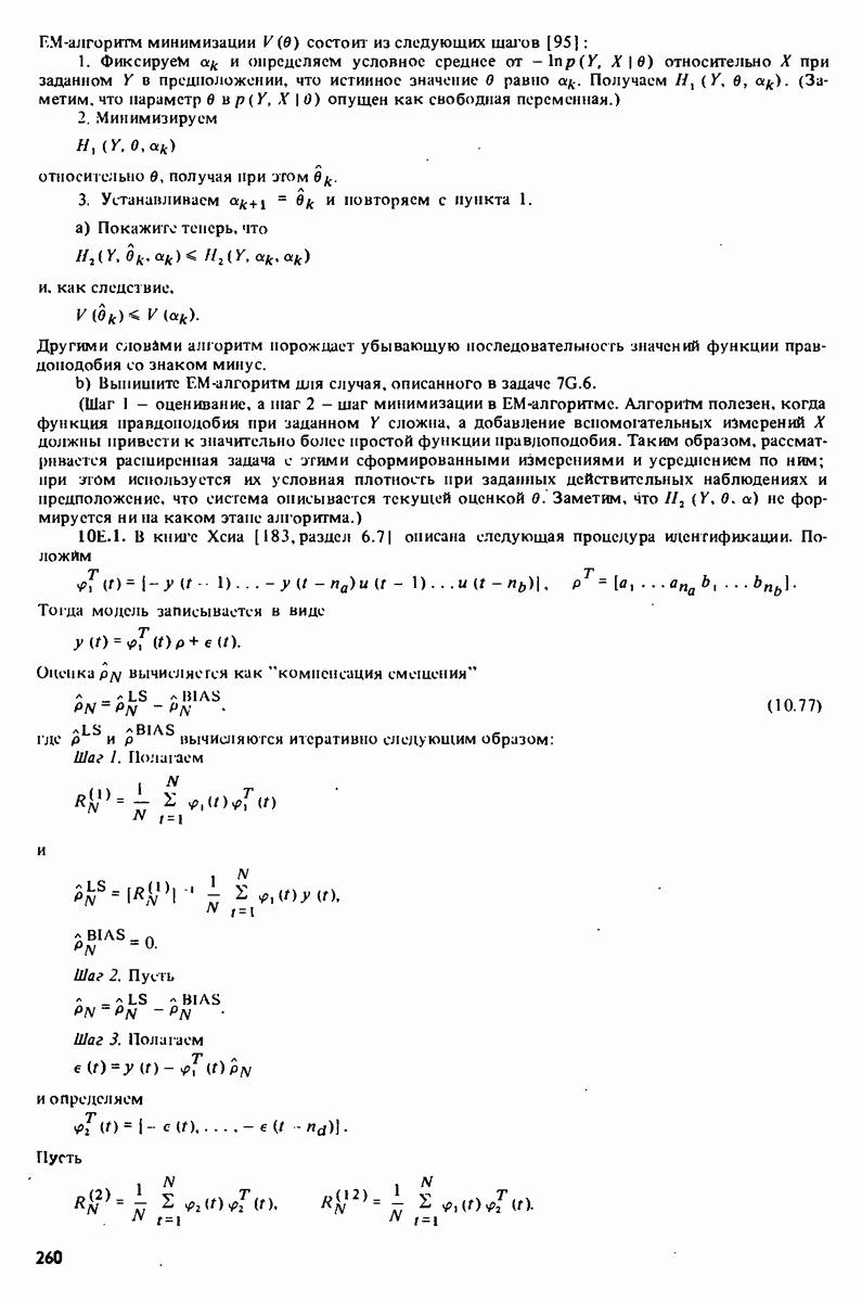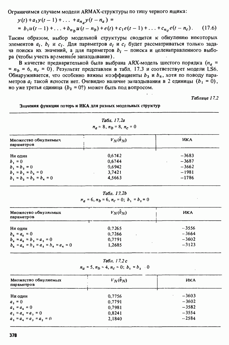 Можно использовать физическую параметризацию динамики системы в сочетании с формальной (по методу черного ящика) параметризацией характеристик шума такой, например, как непосредственная параметризация формы обновлений (4,88), или принимая такую модель шума, которая также является физически параметризованной с помощью соотношений (4.93)-(4,96). Наконец, мы можем использовать структуры черного ящика в пространстве состояний, как скажем, в примере 4.2. В этом случае описание входо-выходного соответствия моделью черного ящика имеет преимущество гибкости в выборе такого представления, которое может обеспечить достижение лучших количественных характеристик процесса параметризации (задача 16Е.1).