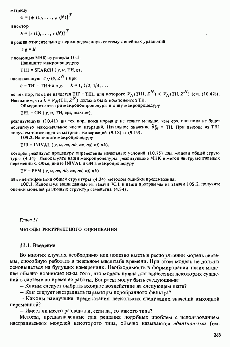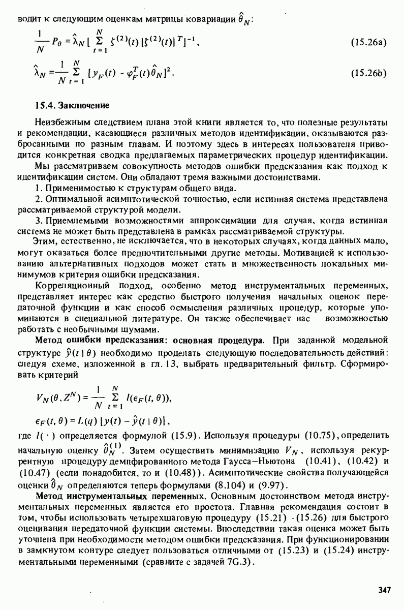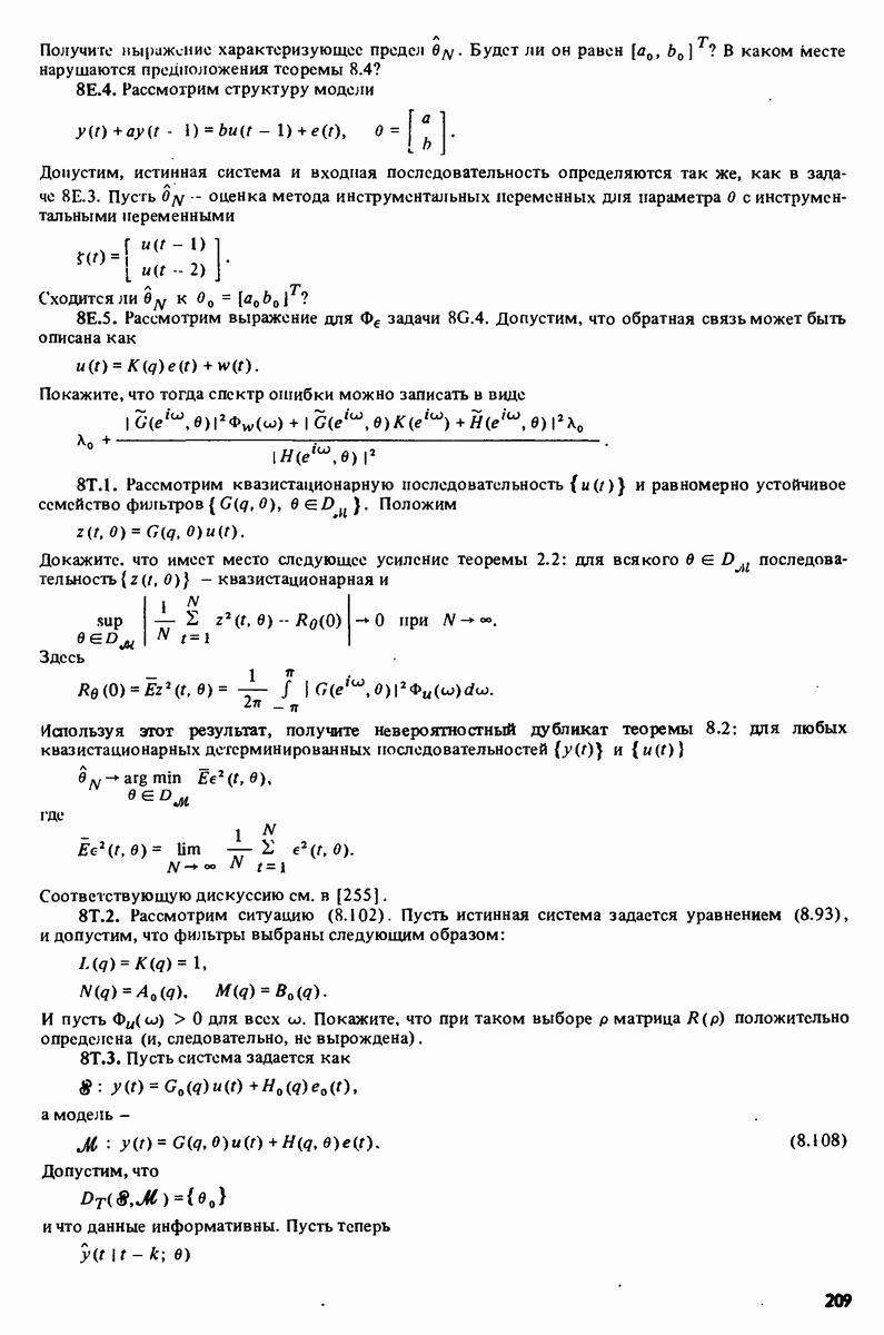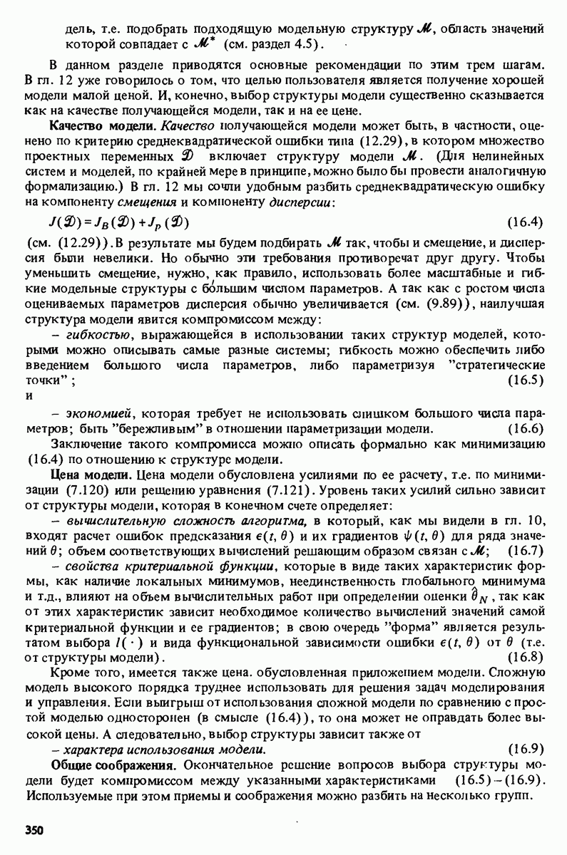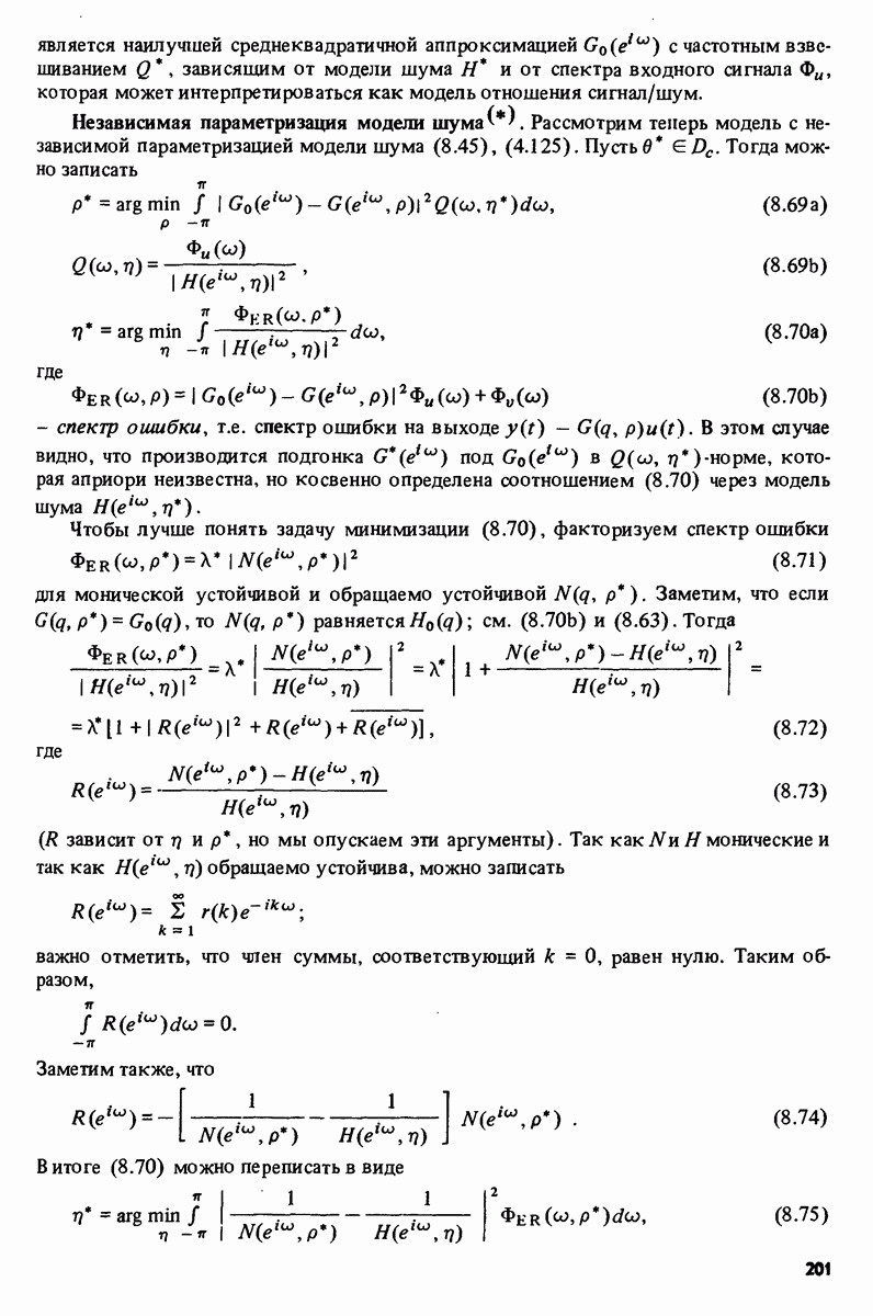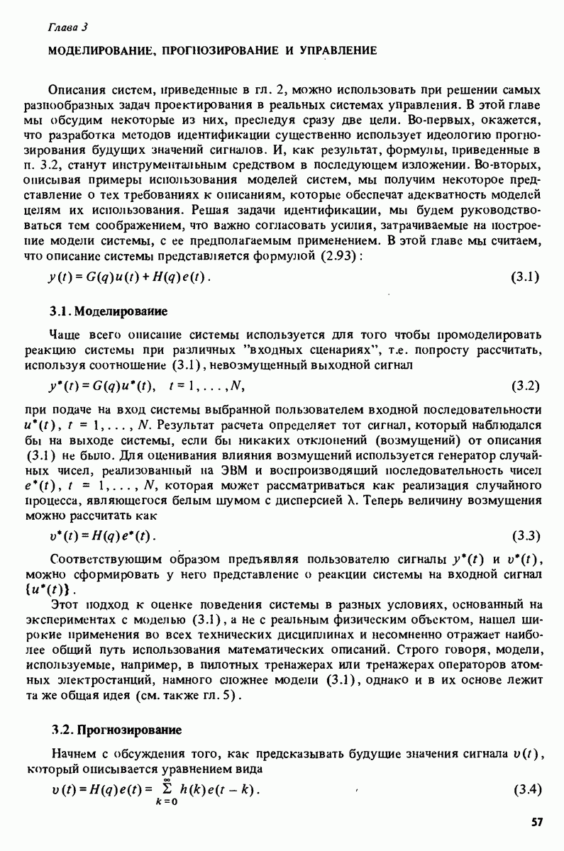 Можно использовать физическую параметризацию динамики системы в сочетании с формальной (по методу черного ящика) параметризацией характеристик шума такой, например, как непосредственная параметризация формы обновлений (4,88), или принимая такую модель шума, которая также является физически параметризованной с помощью соотношений (4.93)-(4,96). Наконец, мы можем использовать структуры черного ящика в пространстве состояний, как скажем, в примере 4.2. В этом случае описание входо-выходного соответствия моделью черного ящика имеет преимущество гибкости в выборе такого представления, которое может обеспечить достижение лучших количественных характеристик процесса параметризации (задача 16Е.1).