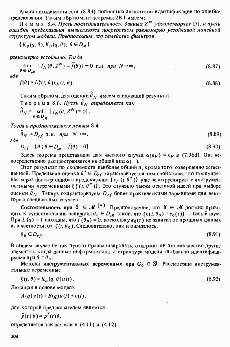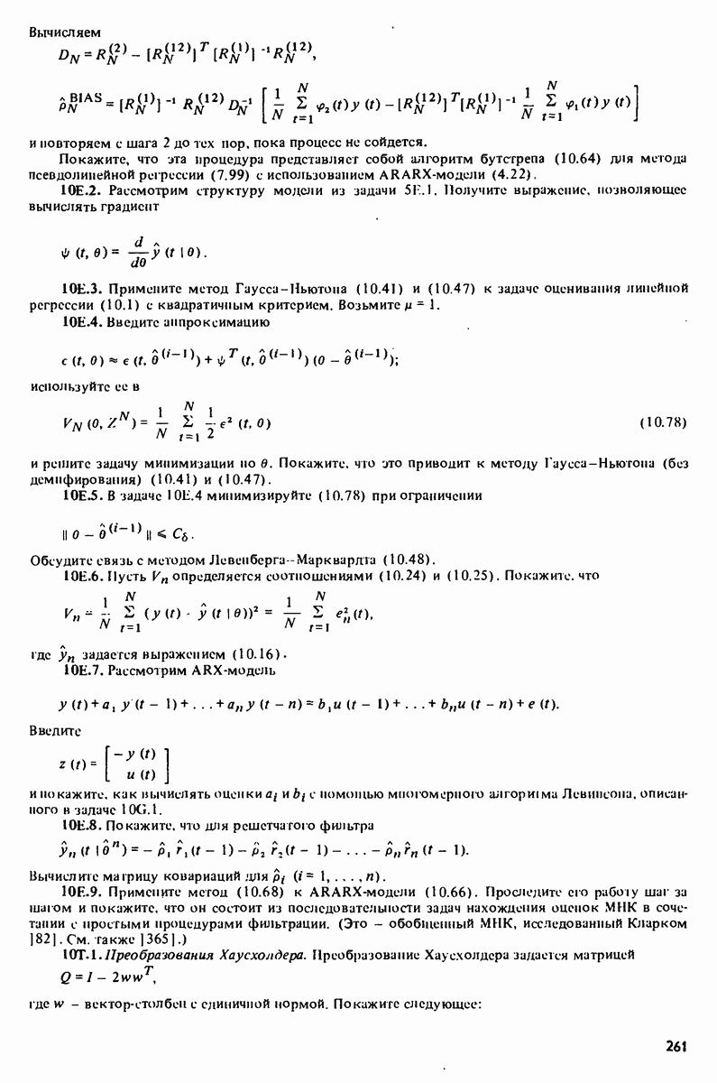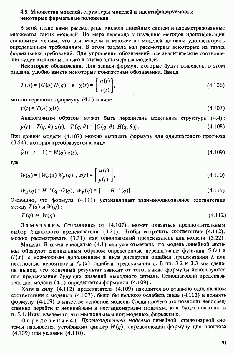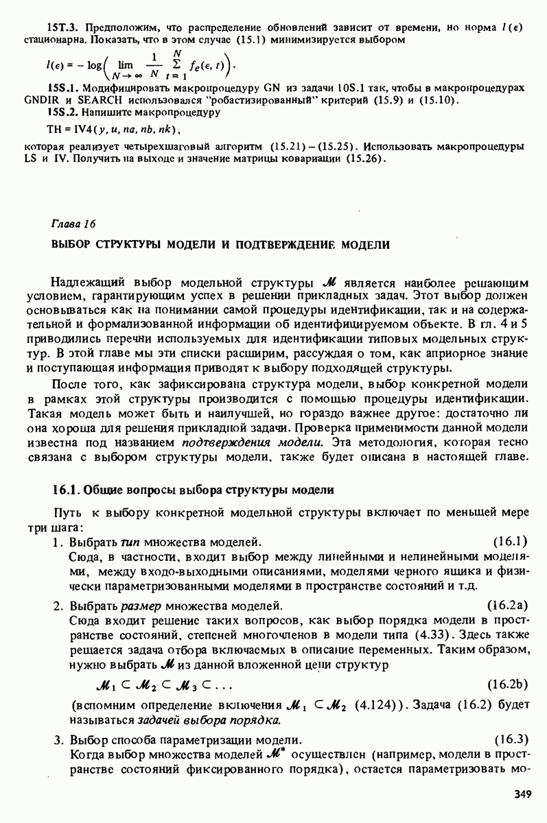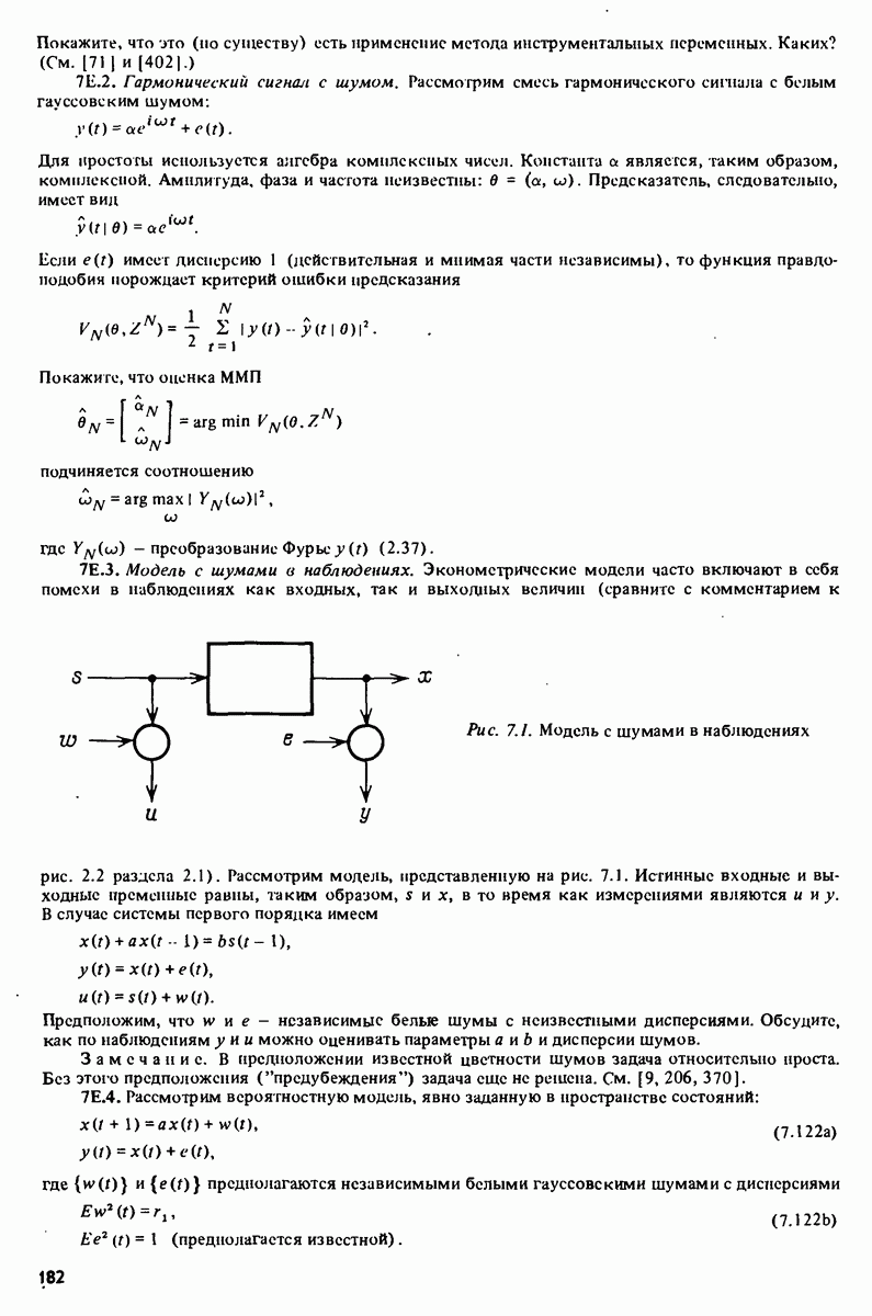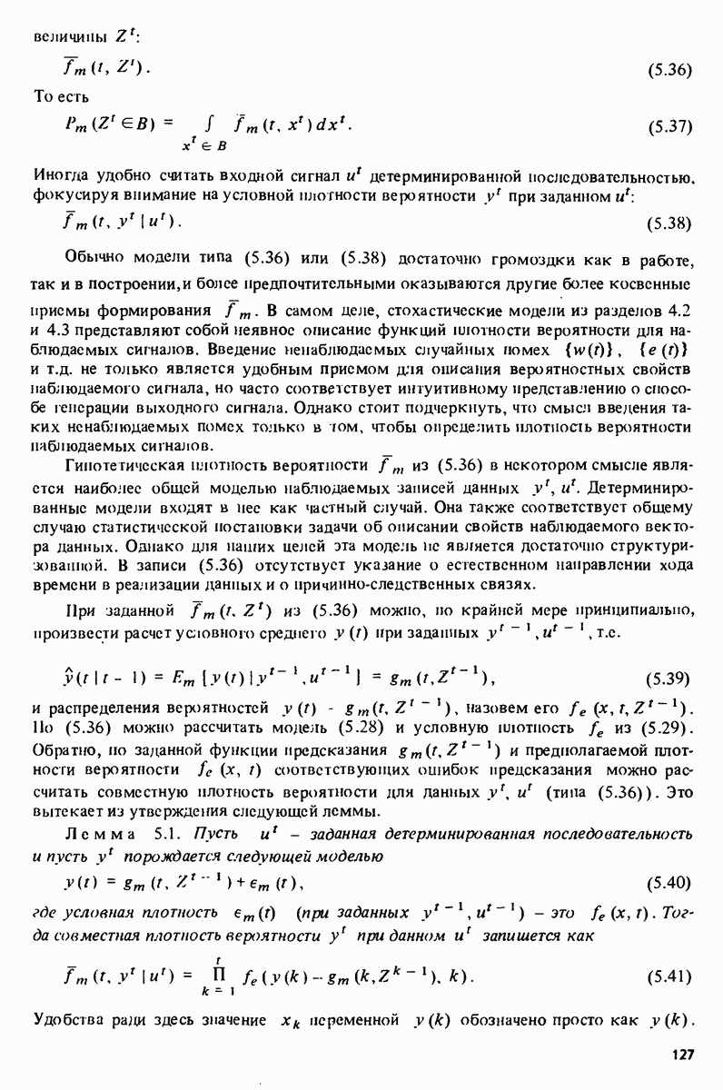 Можно использовать физическую параметризацию динамики системы в сочетании с формальной (по методу черного ящика) параметризацией характеристик шума такой, например, как непосредственная параметризация формы обновлений (4,88), или принимая такую модель шума, которая также является физически параметризованной с помощью соотношений (4.93)-(4,96). Наконец, мы можем использовать структуры черного ящика в пространстве состояний, как скажем, в примере 4.2. В этом случае описание входо-выходного соответствия моделью черного ящика имеет преимущество гибкости в выборе такого представления, которое может обеспечить достижение лучших количественных характеристик процесса параметризации (задача 16Е.1).