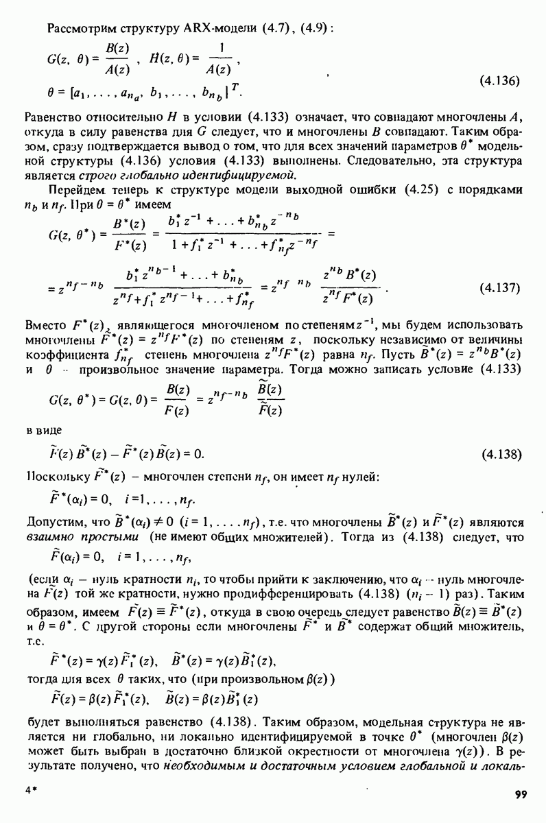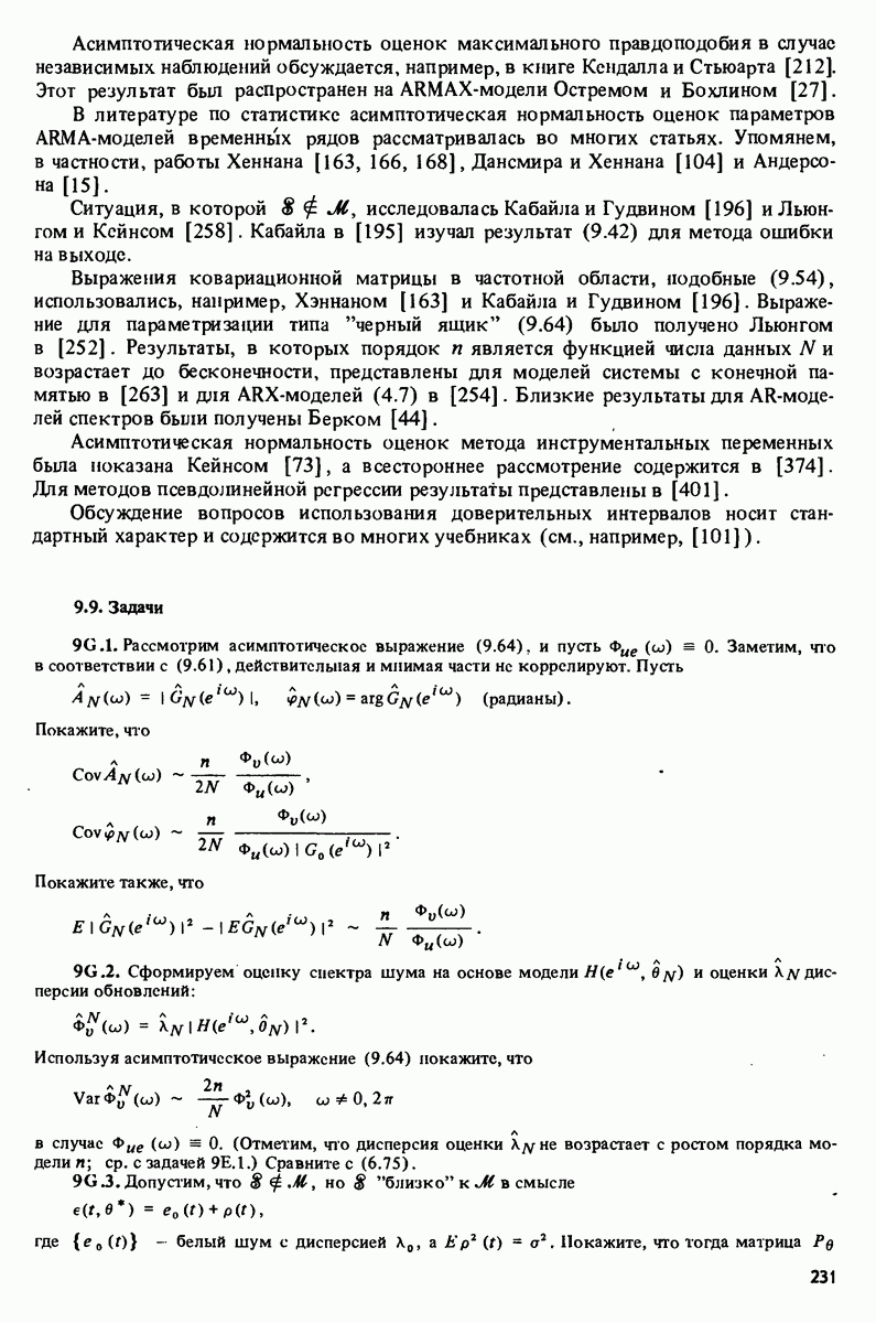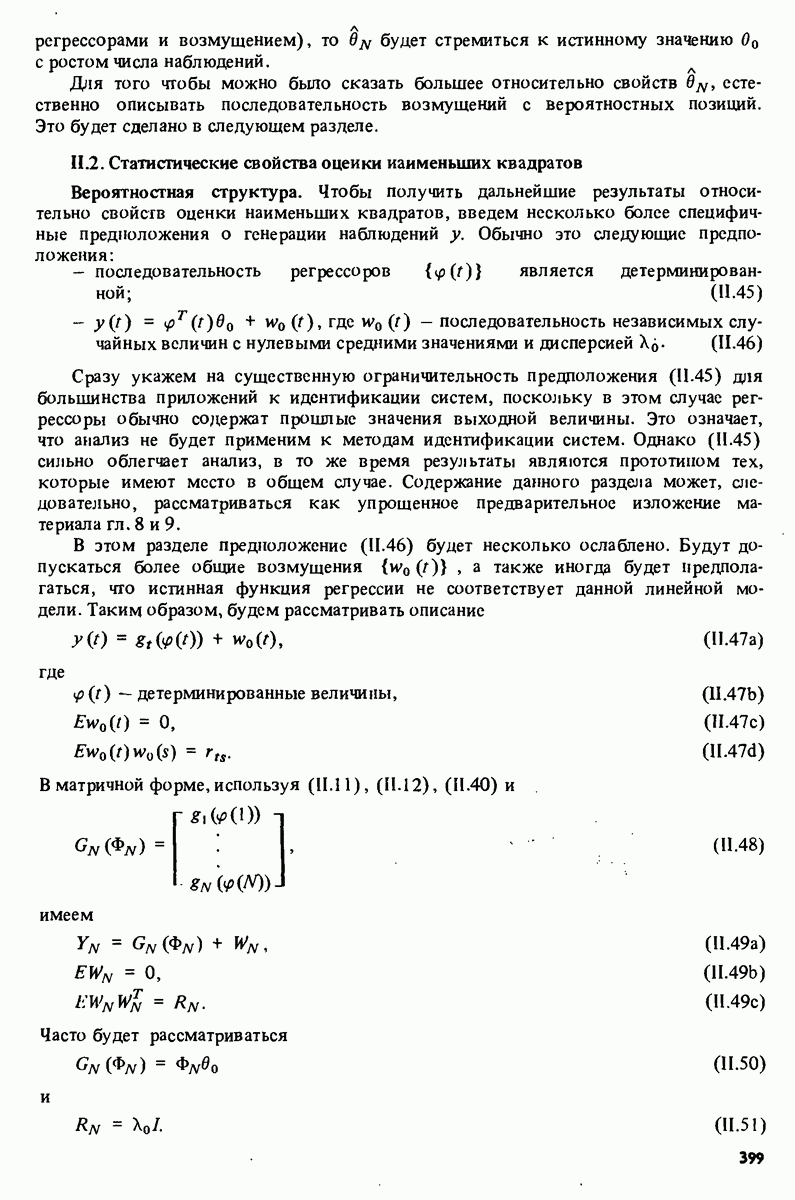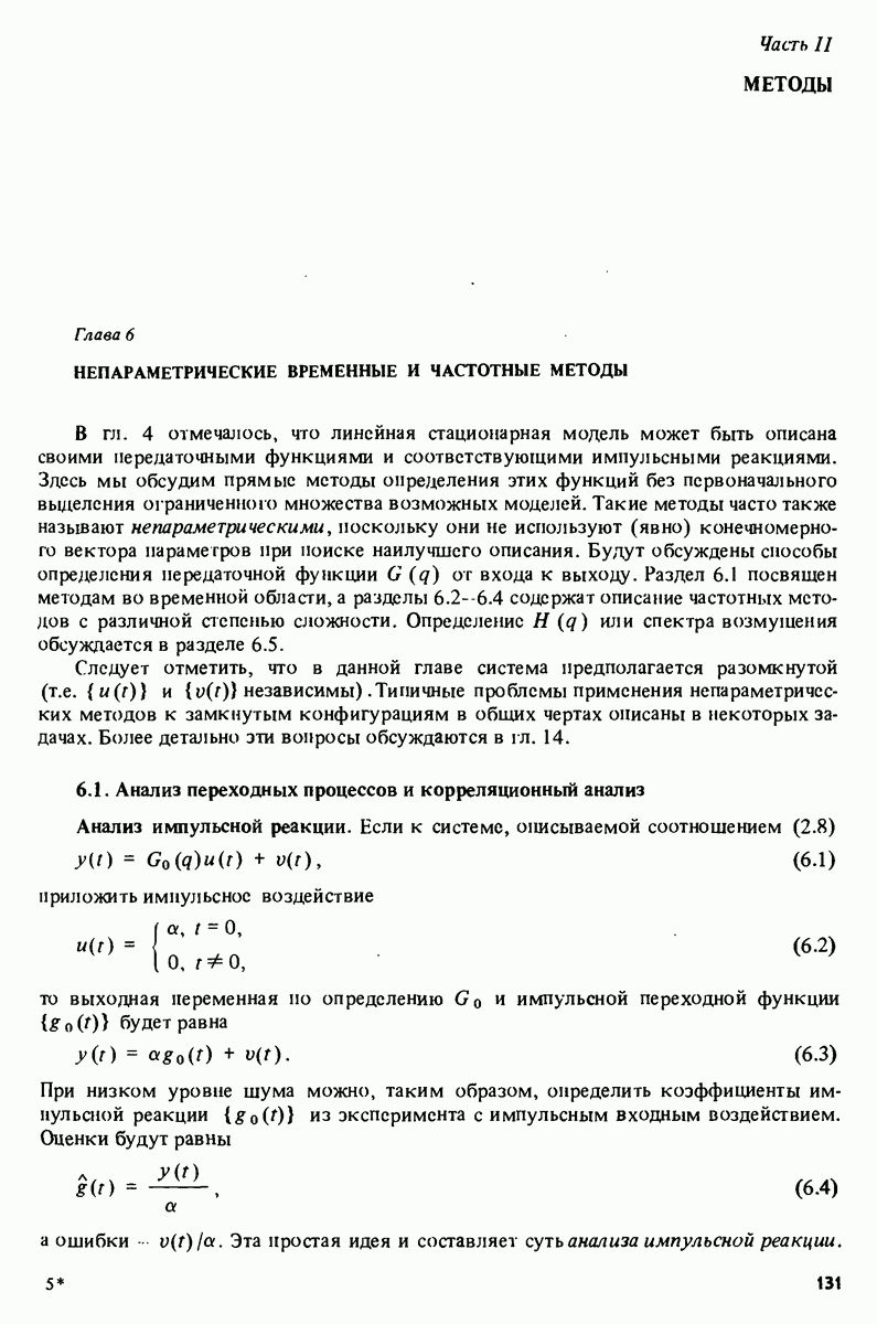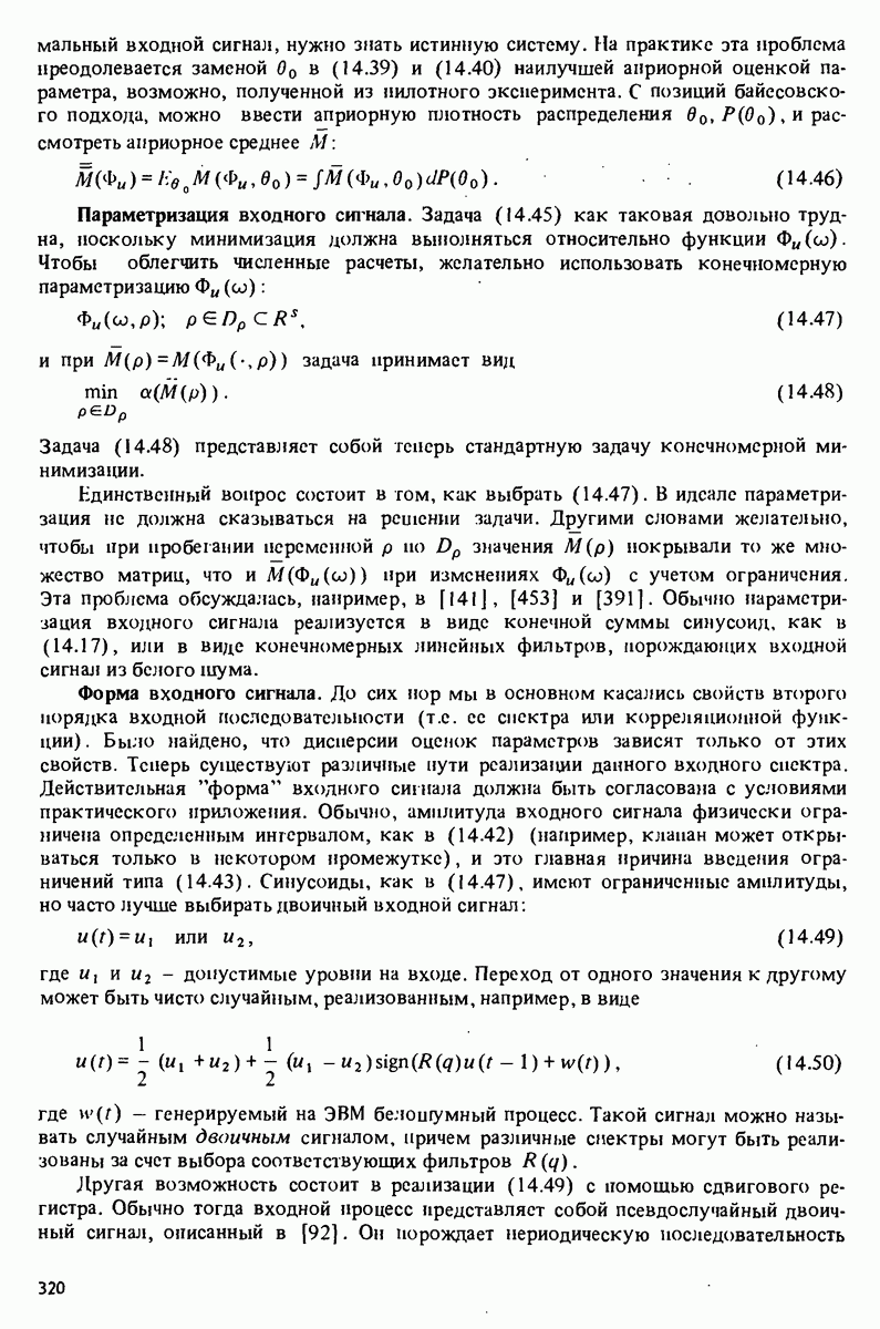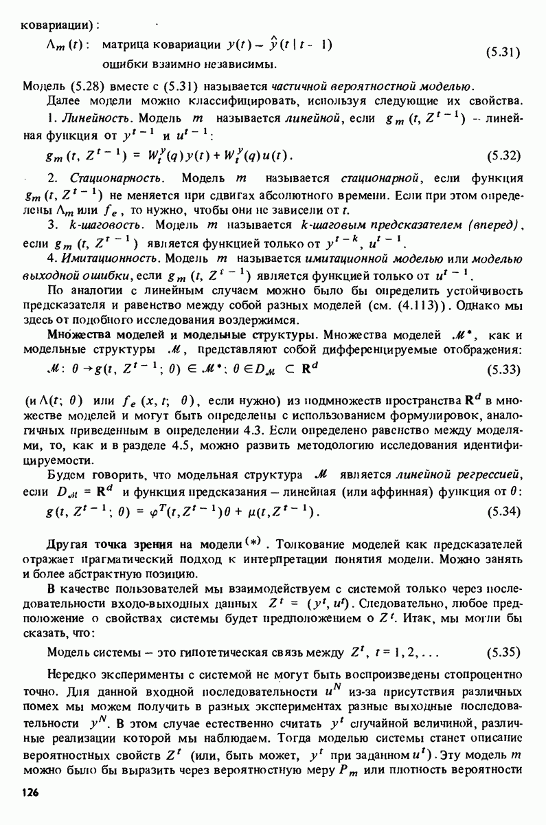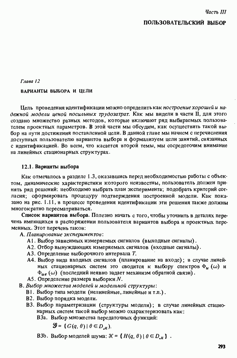 Можно использовать физическую параметризацию динамики системы в сочетании с формальной (по методу черного ящика) параметризацией характеристик шума такой, например, как непосредственная параметризация формы обновлений (4,88), или принимая такую модель шума, которая также является физически параметризованной с помощью соотношений (4.93)-(4,96). Наконец, мы можем использовать структуры черного ящика в пространстве состояний, как скажем, в примере 4.2. В этом случае описание входо-выходного соответствия моделью черного ящика имеет преимущество гибкости в выборе такого представления, которое может обеспечить достижение лучших количественных характеристик процесса параметризации (задача 16Е.1).
