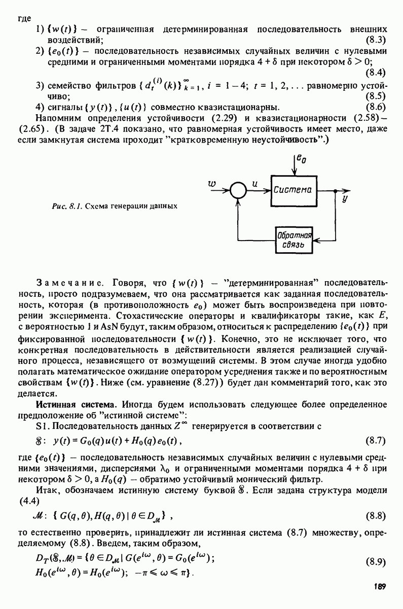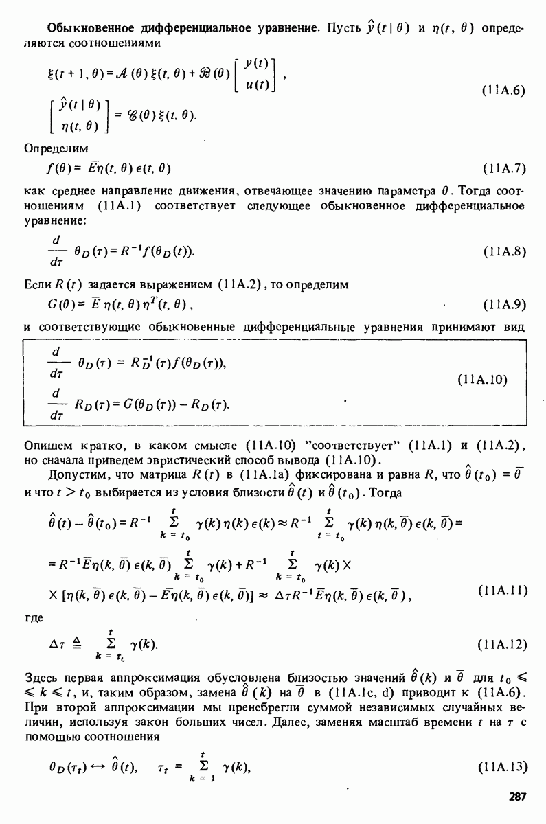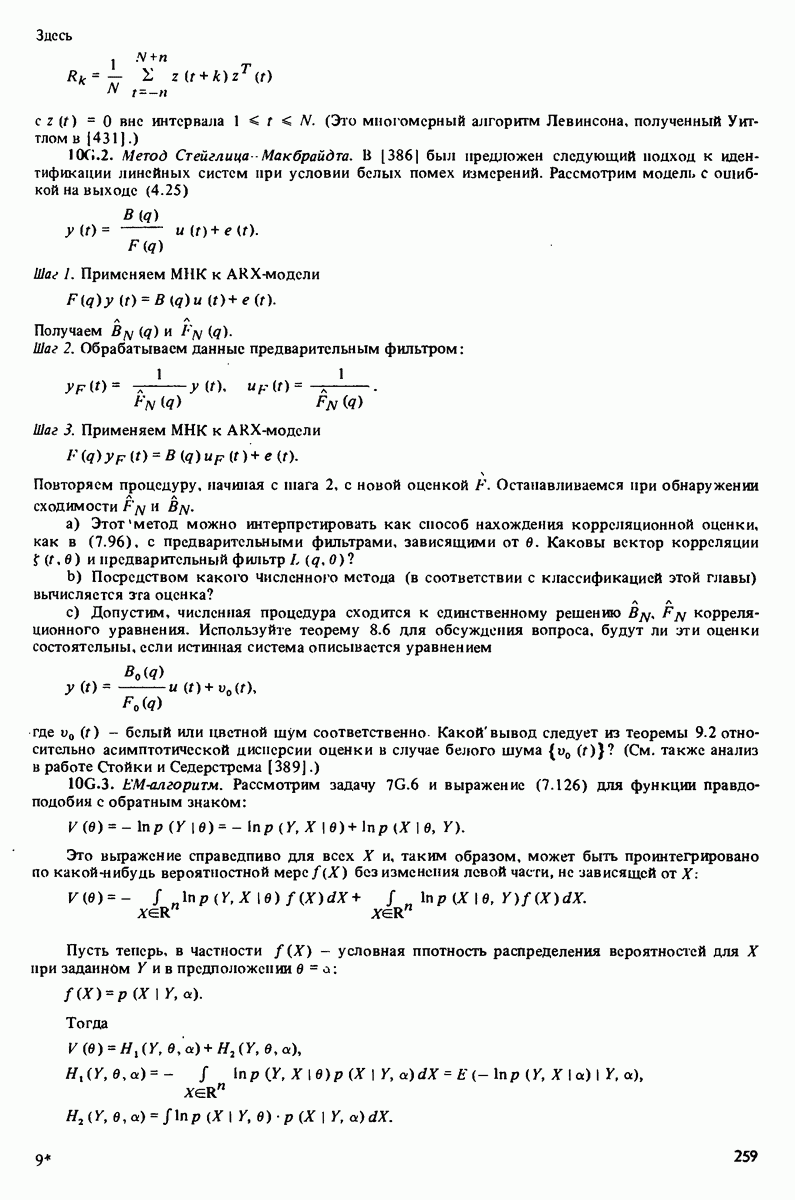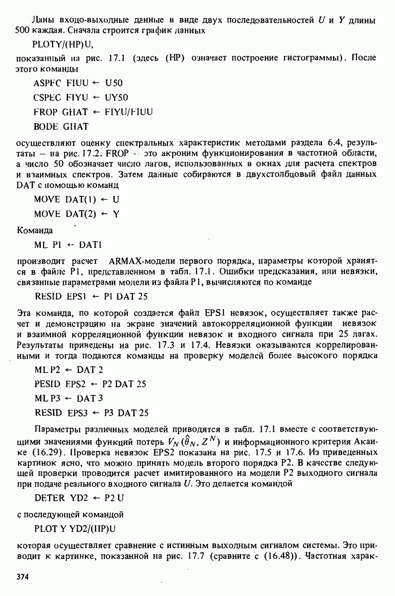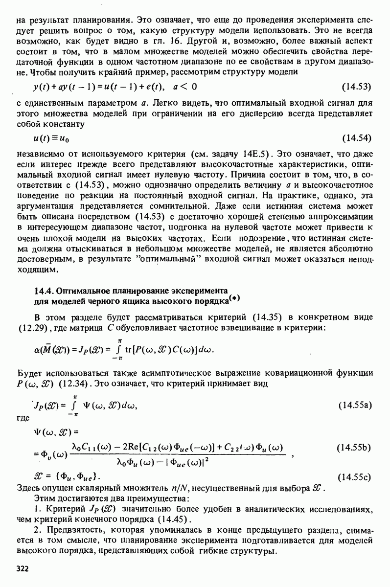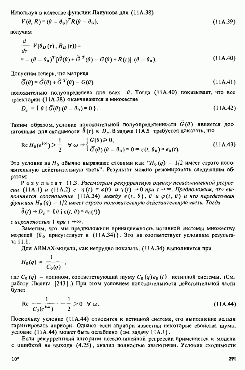 Можно использовать физическую параметризацию динамики системы в сочетании с формальной (по методу черного ящика) параметризацией характеристик шума такой, например, как непосредственная параметризация формы обновлений (4,88), или принимая такую модель шума, которая также является физически параметризованной с помощью соотношений (4.93)-(4,96). Наконец, мы можем использовать структуры черного ящика в пространстве состояний, как скажем, в примере 4.2. В этом случае описание входо-выходного соответствия моделью черного ящика имеет преимущество гибкости в выборе такого представления, которое может обеспечить достижение лучших количественных характеристик процесса параметризации (задача 16Е.1).