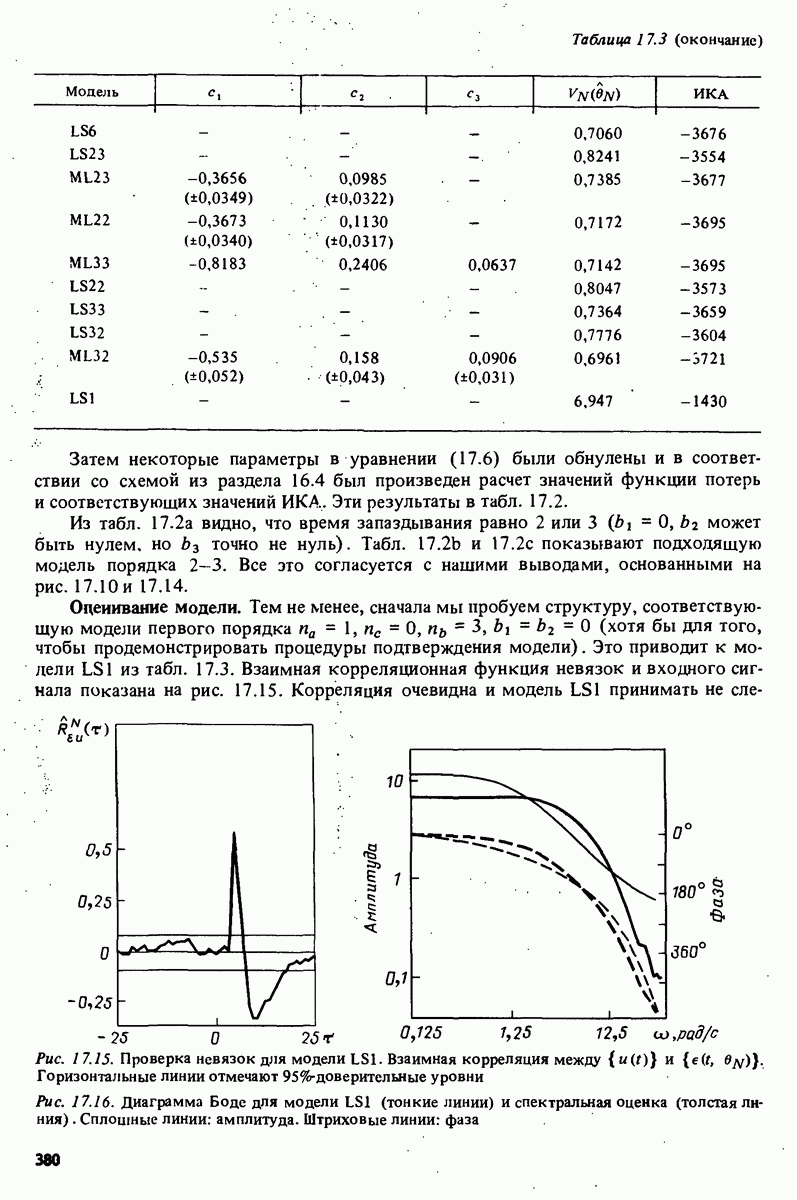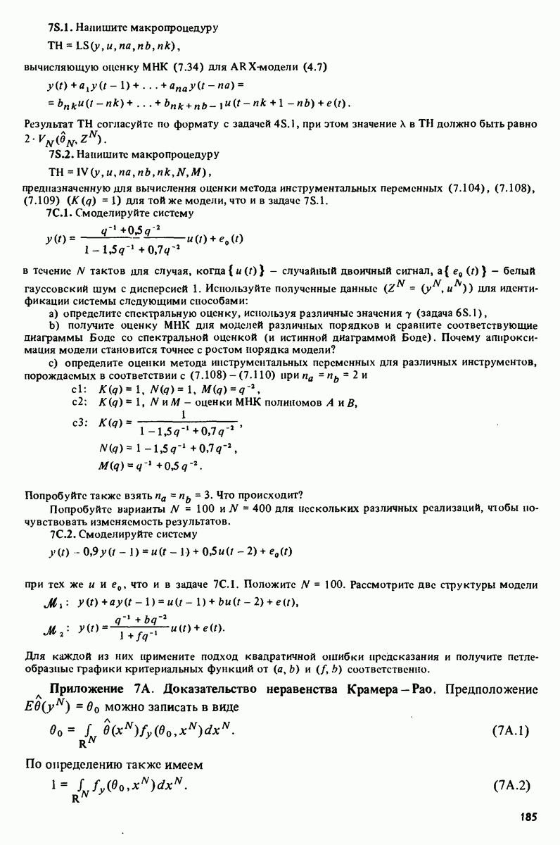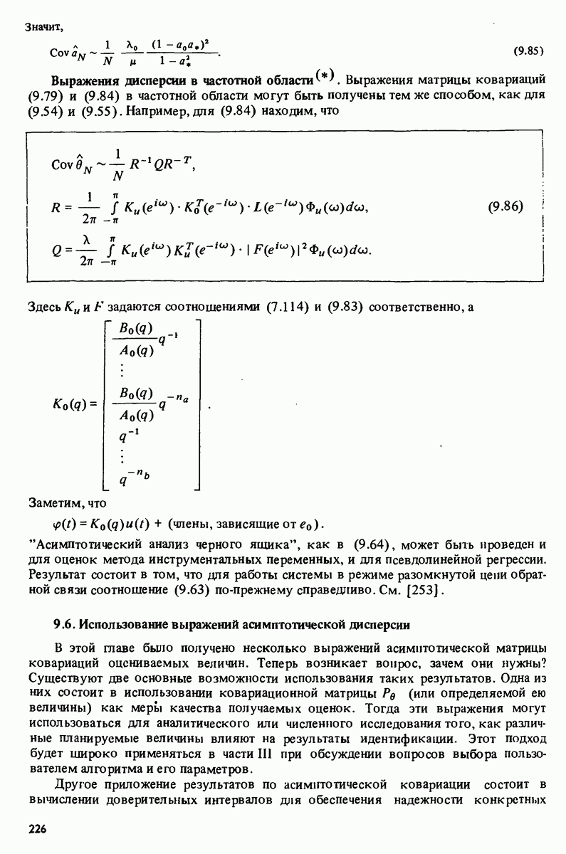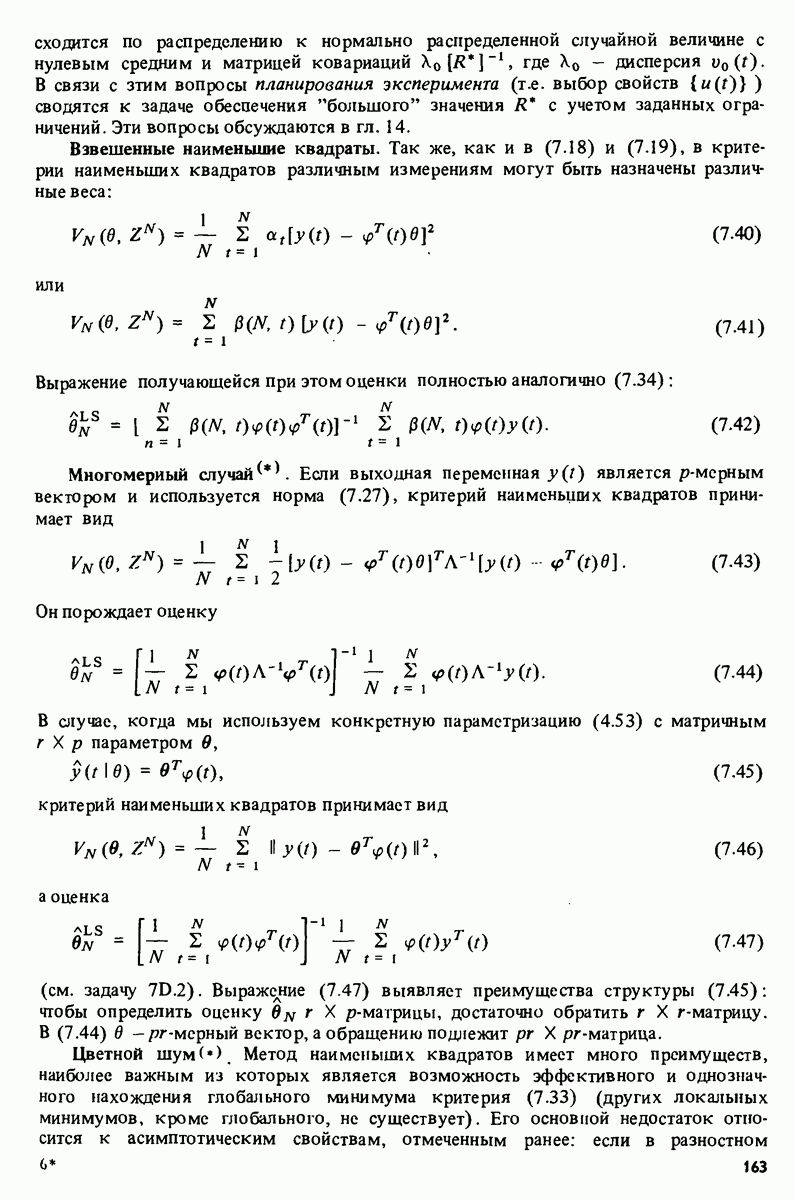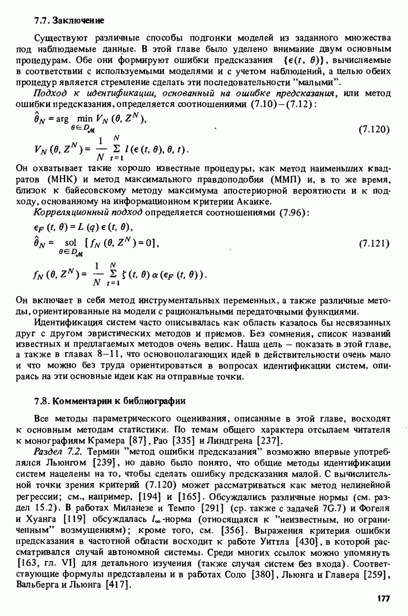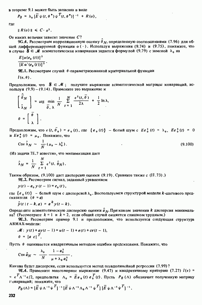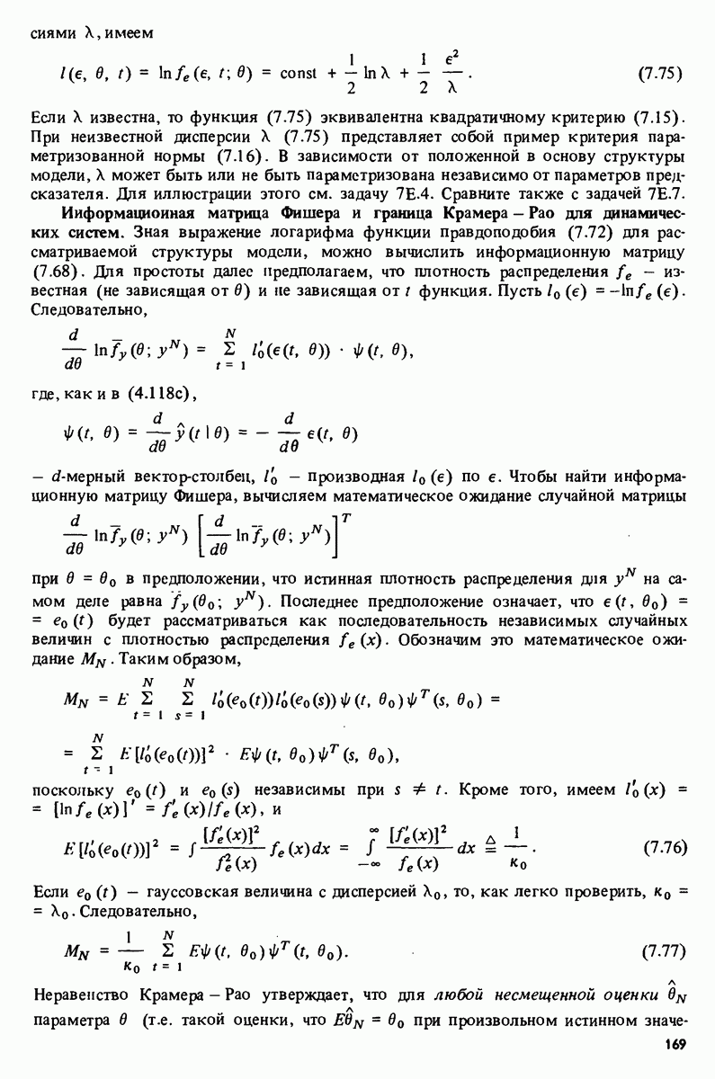 Можно использовать физическую параметризацию динамики системы в сочетании с формальной (по методу черного ящика) параметризацией характеристик шума такой, например, как непосредственная параметризация формы обновлений (4,88), или принимая такую модель шума, которая также является физически параметризованной с помощью соотношений (4.93)-(4,96). Наконец, мы можем использовать структуры черного ящика в пространстве состояний, как скажем, в примере 4.2. В этом случае описание входо-выходного соответствия моделью черного ящика имеет преимущество гибкости в выборе такого представления, которое может обеспечить достижение лучших количественных характеристик процесса параметризации (задача 16Е.1).