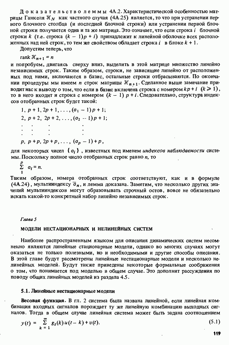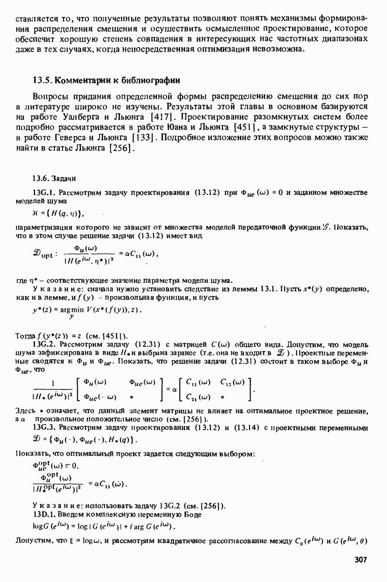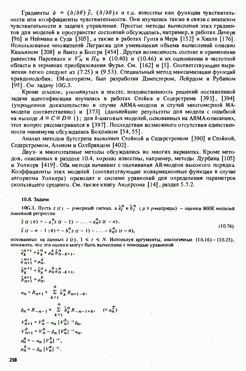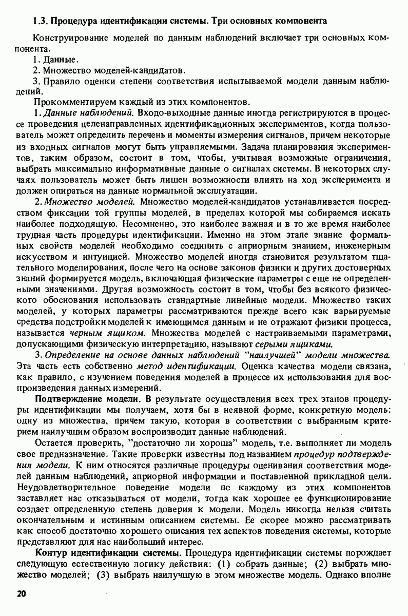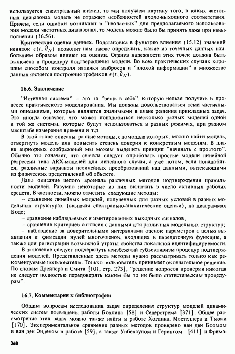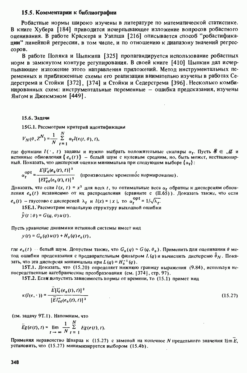 Можно использовать физическую параметризацию динамики системы в сочетании с формальной (по методу черного ящика) параметризацией характеристик шума такой, например, как непосредственная параметризация формы обновлений (4,88), или принимая такую модель шума, которая также является физически параметризованной с помощью соотношений (4.93)-(4,96). Наконец, мы можем использовать структуры черного ящика в пространстве состояний, как скажем, в примере 4.2. В этом случае описание входо-выходного соответствия моделью черного ящика имеет преимущество гибкости в выборе такого представления, которое может обеспечить достижение лучших количественных характеристик процесса параметризации (задача 16Е.1).
