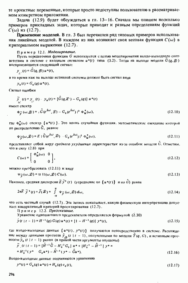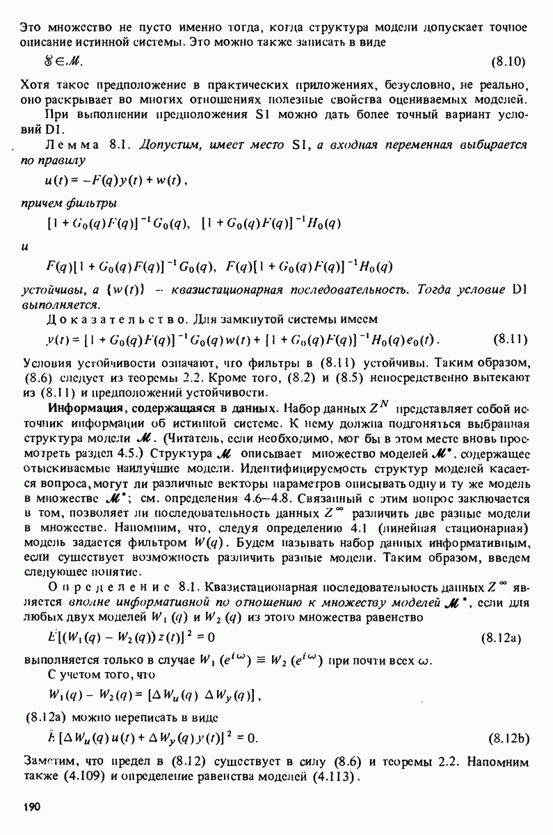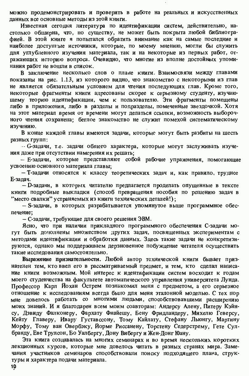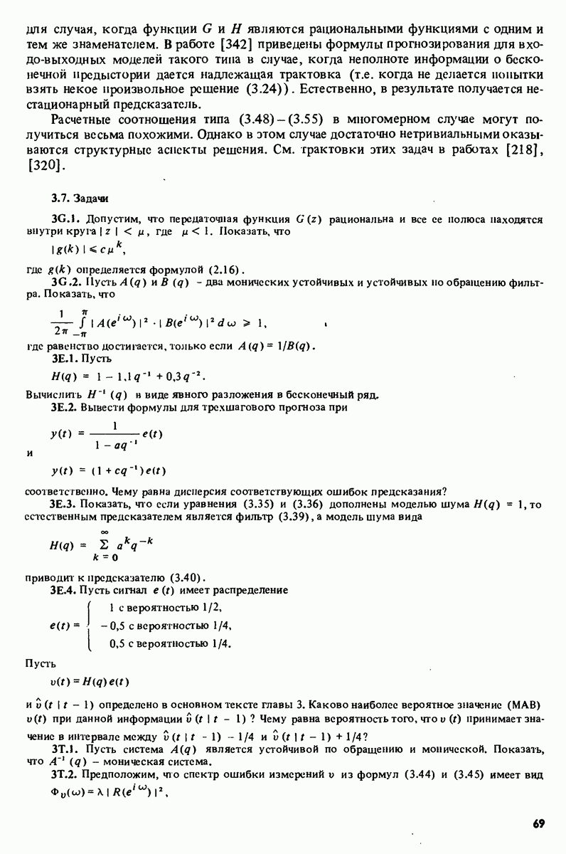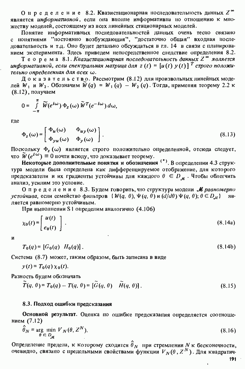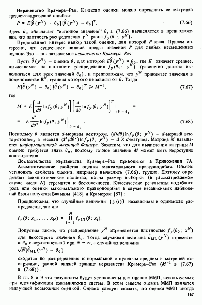 Можно использовать физическую параметризацию динамики системы в сочетании с формальной (по методу черного ящика) параметризацией характеристик шума такой, например, как непосредственная параметризация формы обновлений (4,88), или принимая такую модель шума, которая также является физически параметризованной с помощью соотношений (4.93)-(4,96). Наконец, мы можем использовать структуры черного ящика в пространстве состояний, как скажем, в примере 4.2. В этом случае описание входо-выходного соответствия моделью черного ящика имеет преимущество гибкости в выборе такого представления, которое может обеспечить достижение лучших количественных характеристик процесса параметризации (задача 16Е.1).