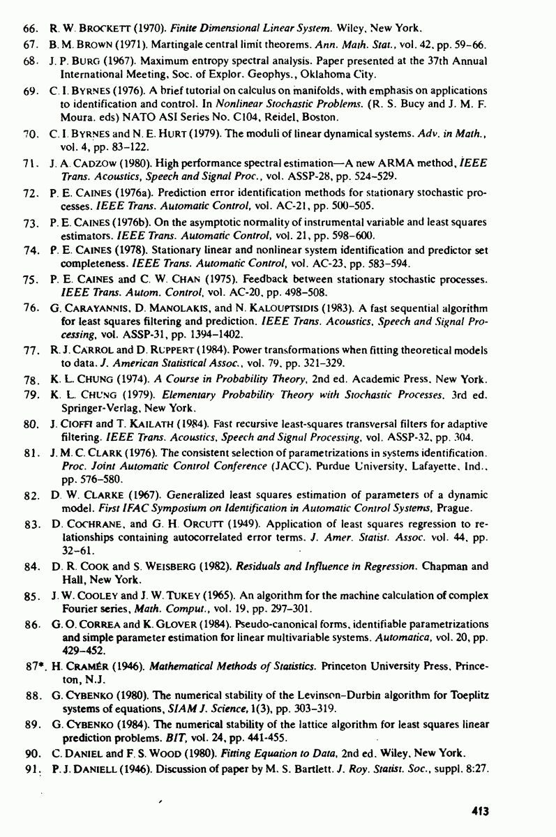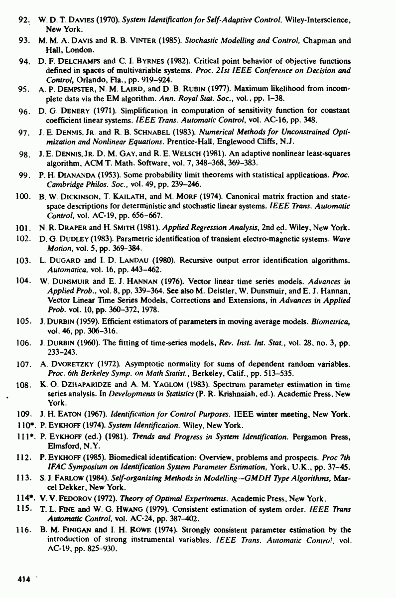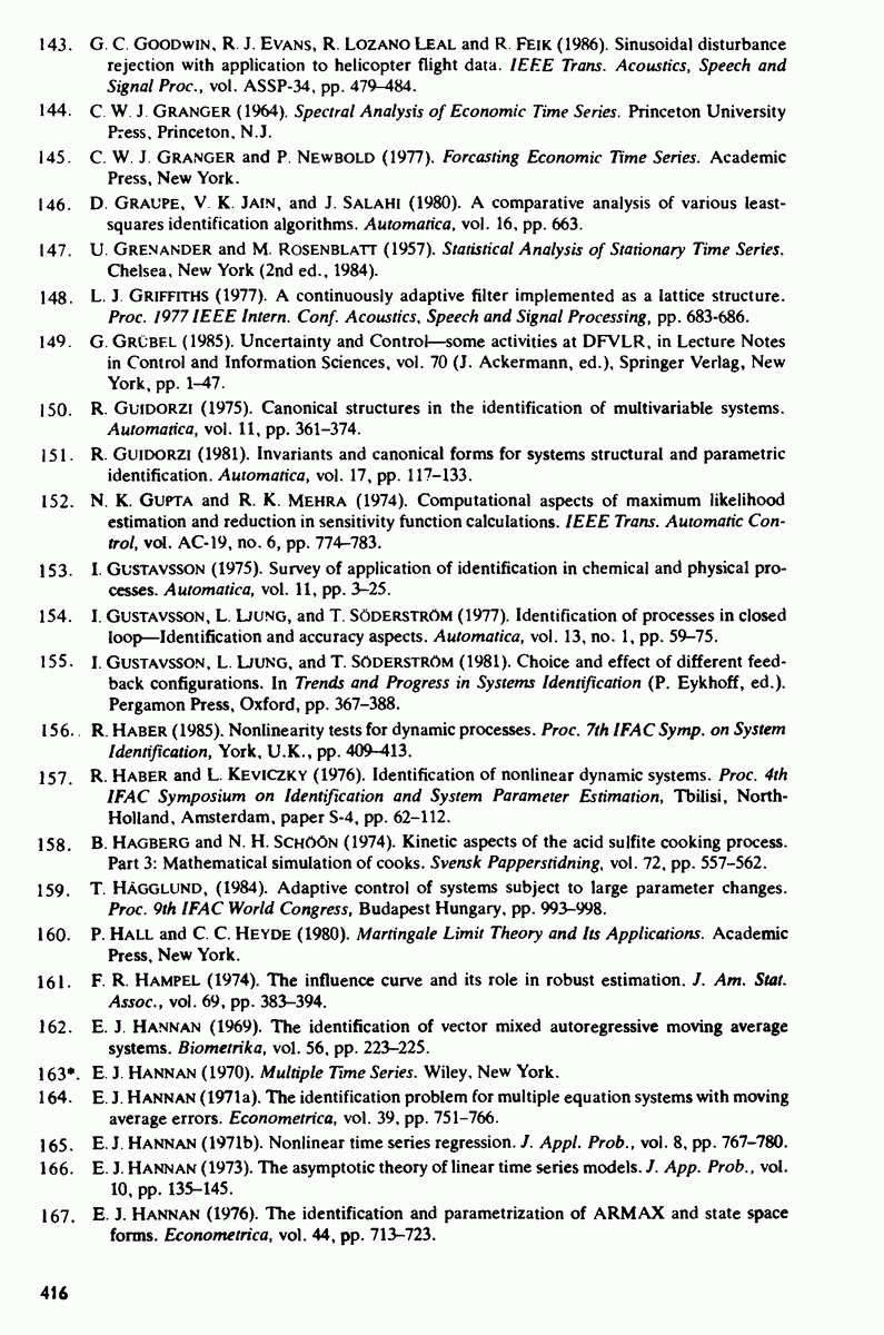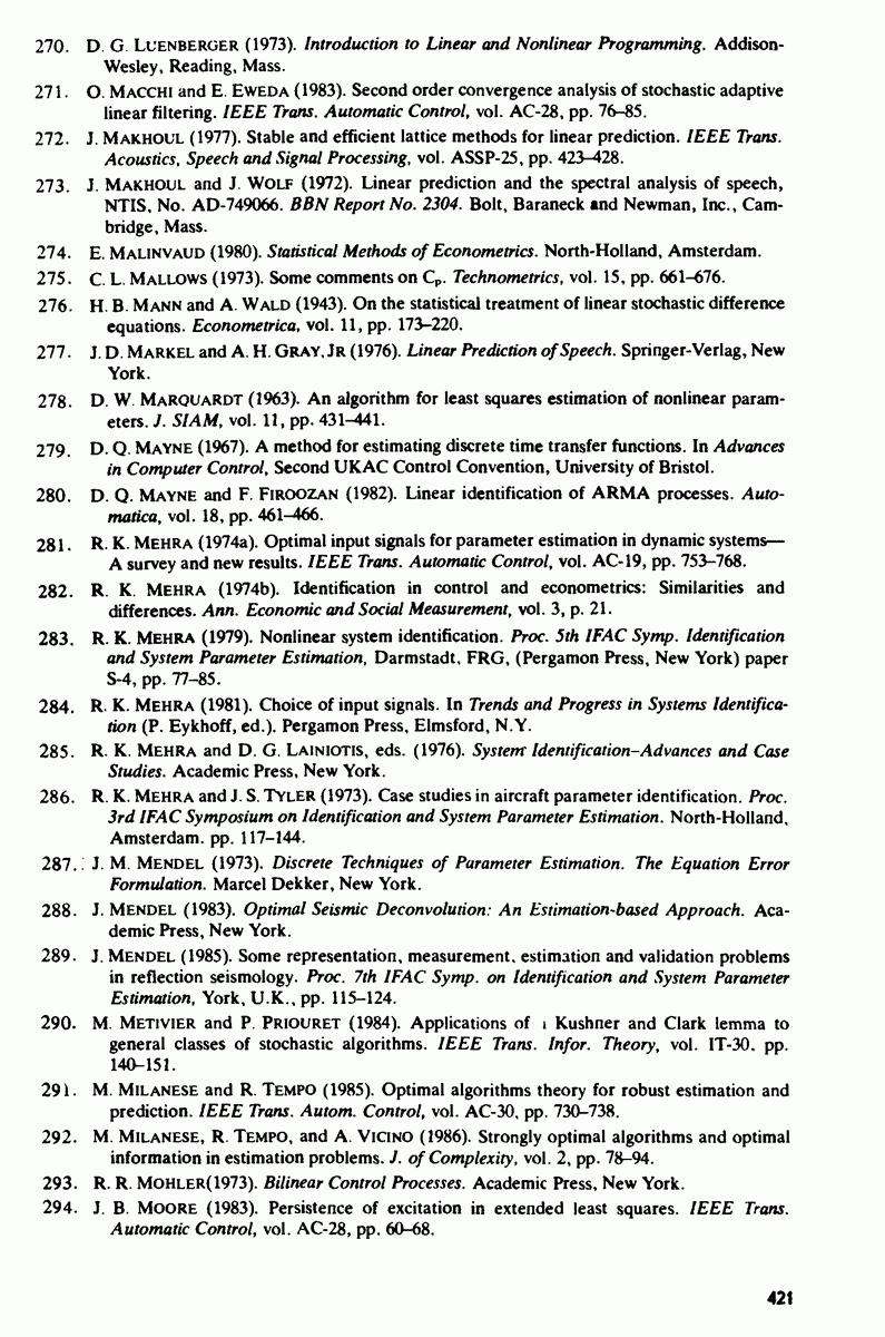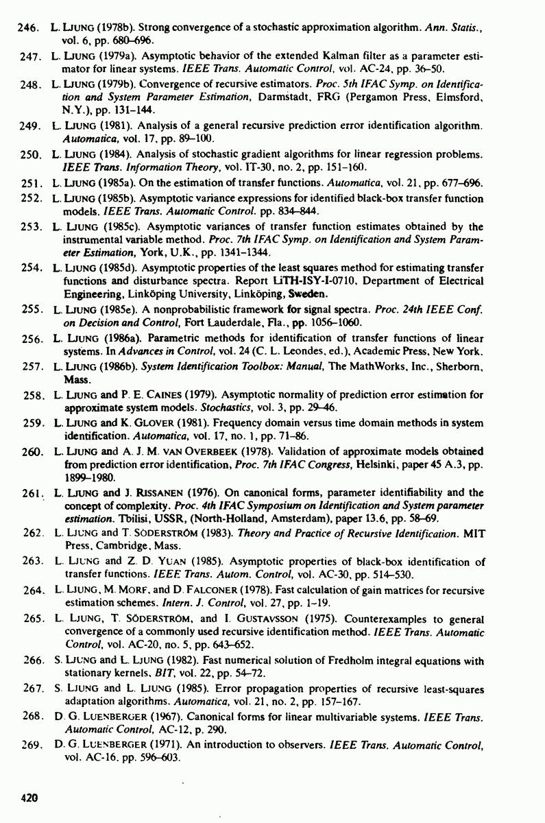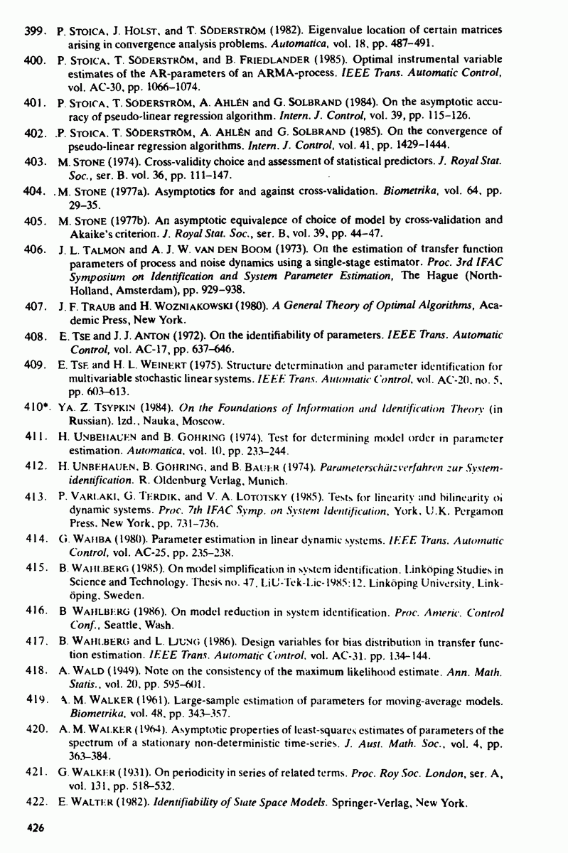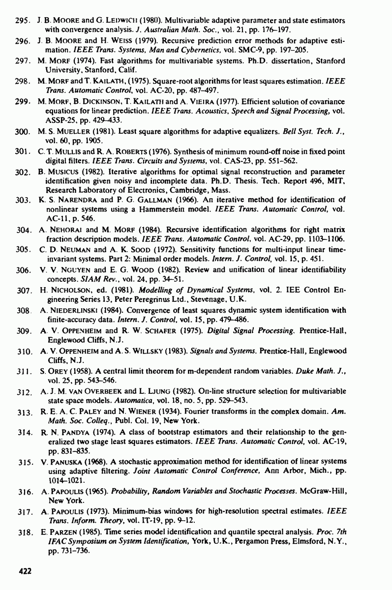 Можно использовать физическую параметризацию динамики системы в сочетании с формальной (по методу черного ящика) параметризацией характеристик шума такой, например, как непосредственная параметризация формы обновлений (4,88), или принимая такую модель шума, которая также является физически параметризованной с помощью соотношений (4.93)-(4,96). Наконец, мы можем использовать структуры черного ящика в пространстве состояний, как скажем, в примере 4.2. В этом случае описание входо-выходного соответствия моделью черного ящика имеет преимущество гибкости в выборе такого представления, которое может обеспечить достижение лучших количественных характеристик процесса параметризации (задача 16Е.1).