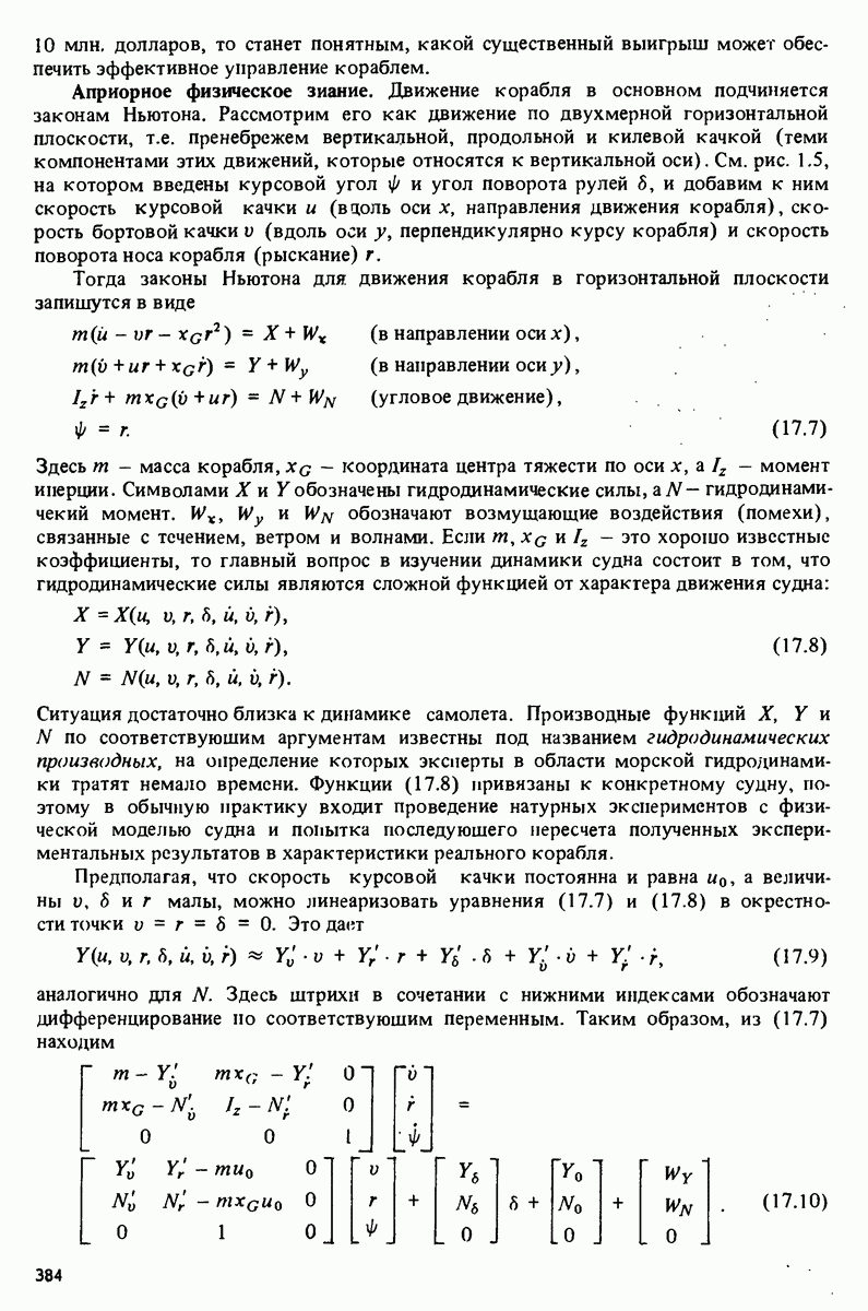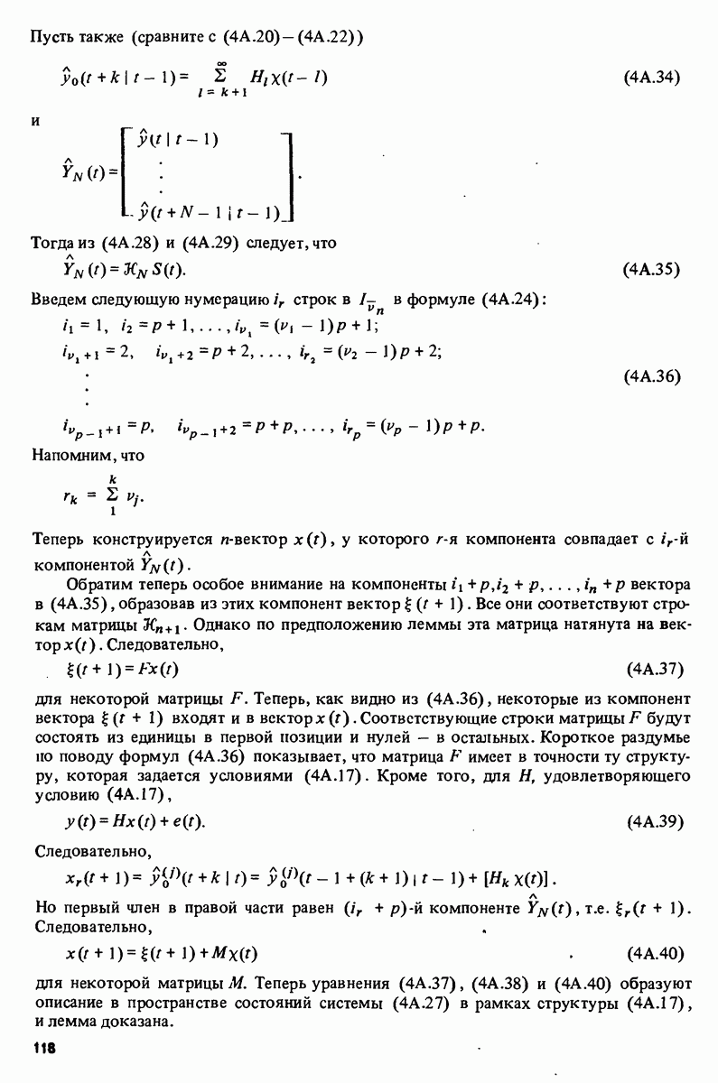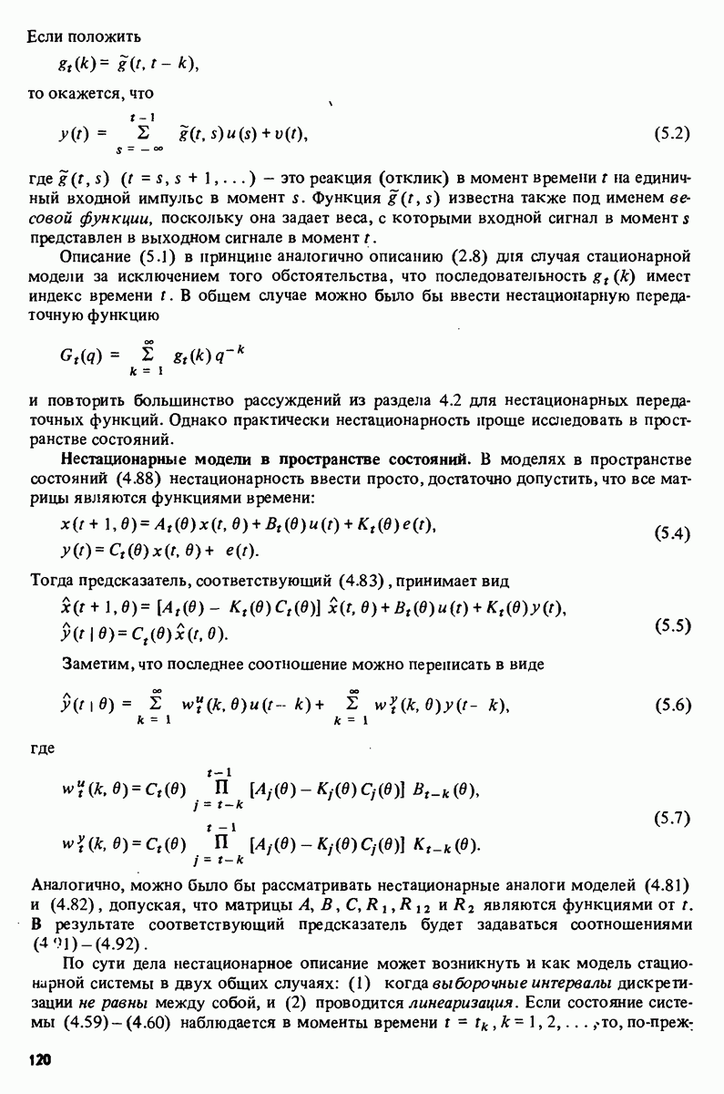 Этот способ описания линейных динамических систем стал преобладающим со времени первой работы Калмана [204], посвященной вопросам прогнозирования и линейно-квадратичного управления. В нашем случае этот способ особенно хорош тем, что имеющиеся физические представления о механизмах работы системы обычно гораздо проще учесть в моделях в пространстве состояний, чем в моделях, рассмотренных в п. 4.2.