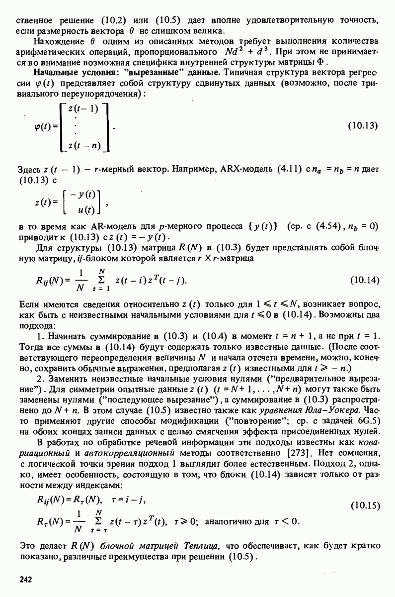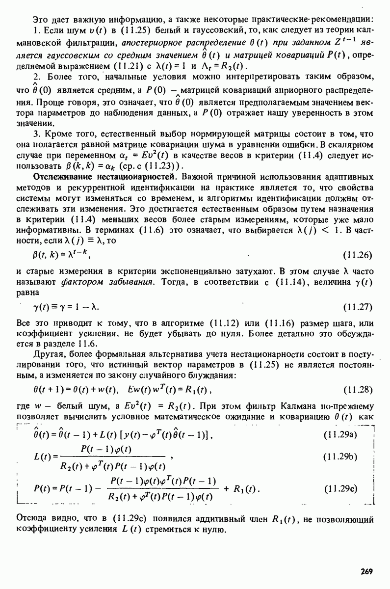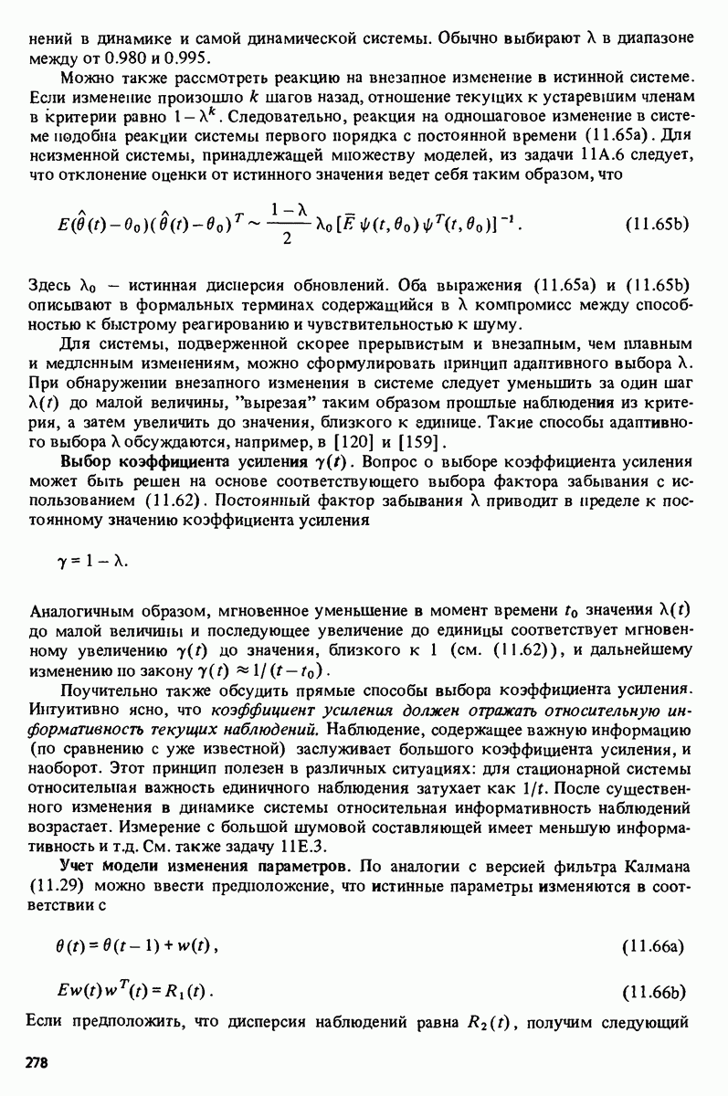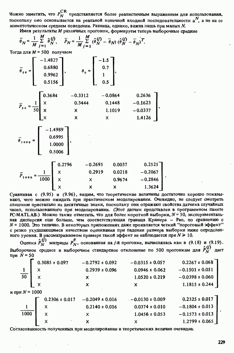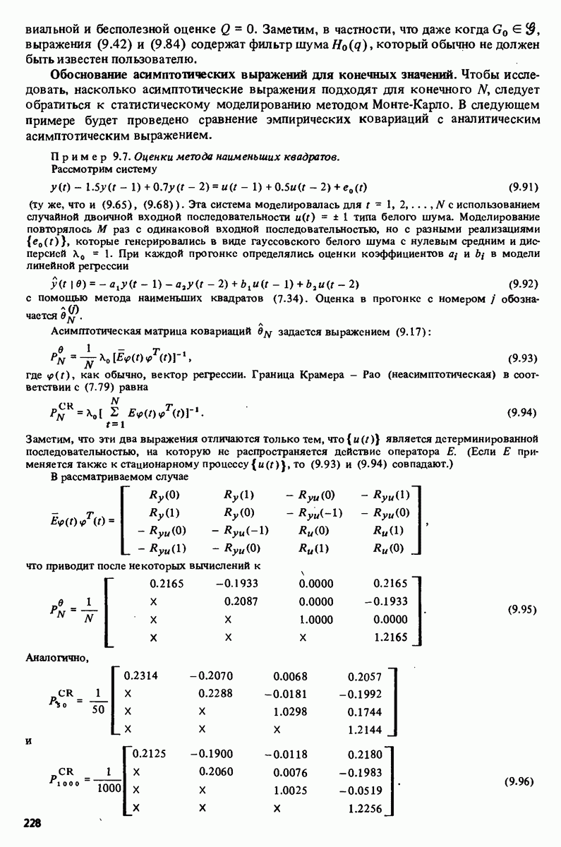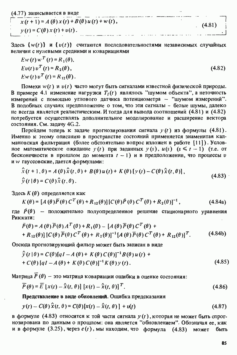 из формулы (4,84) (см., например, [11]). Таким образом, во многих задачах для упрощения вычислительных процедур разумно непосредственно использовать предельные значения оценок (4.83) при учете (4.84). Вирочем, когда записи данных короткие, решение уравнений (4.90)- (4.92) обеспечивает нас возможностью корректного исследования переходных свойств оценок, включая, быть может, параметризацию неизвестных начальных условий