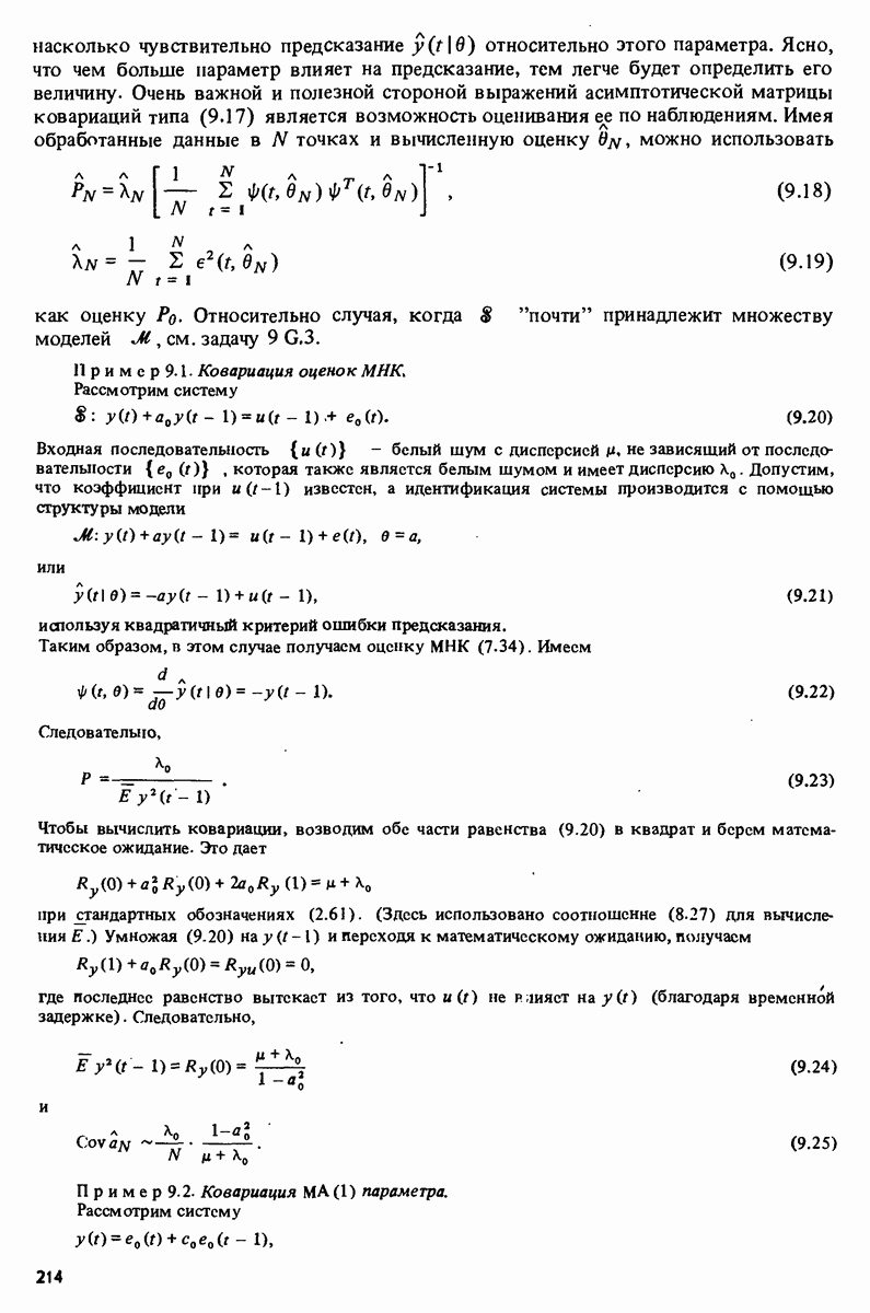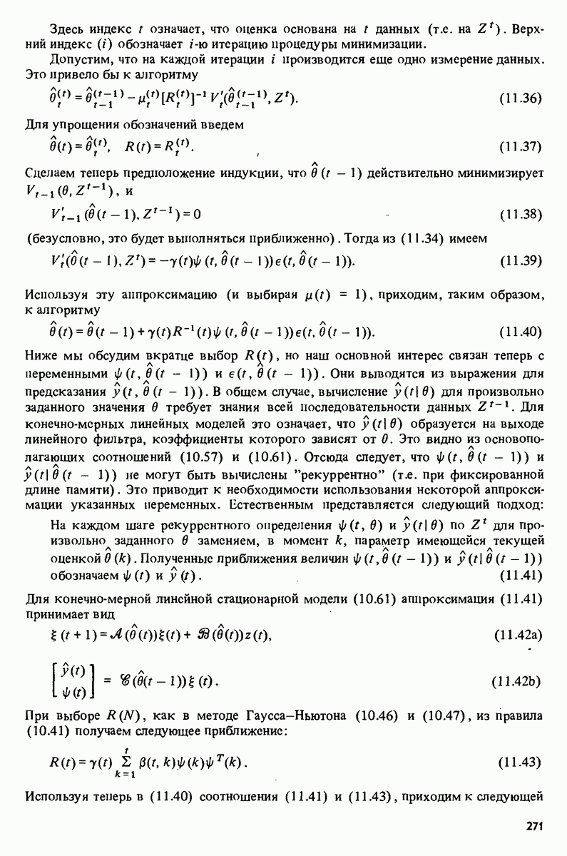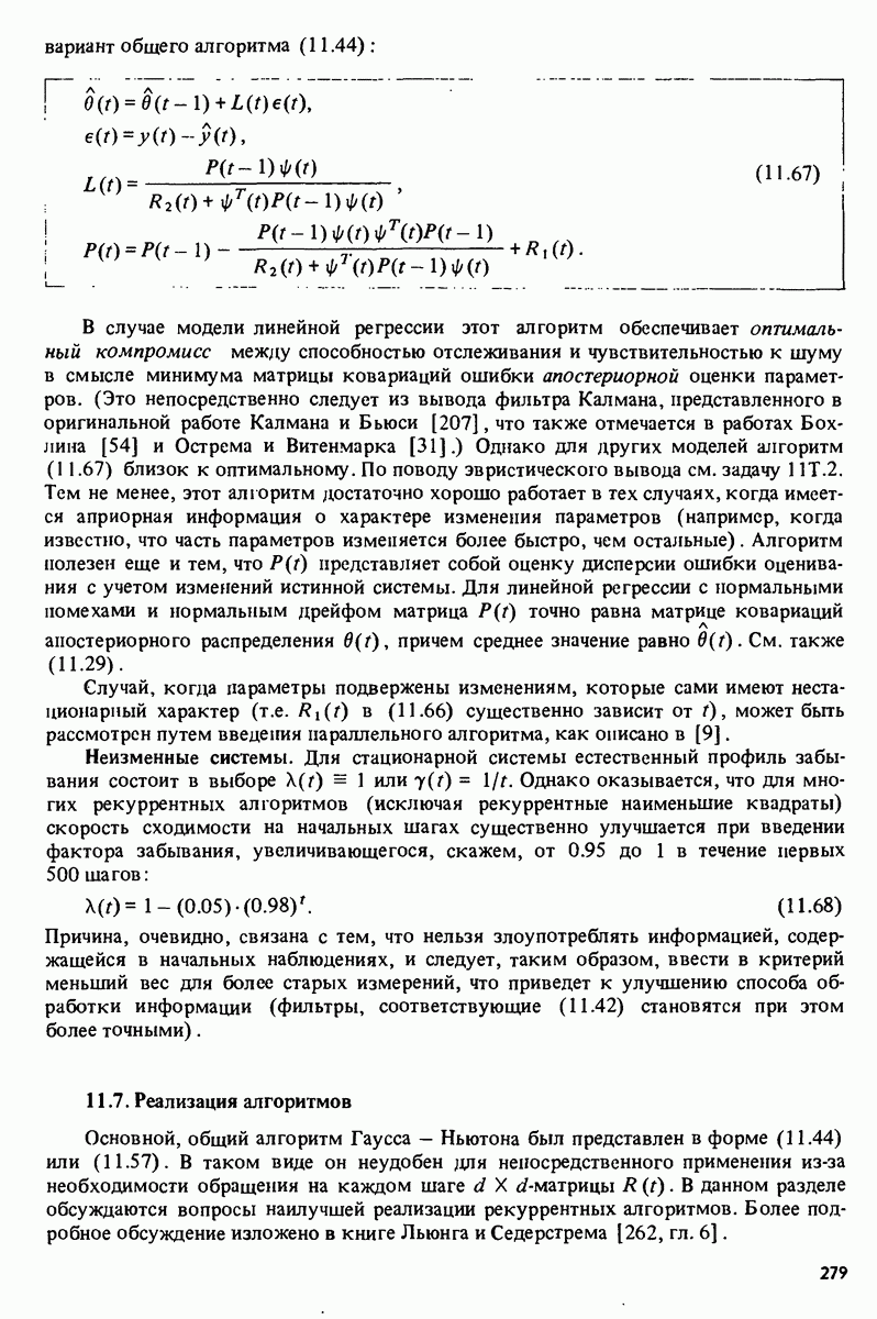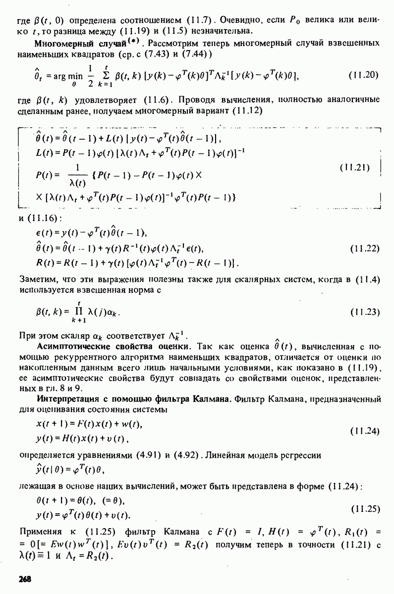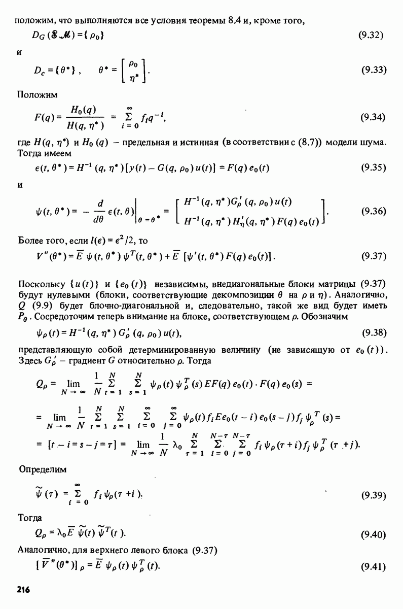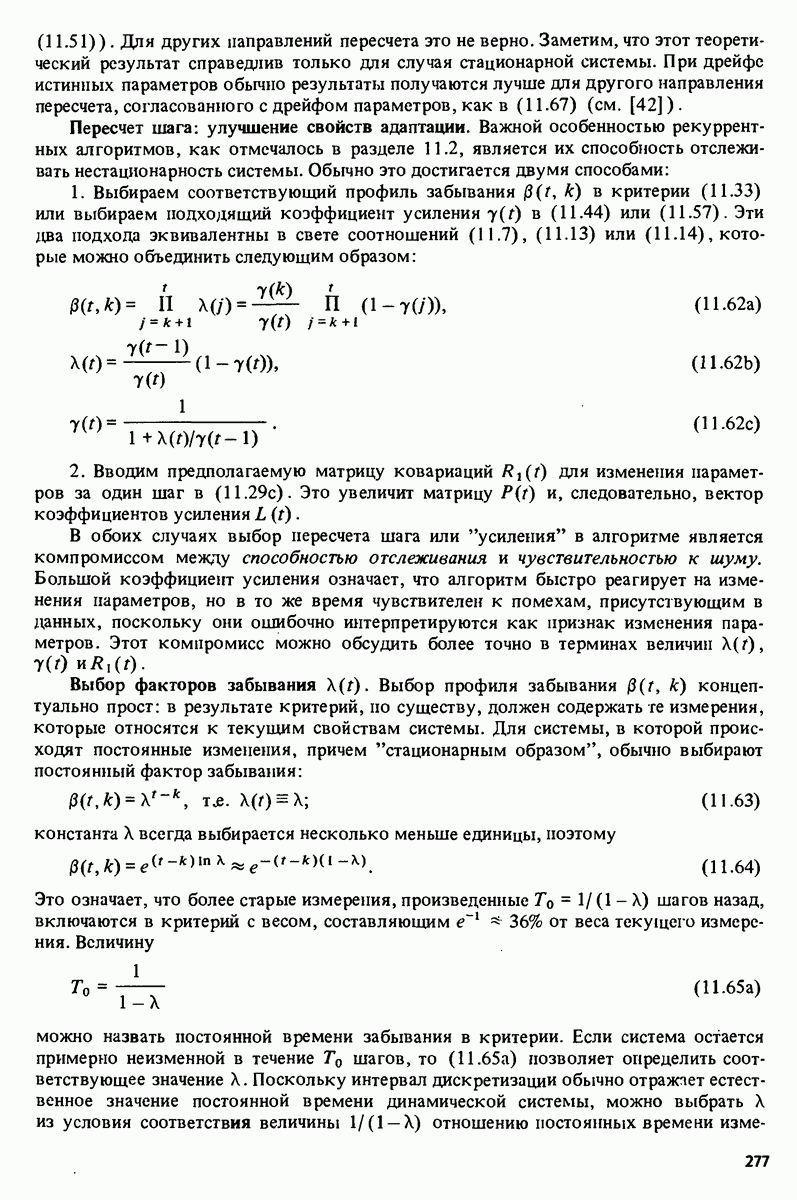 из формулы (4,84) (см., например, [11]). Таким образом, во многих задачах для упрощения вычислительных процедур разумно непосредственно использовать предельные значения оценок (4.83) при учете (4.84). Вирочем, когда записи данных короткие, решение уравнений (4.90)- (4.92) обеспечивает нас возможностью корректного исследования переходных свойств оценок, включая, быть может, параметризацию неизвестных начальных условий