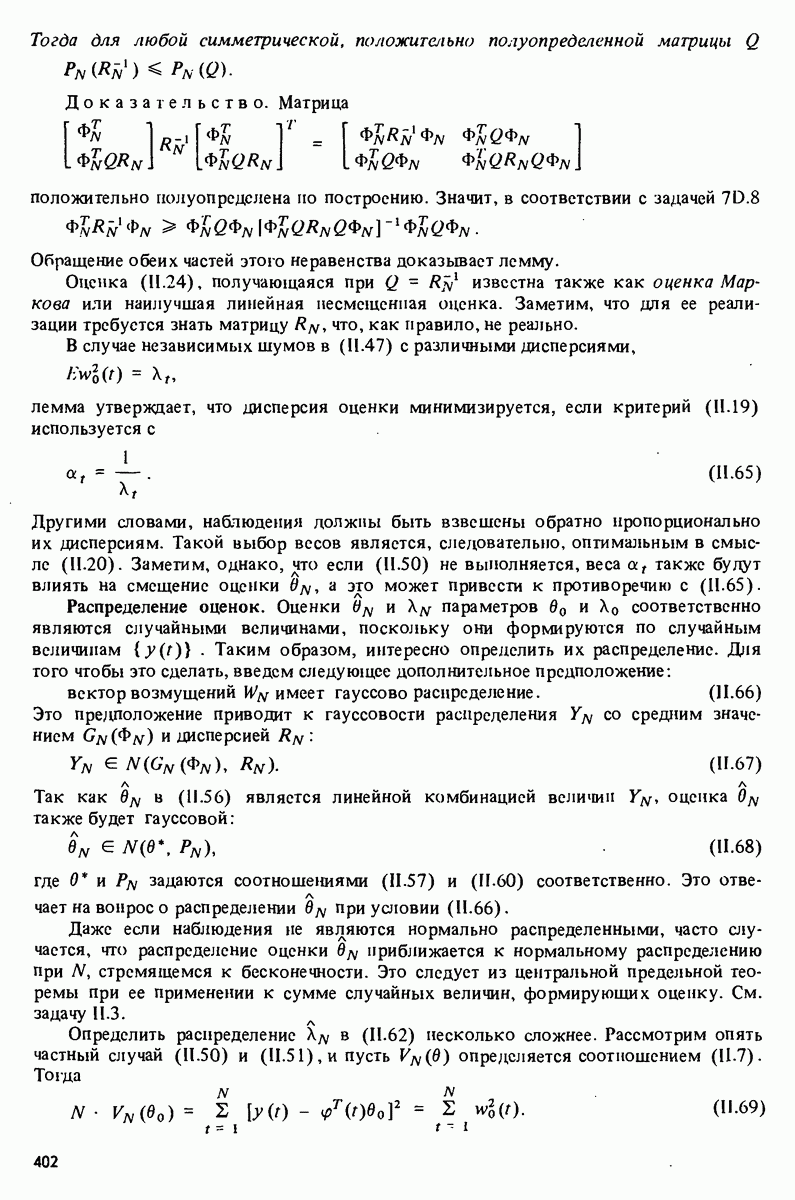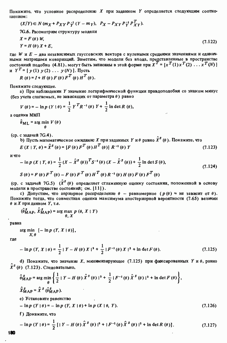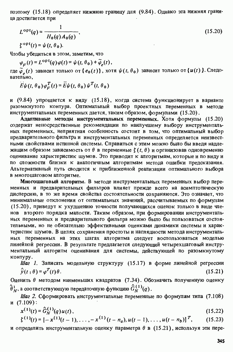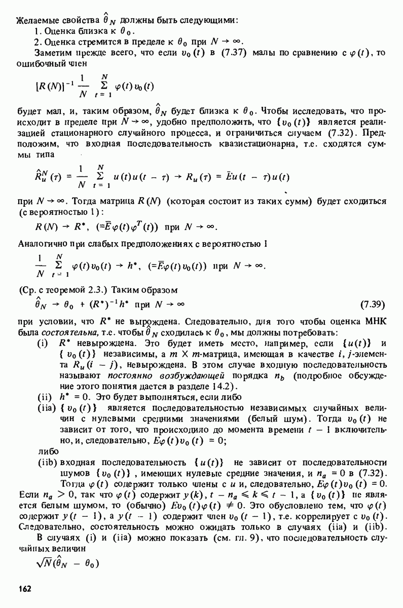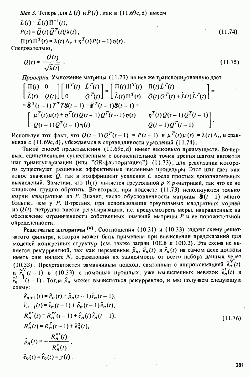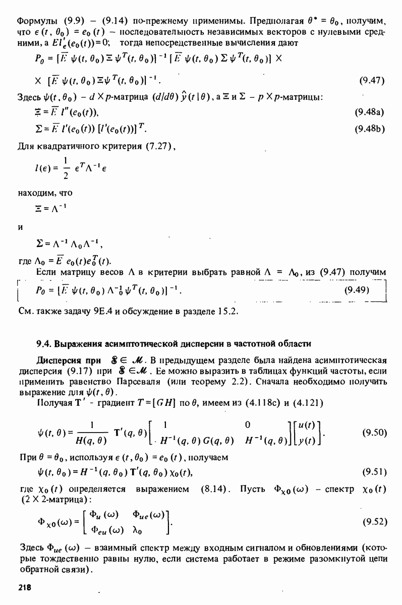 из формулы (4,84) (см., например, [11]). Таким образом, во многих задачах для упрощения вычислительных процедур разумно непосредственно использовать предельные значения оценок (4.83) при учете (4.84). Вирочем, когда записи данных короткие, решение уравнений (4.90)- (4.92) обеспечивает нас возможностью корректного исследования переходных свойств оценок, включая, быть может, параметризацию неизвестных начальных условий