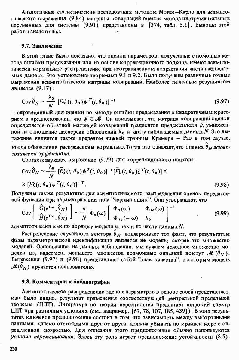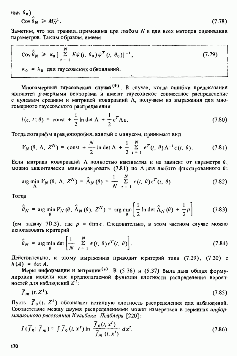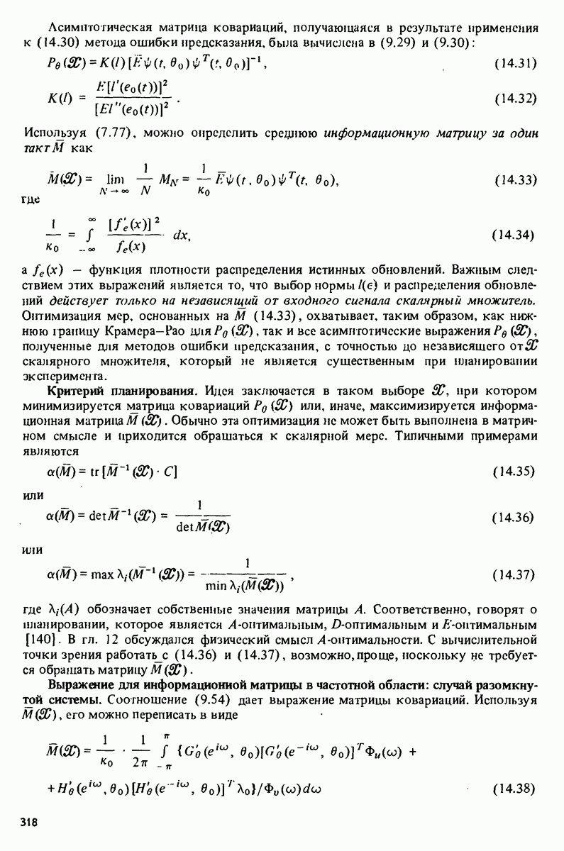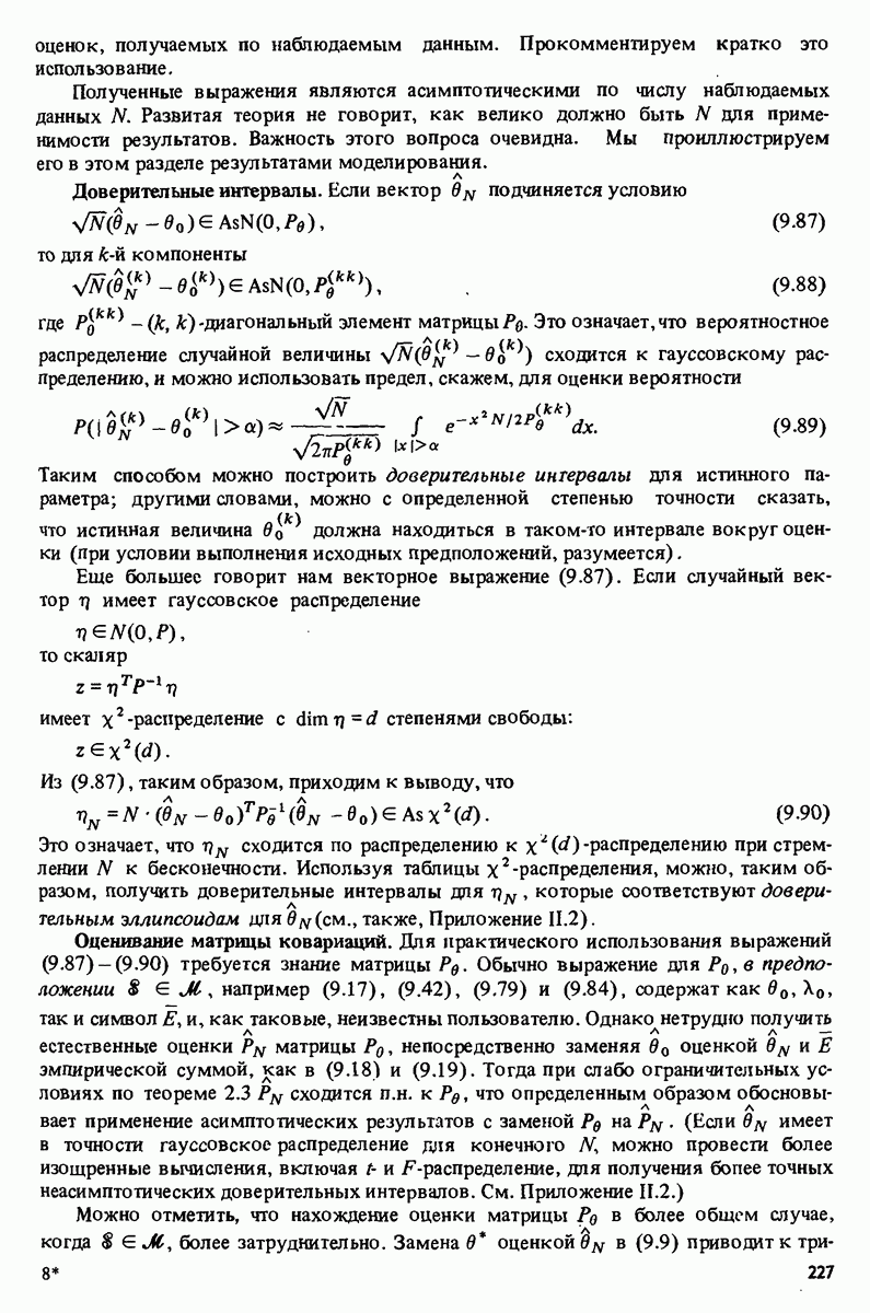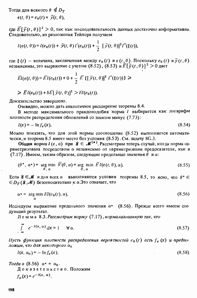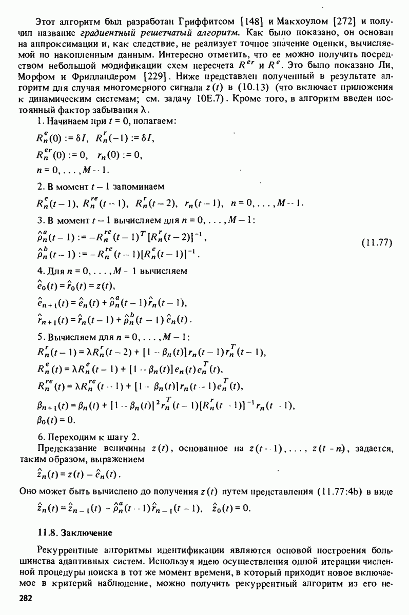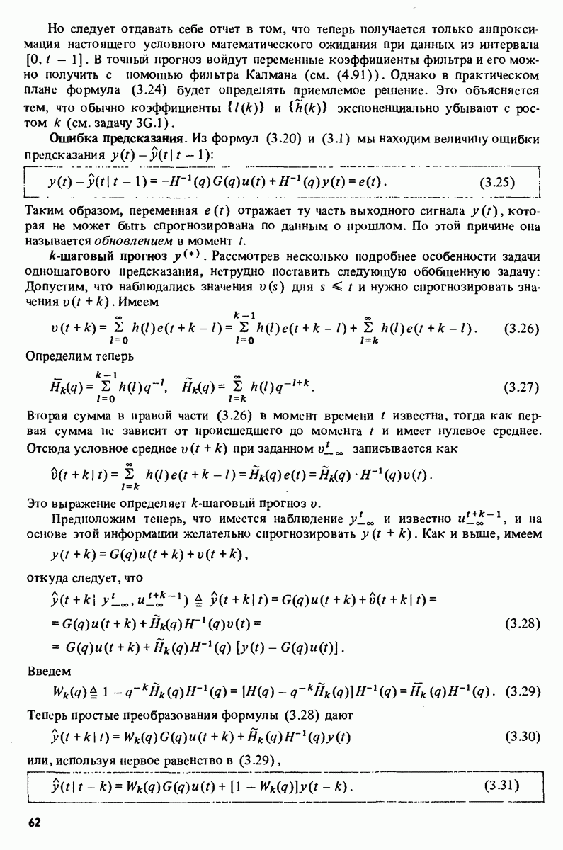 из формулы (4,84) (см., например, [11]). Таким образом, во многих задачах для упрощения вычислительных процедур разумно непосредственно использовать предельные значения оценок (4.83) при учете (4.84). Вирочем, когда записи данных короткие, решение уравнений (4.90)- (4.92) обеспечивает нас возможностью корректного исследования переходных свойств оценок, включая, быть может, параметризацию неизвестных начальных условий