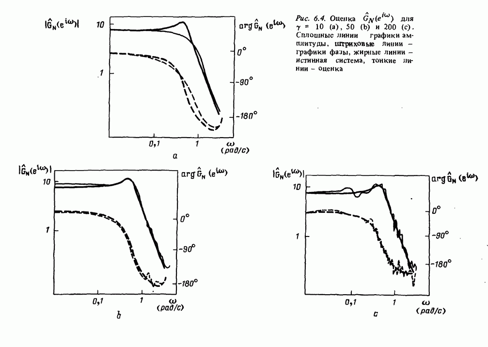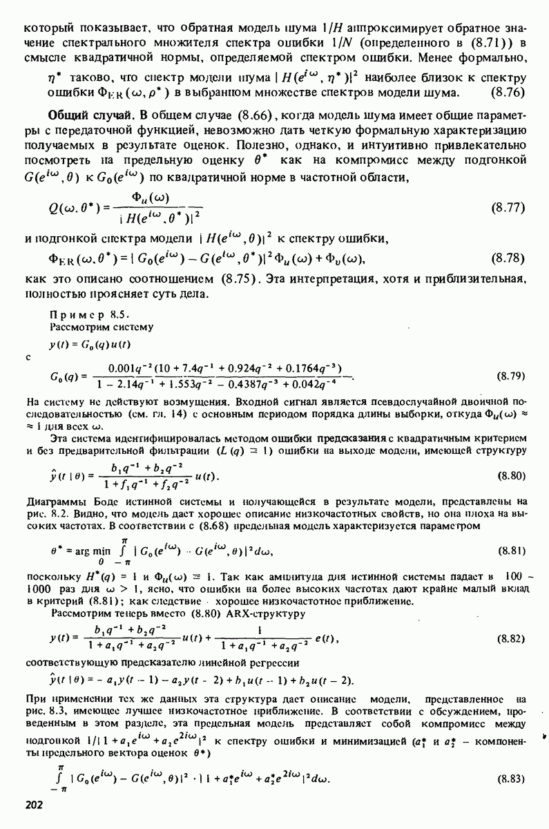 Отметим, что если бы на основе физических соображений мы всего-навсего заключили бы, что наша система второго порядка, то нам пришлось бы использовать ARX-модель или модель выходной ошибки второго порядка с четырьмя настраиваемыми параметрами. Как мы увидим, уменьшение числа параметров оказывает некоторое положительное воздействие на процедуру оценивания: дисперсии оценок параметров начинают убывать. Однако это достигается не бесплатно. Предсказатель (4.76) является гораздо более сложной функцией от двух своих параметров, чем соответствующие ARX-модель или модель выходной ошибки с их четырьмя параметрами.