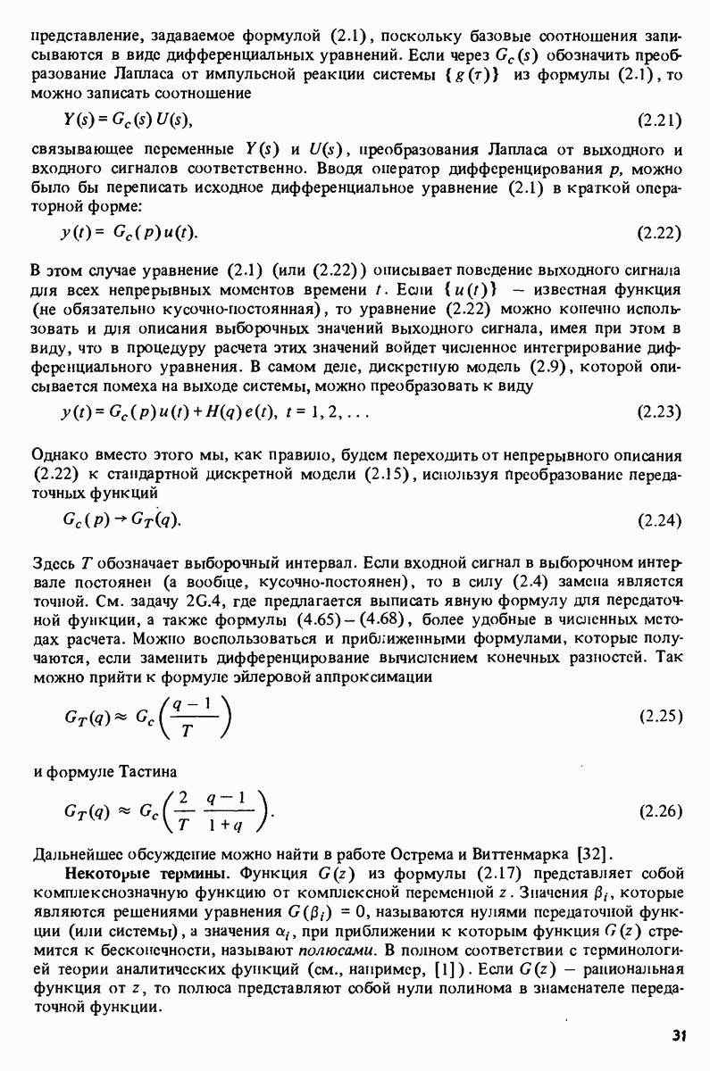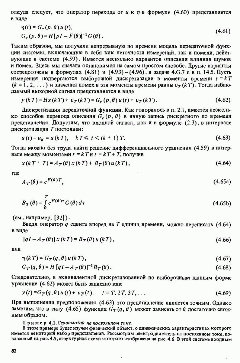 Таким образом, мы получили непрерывную по времени модель передаточной функции системы, включающую в себя как неточности измерений, так и помехи, действующие в системе (4.59). Имеется несколько вариантов описания влияния шумов и помех. Здесь мы сначала остановимся на самом простом способе. Другие варианты сосредоточены в формулах (4.81) и (4.93)-(4.96), в задаче 4.G.7 и в п. 14.5. Пусть измерения подвергаются выборочной дискретизации в моменты времени