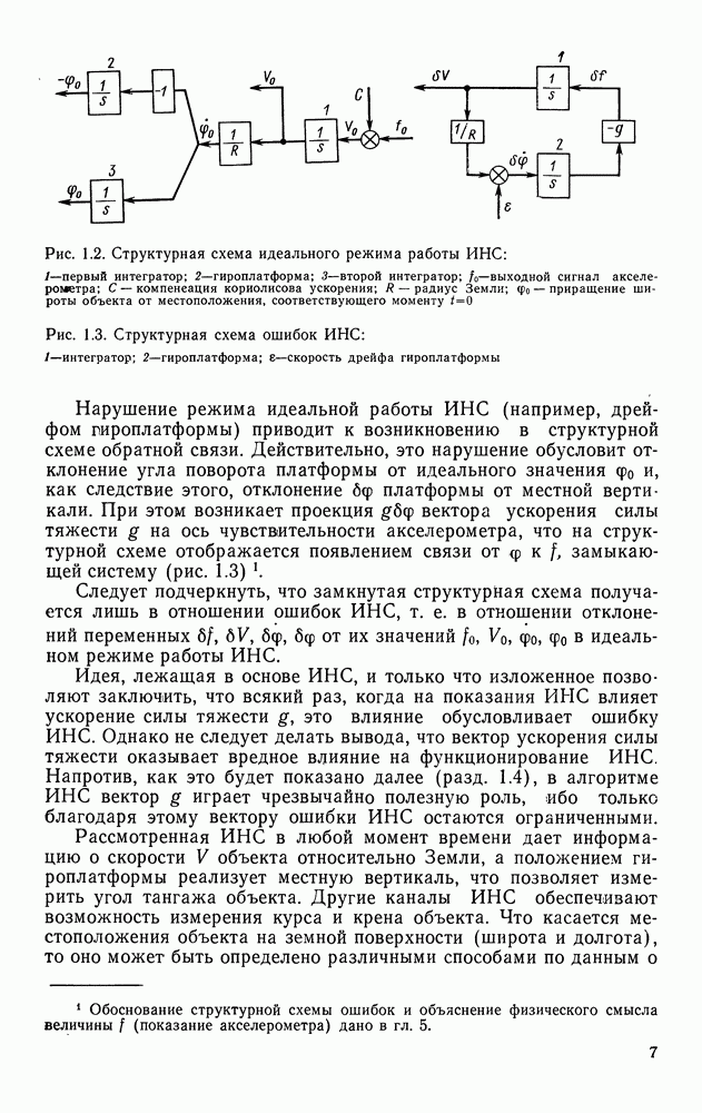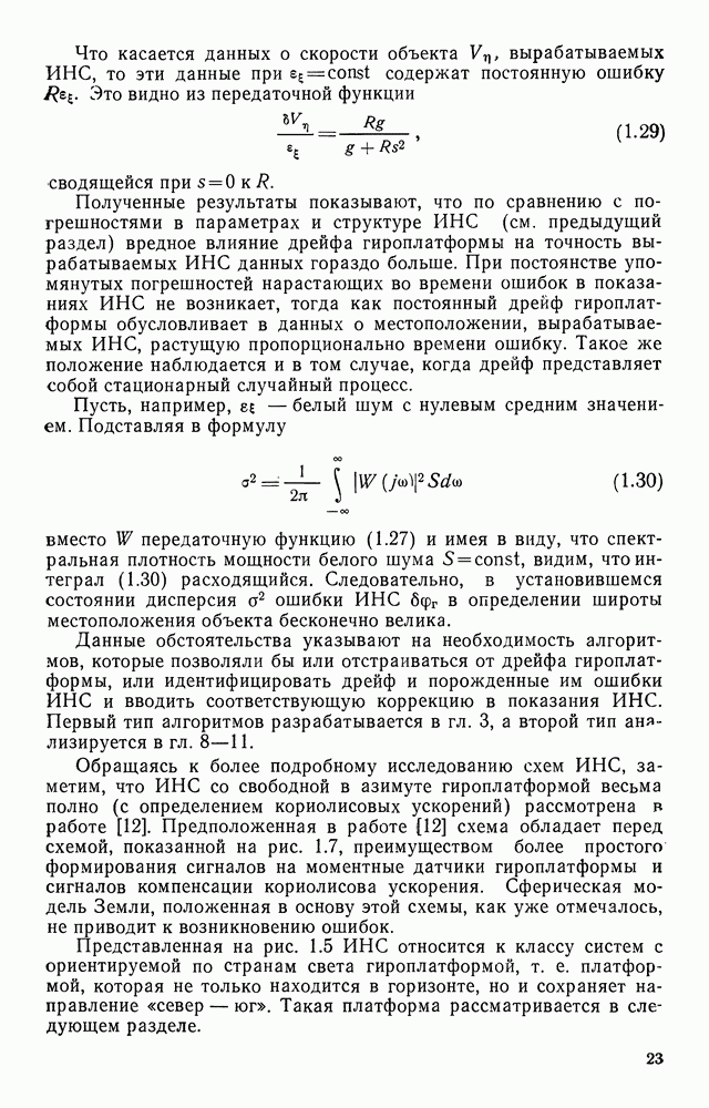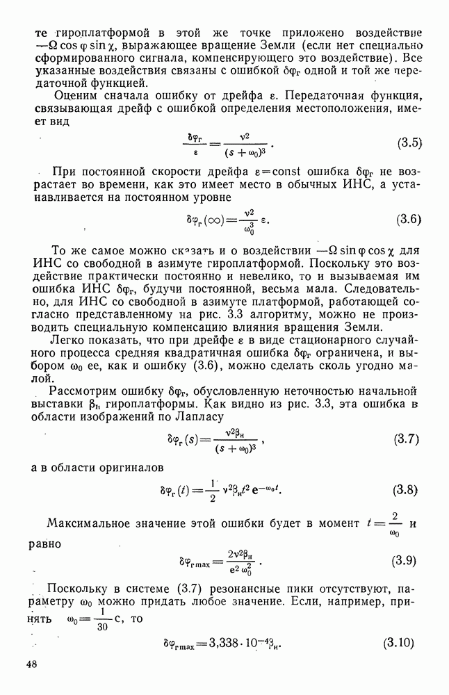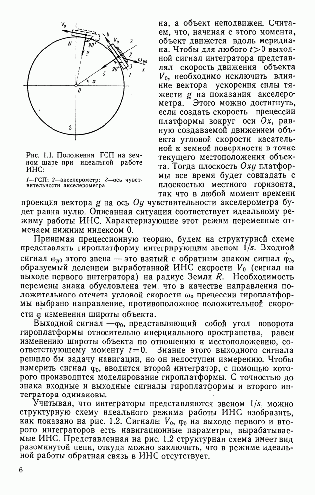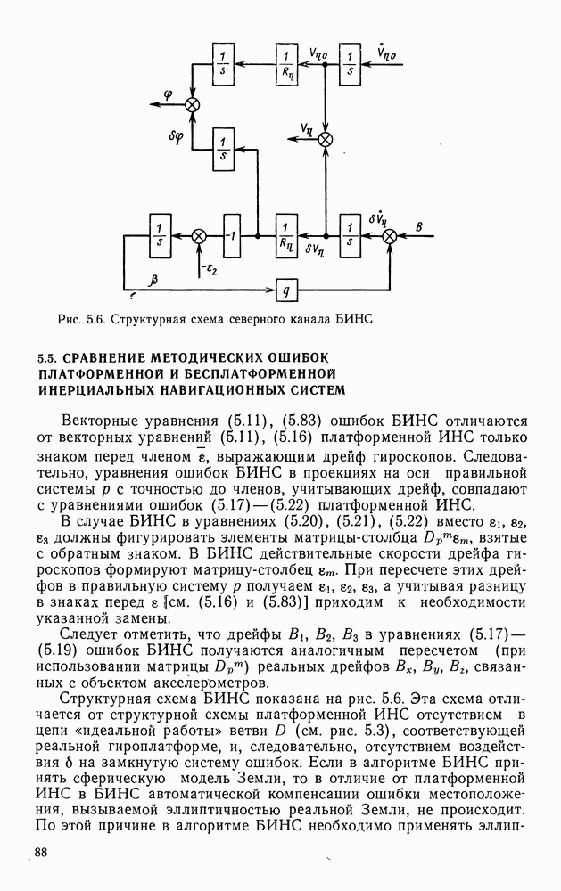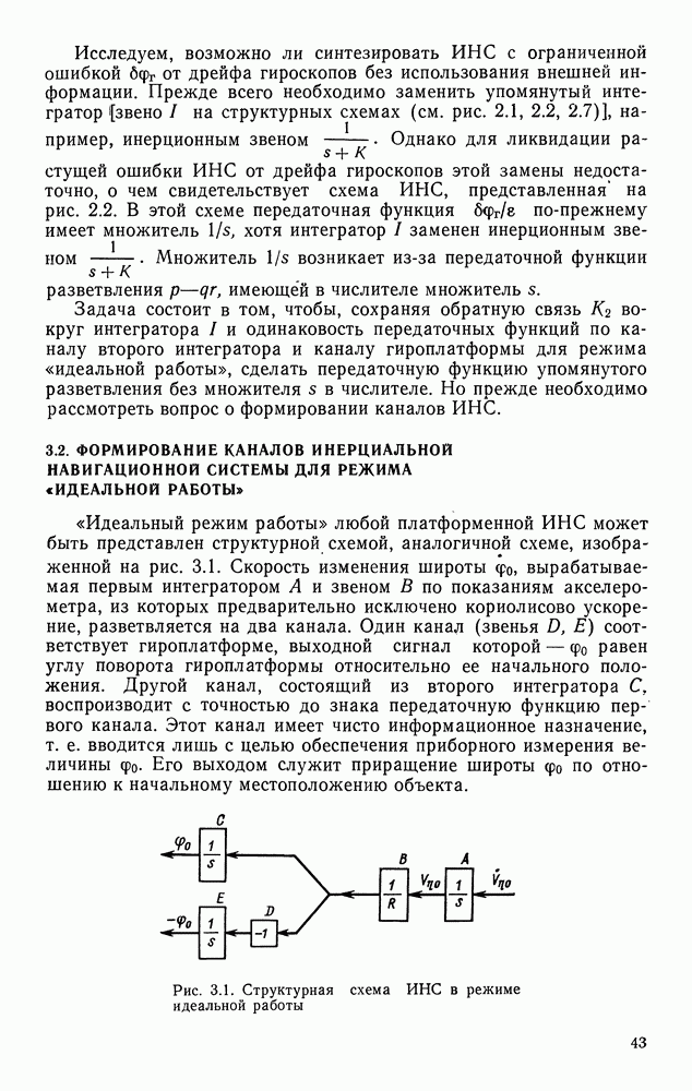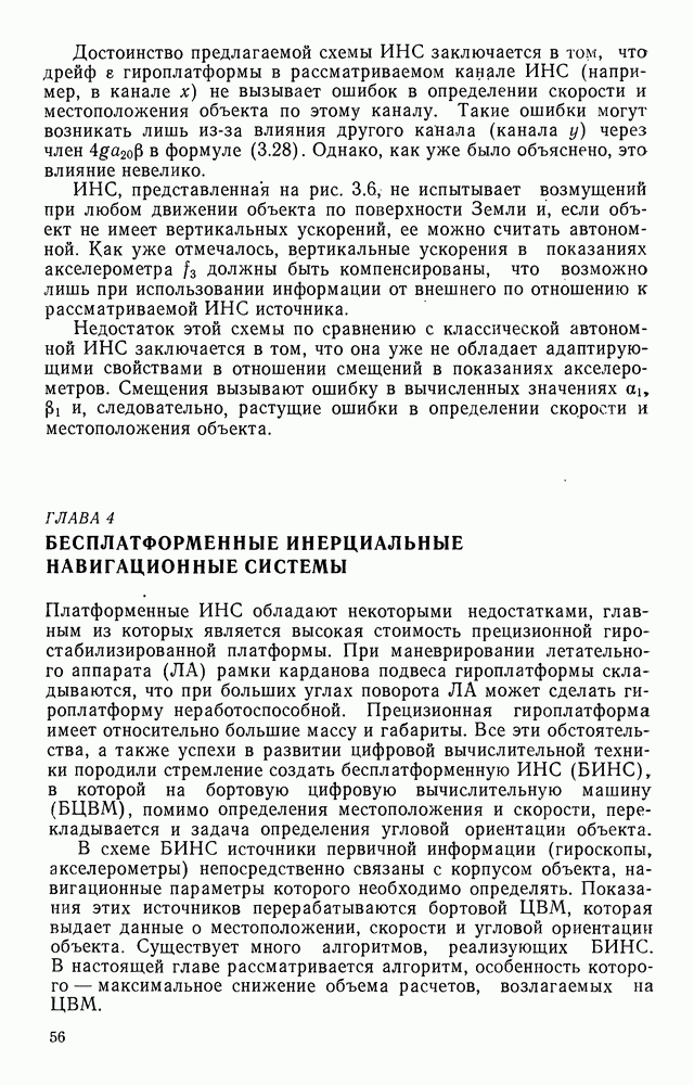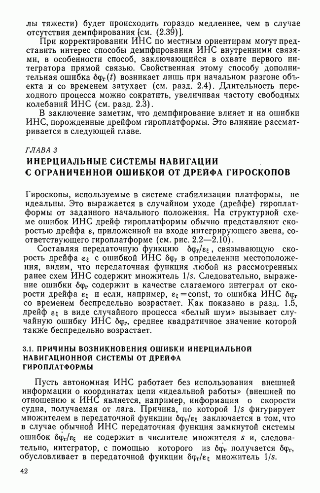 Пересчет этих скоростей на северную Достоинство предлагаемой схемы ИНС заключается в том, что дрейф ИНС, представленная на рис. 3.6., не испытывает возмущений при любом движении объекта по поверхности Земли и, если объект не имеет вертикальных ускорений, ее можно считать автономной. Как уже отмечалось, вертикальные ускорения в показаниях акселерометра Недостаток этой схемы по сравнению с классической автономной ИНС заключается в том, что она уже не обладает адаптирующими свойствами в отношении смещений в показаниях акселерометров. Смещения вызывают ошибку в вычисленных значениях