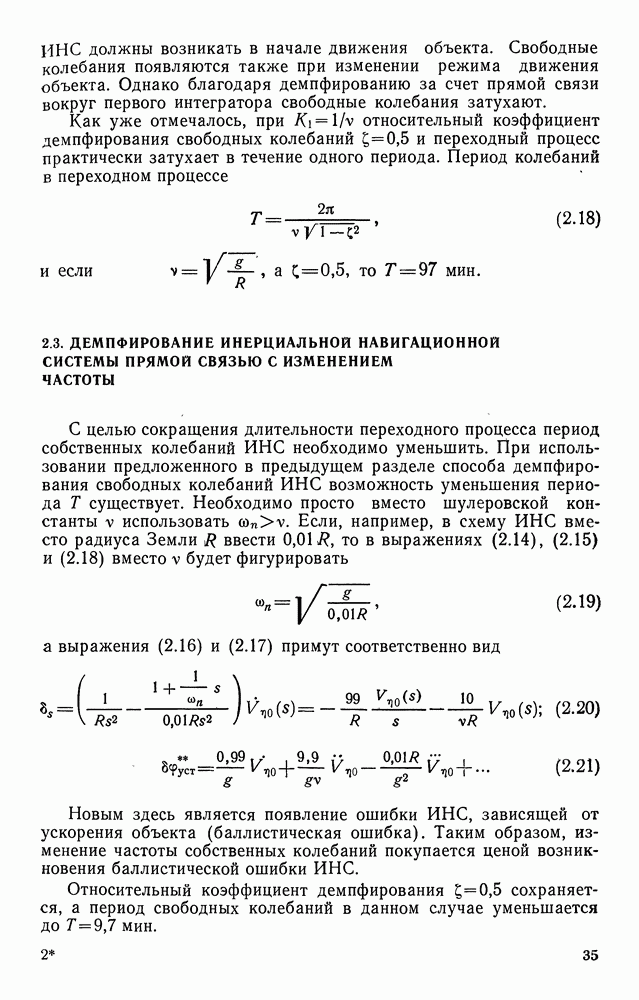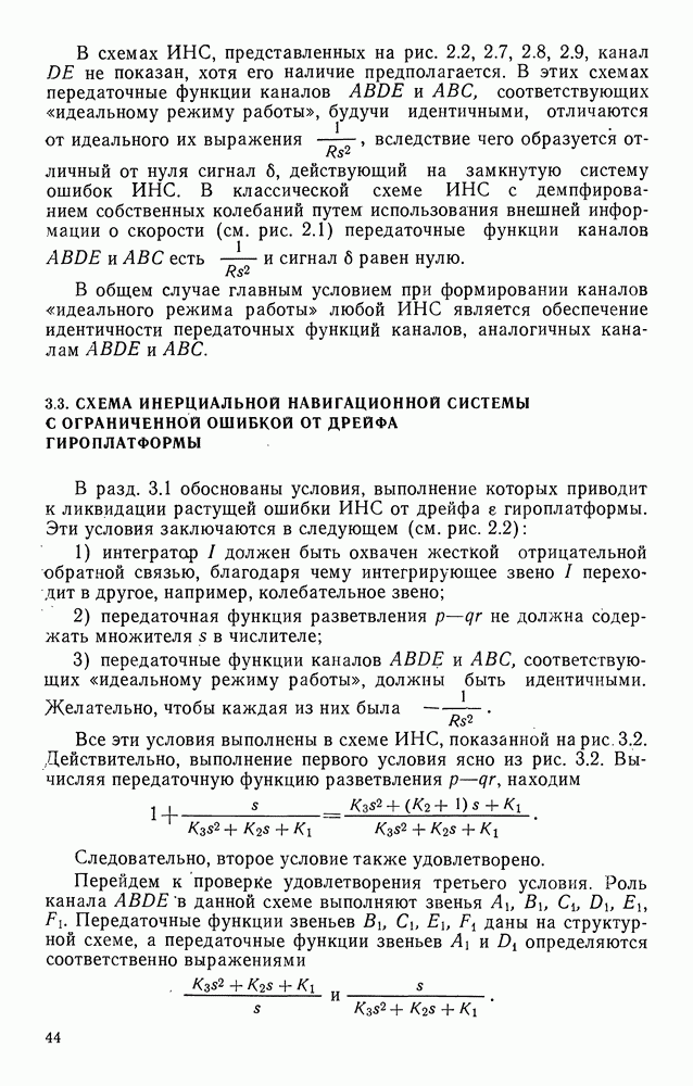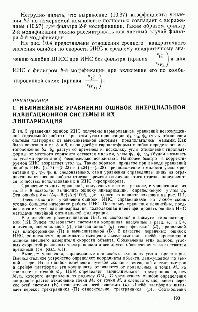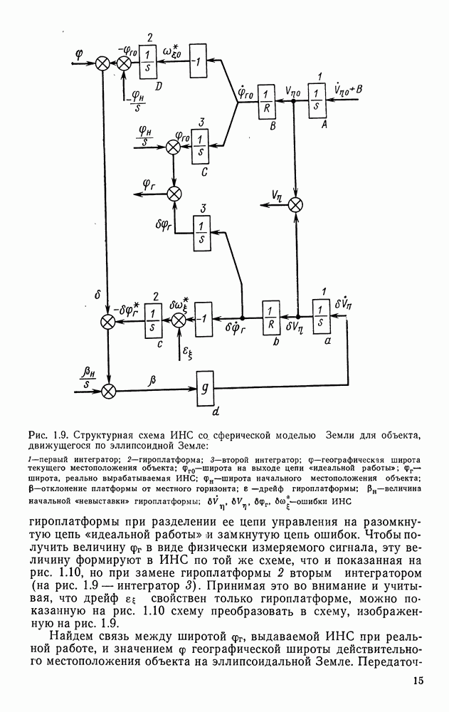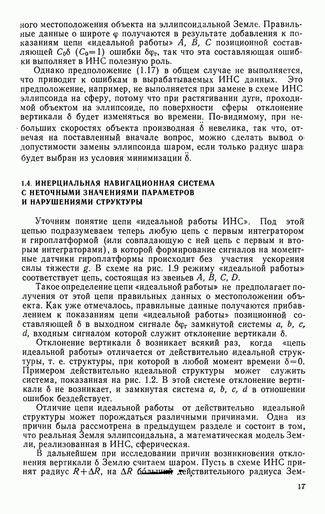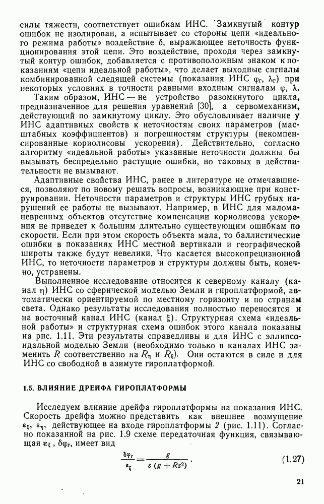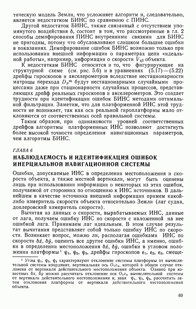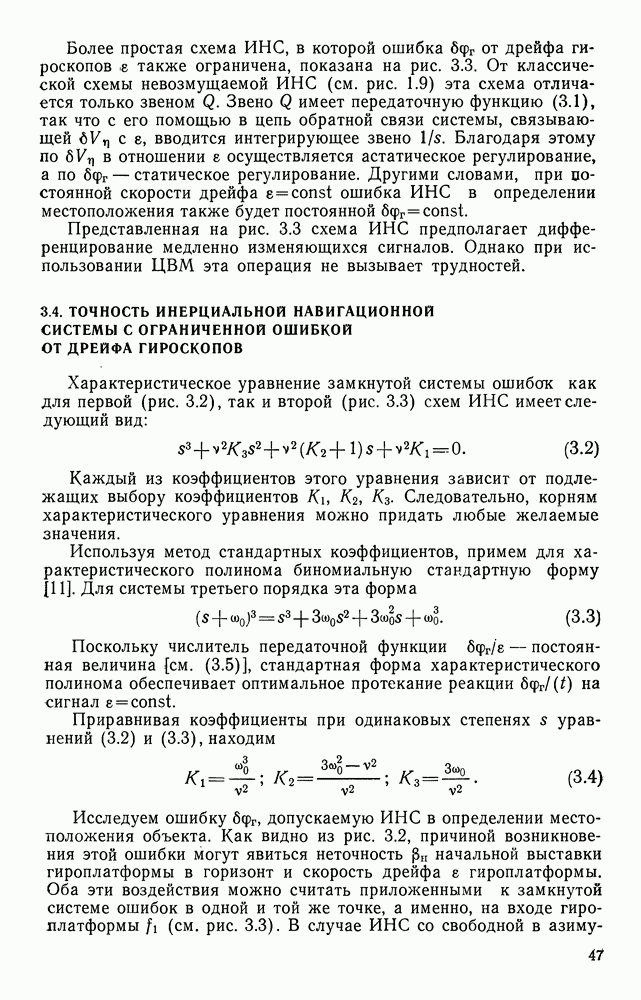 Пересчет этих скоростей на северную Достоинство предлагаемой схемы ИНС заключается в том, что дрейф ИНС, представленная на рис. 3.6., не испытывает возмущений при любом движении объекта по поверхности Земли и, если объект не имеет вертикальных ускорений, ее можно считать автономной. Как уже отмечалось, вертикальные ускорения в показаниях акселерометра Недостаток этой схемы по сравнению с классической автономной ИНС заключается в том, что она уже не обладает адаптирующими свойствами в отношении смещений в показаниях акселерометров. Смещения вызывают ошибку в вычисленных значениях
