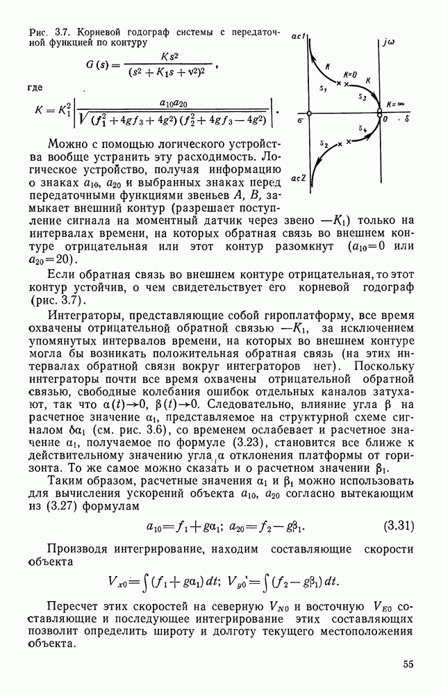 Можно с помощью логического устройства вообще устранить эту расходимость. Логическое устройство, получая информацию о знаках Если обратная связь во внешнем контуре отрицательная, то этот контур устойчив, о чем свидетельствует его корневой годограф (рис. 3.7). Интеграторы, представляющие собой гироплатформу, все время охвачены отрицательной обратной связью Таким образом, расчетные значения