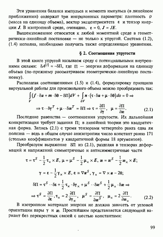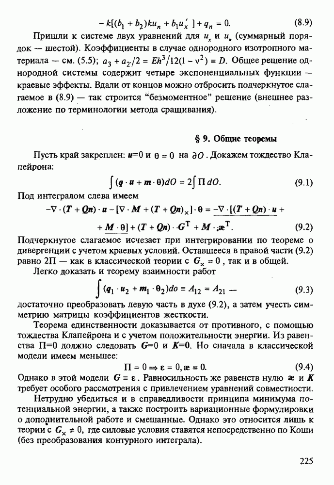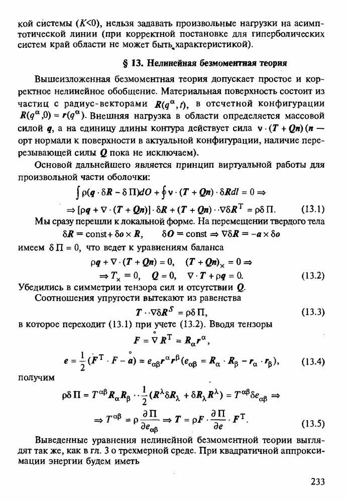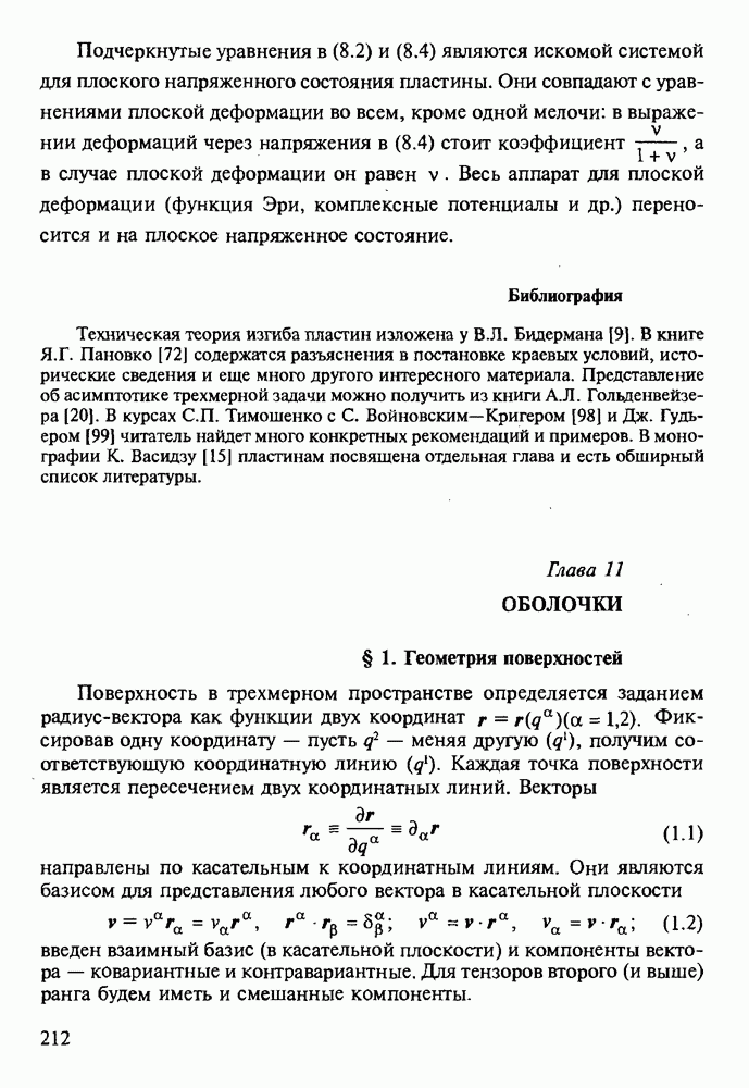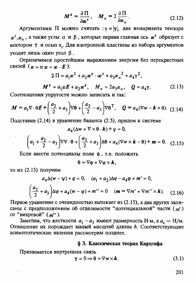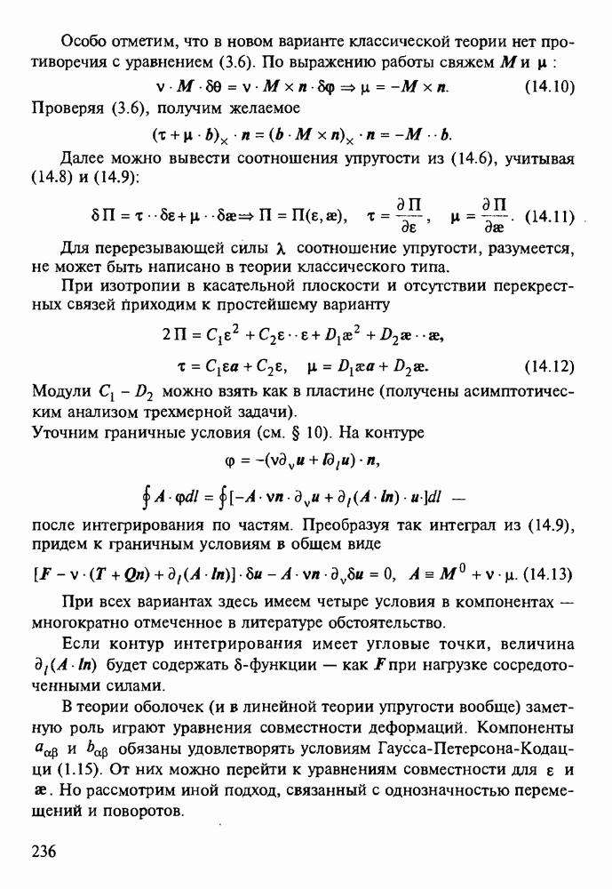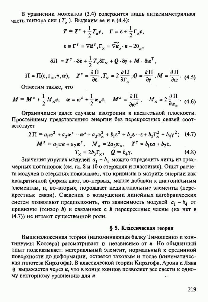 можно определить лишь из трехмерных постановок (см. гл. 8 и 10 о стержнях и пластинах). Опыт расчета модулей в стержнях показывает, что кривизна в матрице энергии как квадратичной формы дает, во-первых, малые добавки к диагональным элементам, и, во-вторых, порождает недиагональные элементы (перекрестные связи). Сведения о возмущении линейных алгебраических систем позволяют предположить, что зависимость модулей