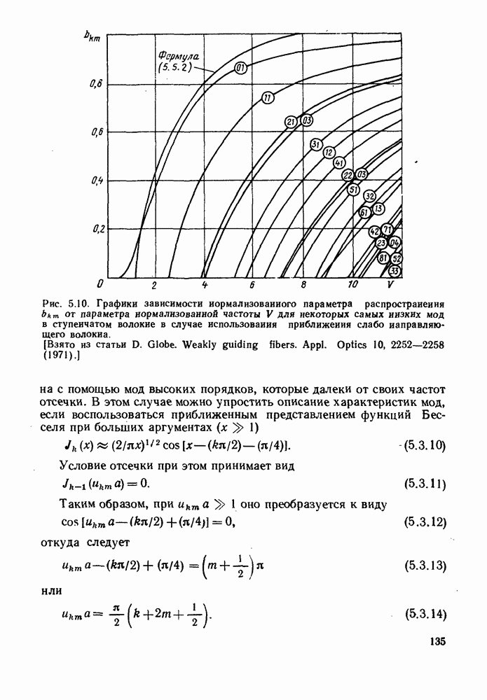 Рис. 5.10. Графики зависимости нормализованного параметра распространения волокна с помощью мод высоких порядков, которые далеки от своих частот отсечки. В этом случае можно упростить описание характеристик мод, если воспользоваться приближенным представлением функций Бесселя при больших аргументах