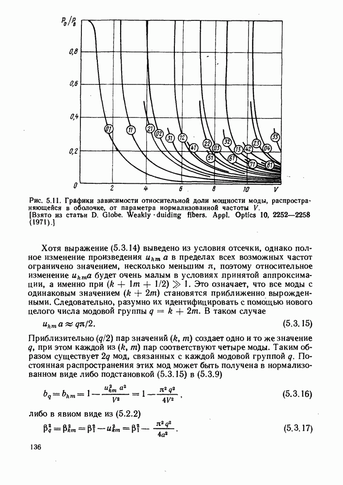 Рис. 5.11. Графики зависимости относительной доли мощности моды, распространяющейся в оболочке, от параметра нормализованной частоты Хотя выражение (5.3.14) выведено из условия отсечки, однако полное изменение произведения