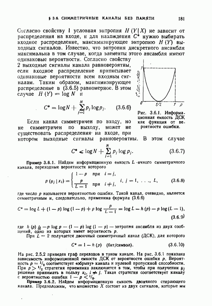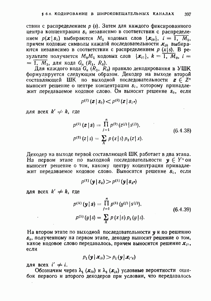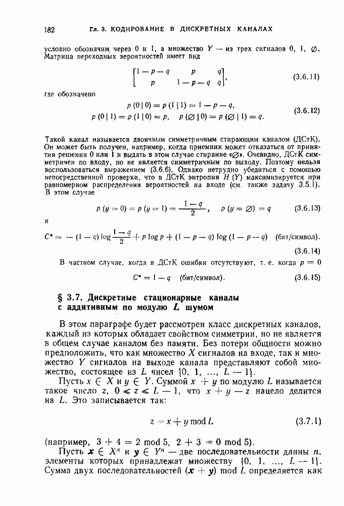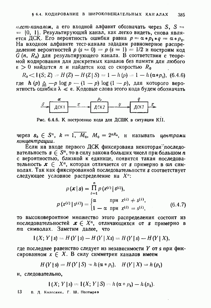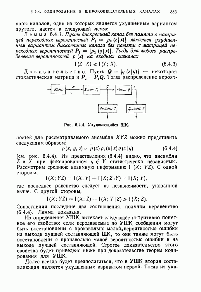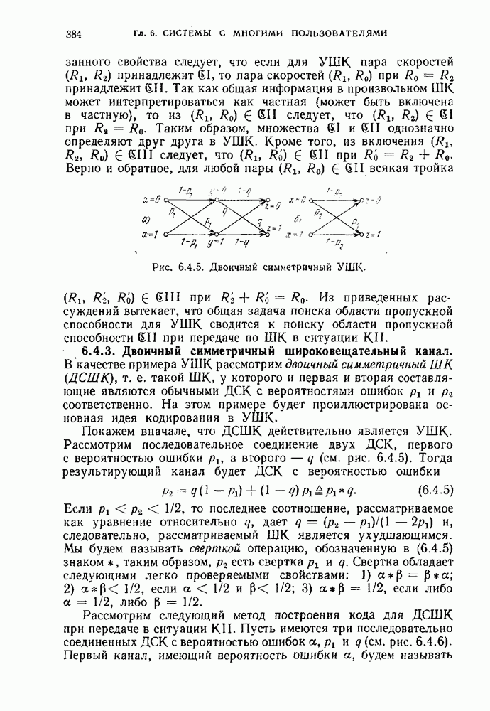 6.4.3. Двоичный симметричный широковещательный канал.В качестве примера ШК рассмотрим двоичный симметричный Покажем вначале, что ДСШК действительно является УШК. Рассмотрим последовательное соединение двух ДСК, первого с вероятностью ошибки