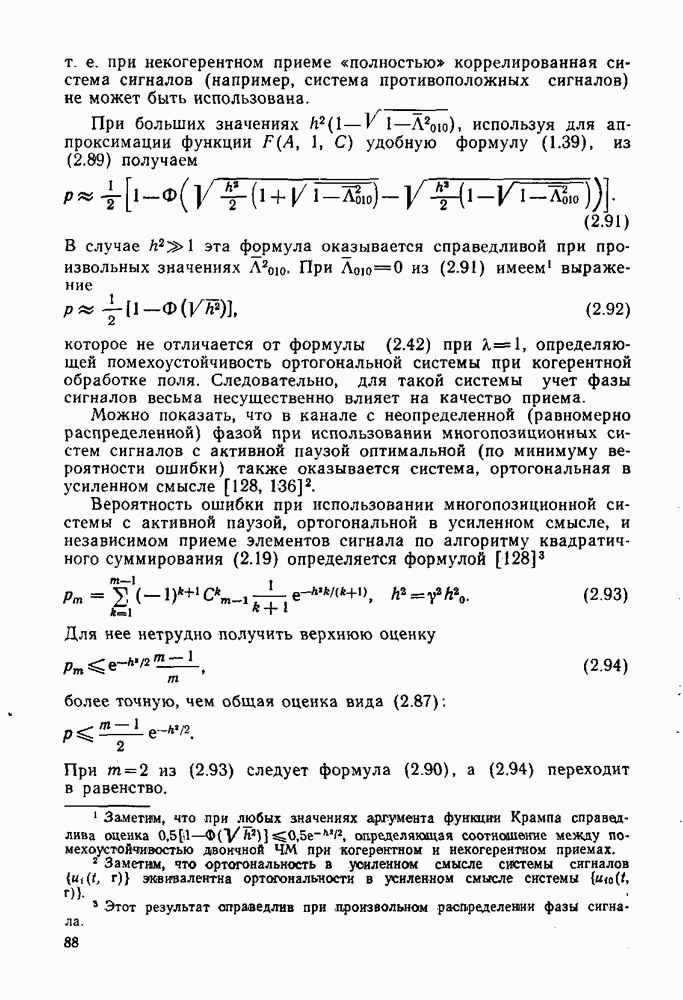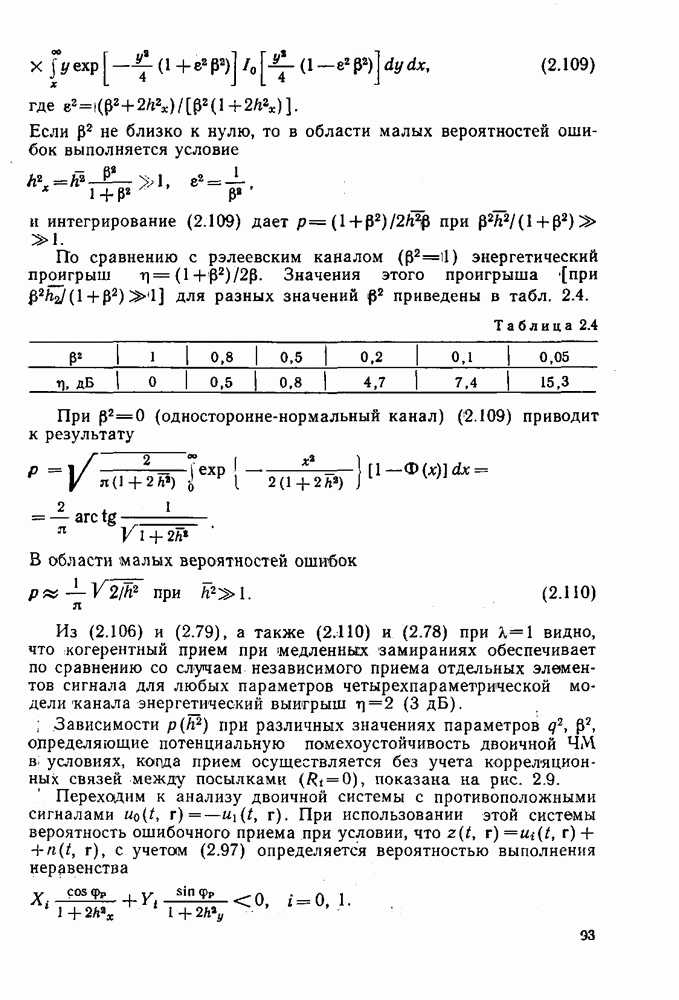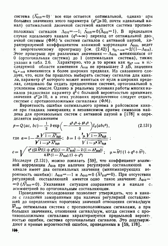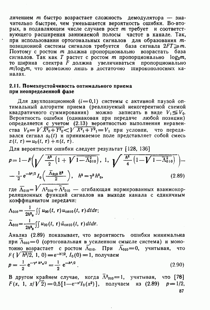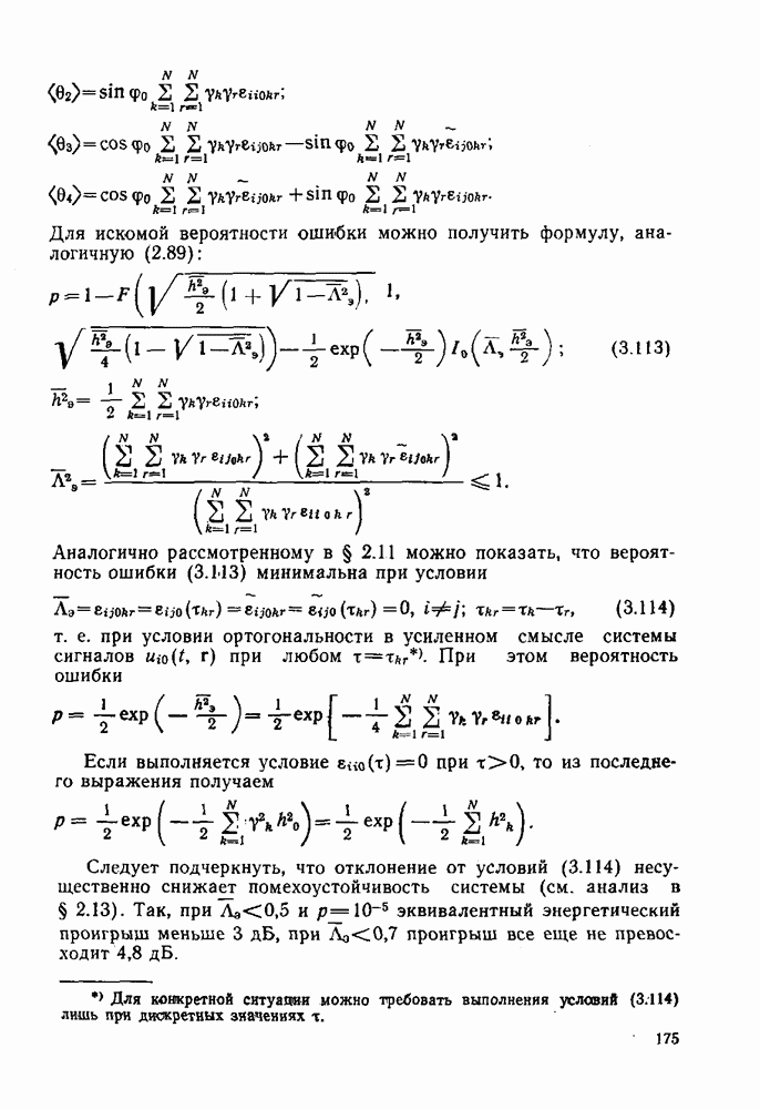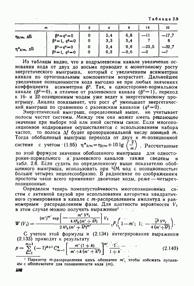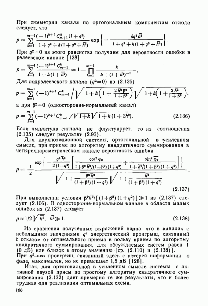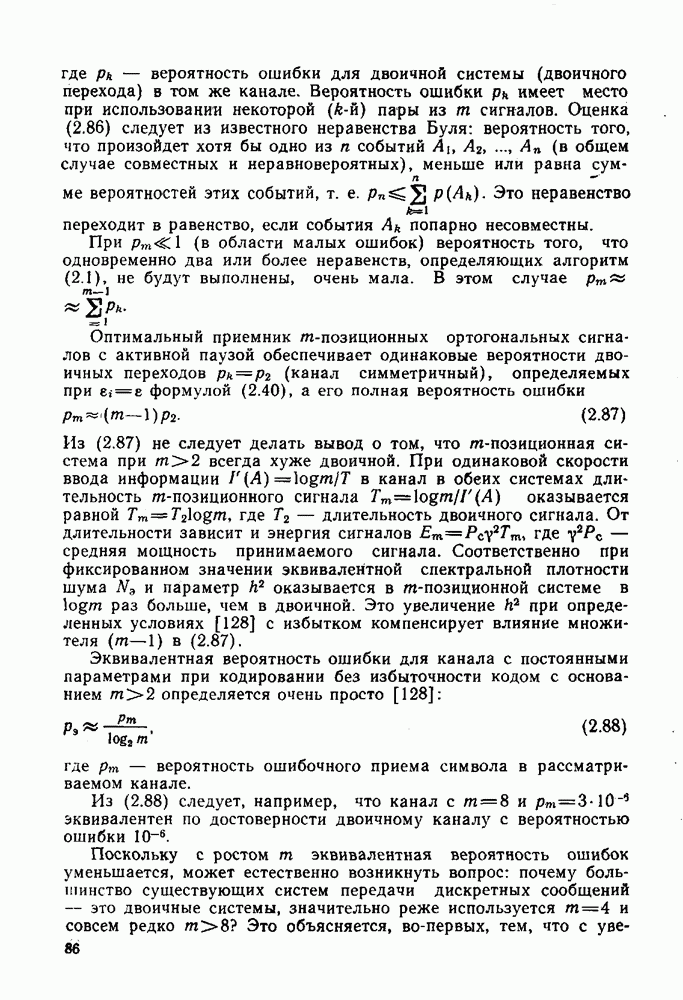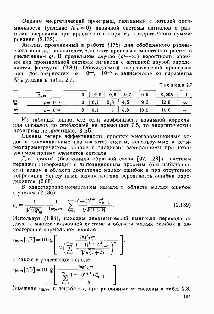 Из сравнения полученных выражений видно, что в каналах с небольшими значениями При Итак, для ортогональной в усиленном смысле системы с активной паузой прием по простому алгоритму квадратичного суммирования (2.132) дает примерно те же результаты, что и более трудная для реализации оптимальная схема. Оценим энергетический проигрыш, связанный с потерей оптимальности (условие Анализ, проведенный в работе [176] для обобщенного рэлеевского канала, показывает, что этот проигрыш монотонно растет с увеличением Таблица 2.7 (см. скан) Из таблицы видно, что если коэффициент взаимной корреляции сигналов по огибающей не превышает 0,5, то энергетический проигрыш не превышает Оценим теперь эффективность простых многопозиционных кодов и одноканальных (по частоте) систем, используемых в четырехпараметрическом канале с гладкими замираниями при независимом приеме элементов сигнала. Для прямой (без канала обратной связи [97, 128]) системы передачи информации с В односторонне-нормальном канале в области малых ошибок с учетом (2.136).