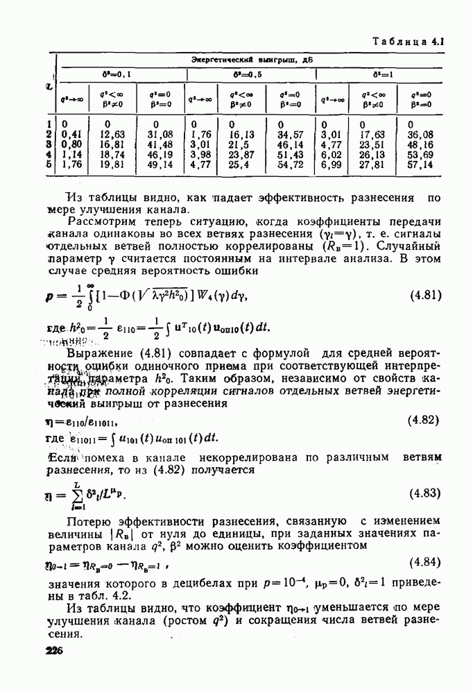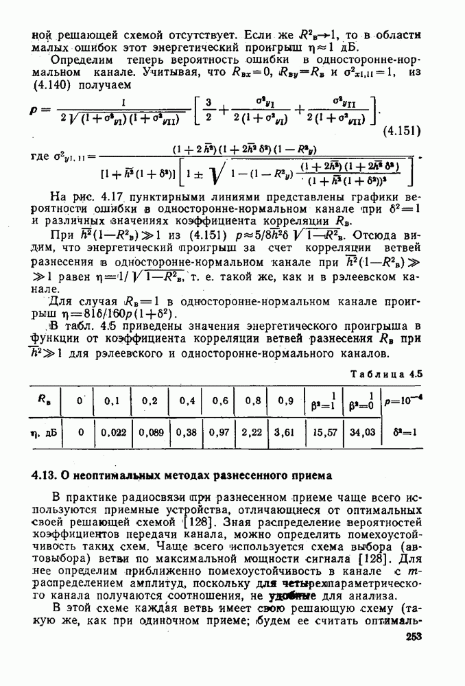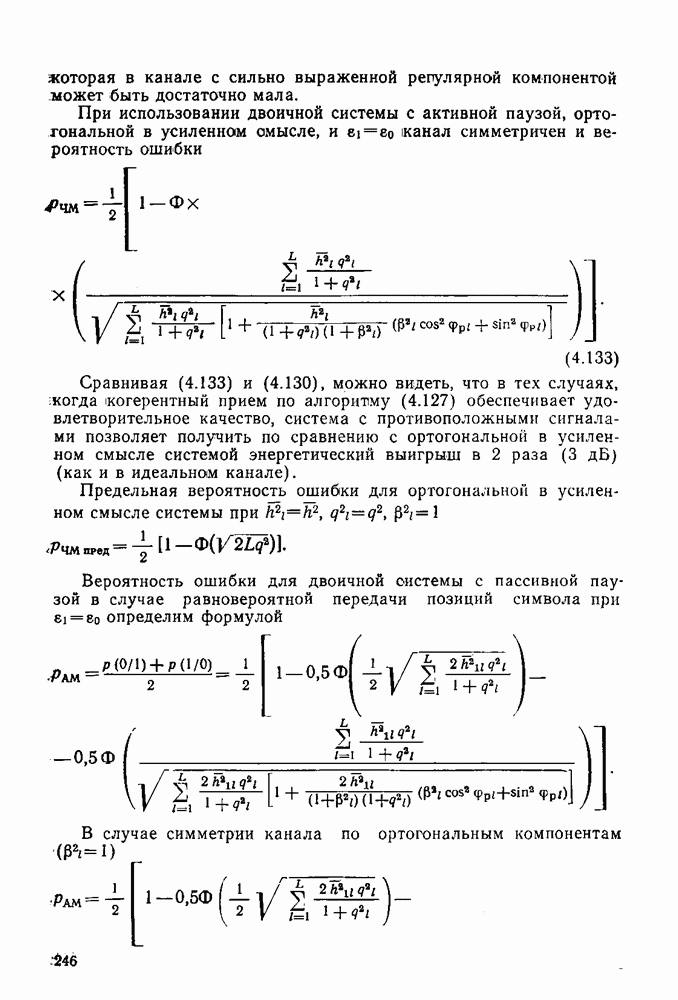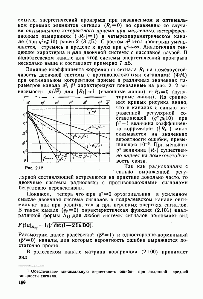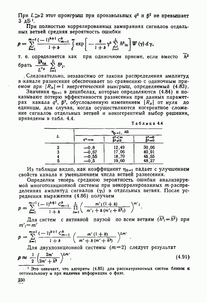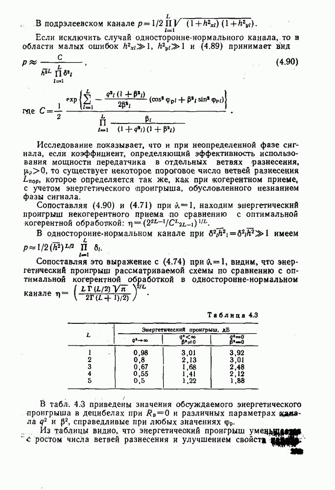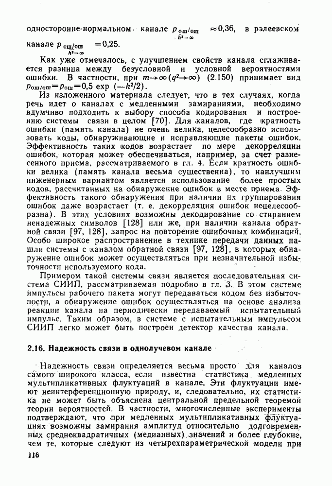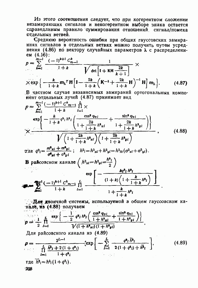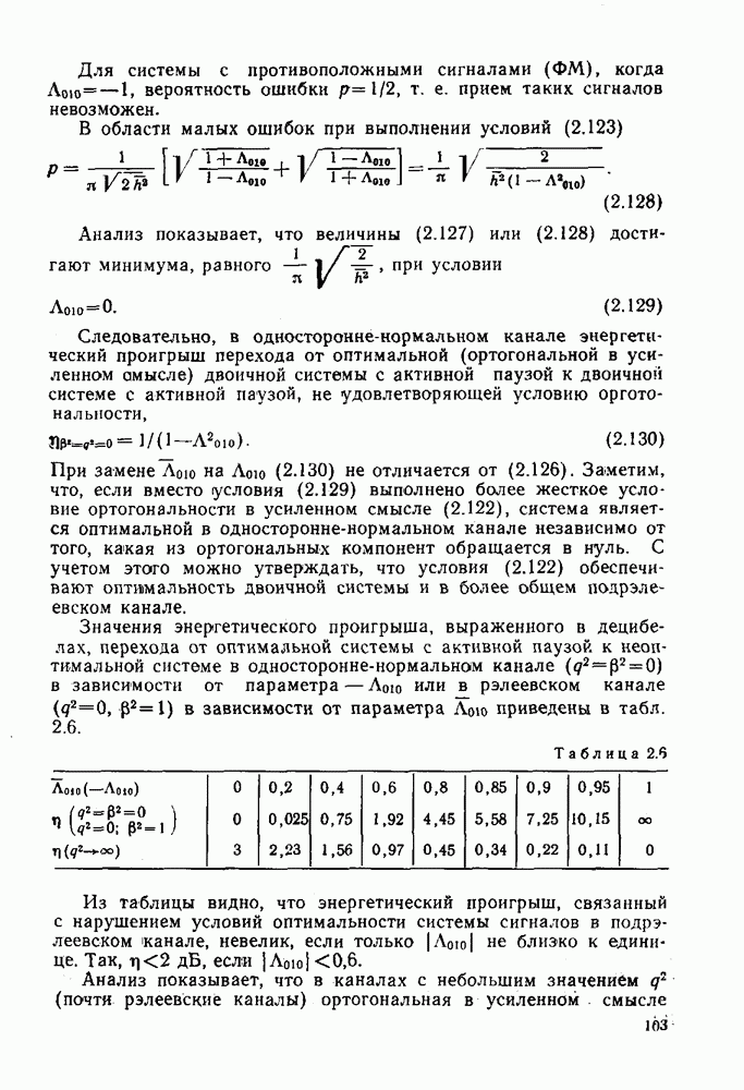 Из сравнения полученных выражений видно, что в каналах с небольшими значениями При Итак, для ортогональной в усиленном смысле системы с активной паузой прием по простому алгоритму квадратичного суммирования (2.132) дает примерно те же результаты, что и более трудная для реализации оптимальная схема. Оценим энергетический проигрыш, связанный с потерей оптимальности (условие Анализ, проведенный в работе [176] для обобщенного рэлеевского канала, показывает, что этот проигрыш монотонно растет с увеличением Таблица 2.7 (см. скан) Из таблицы видно, что если коэффициент взаимной корреляции сигналов по огибающей не превышает 0,5, то энергетический проигрыш не превышает Оценим теперь эффективность простых многопозиционных кодов и одноканальных (по частоте) систем, используемых в четырехпараметрическом канале с гладкими замираниями при независимом приеме элементов сигнала. Для прямой (без канала обратной связи [97, 128]) системы передачи информации с В односторонне-нормальном канале в области малых ошибок с учетом (2.136).